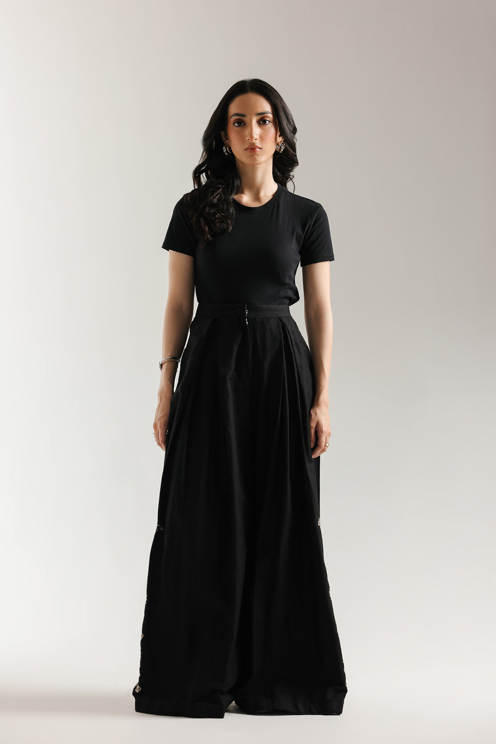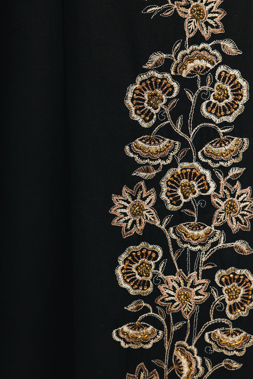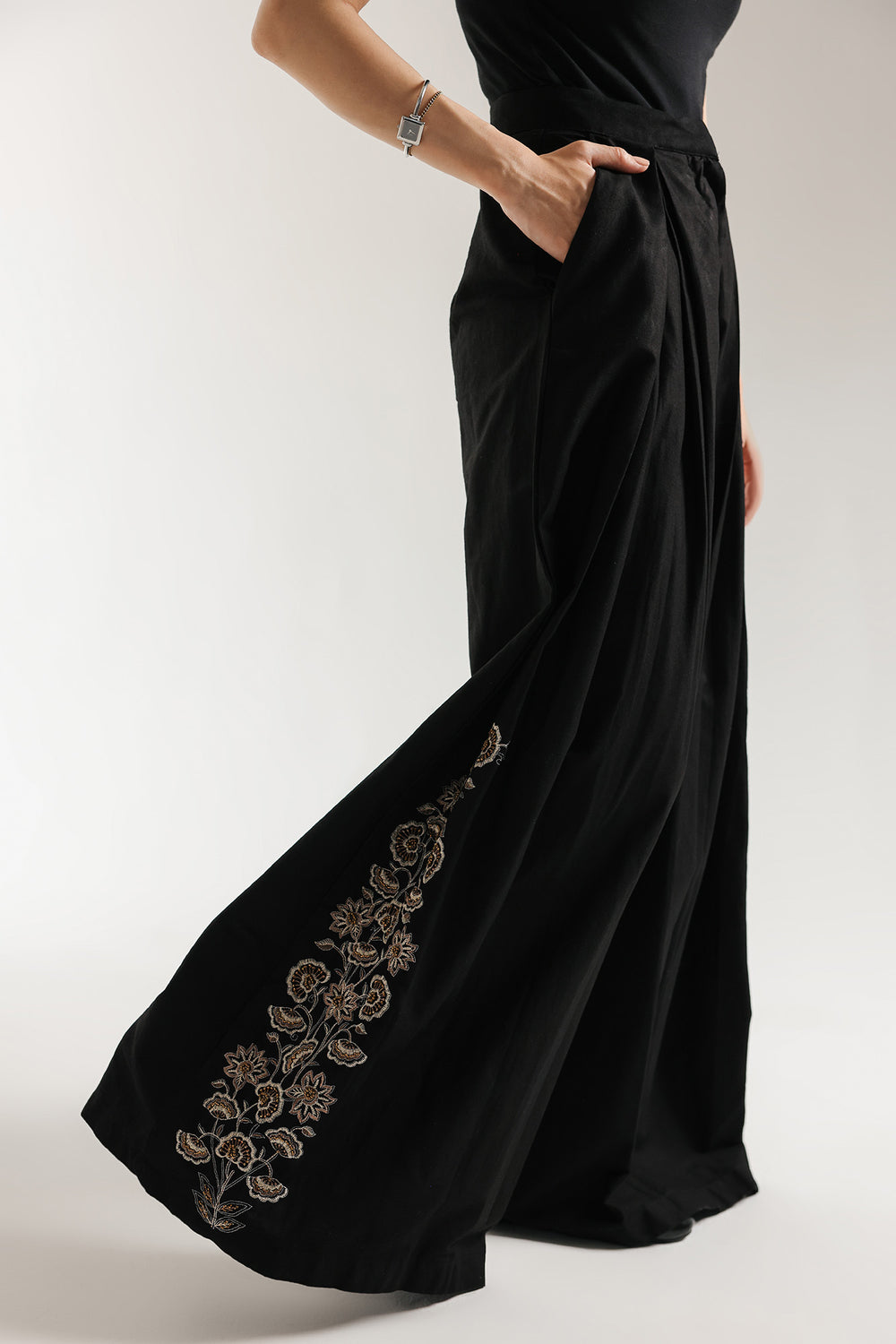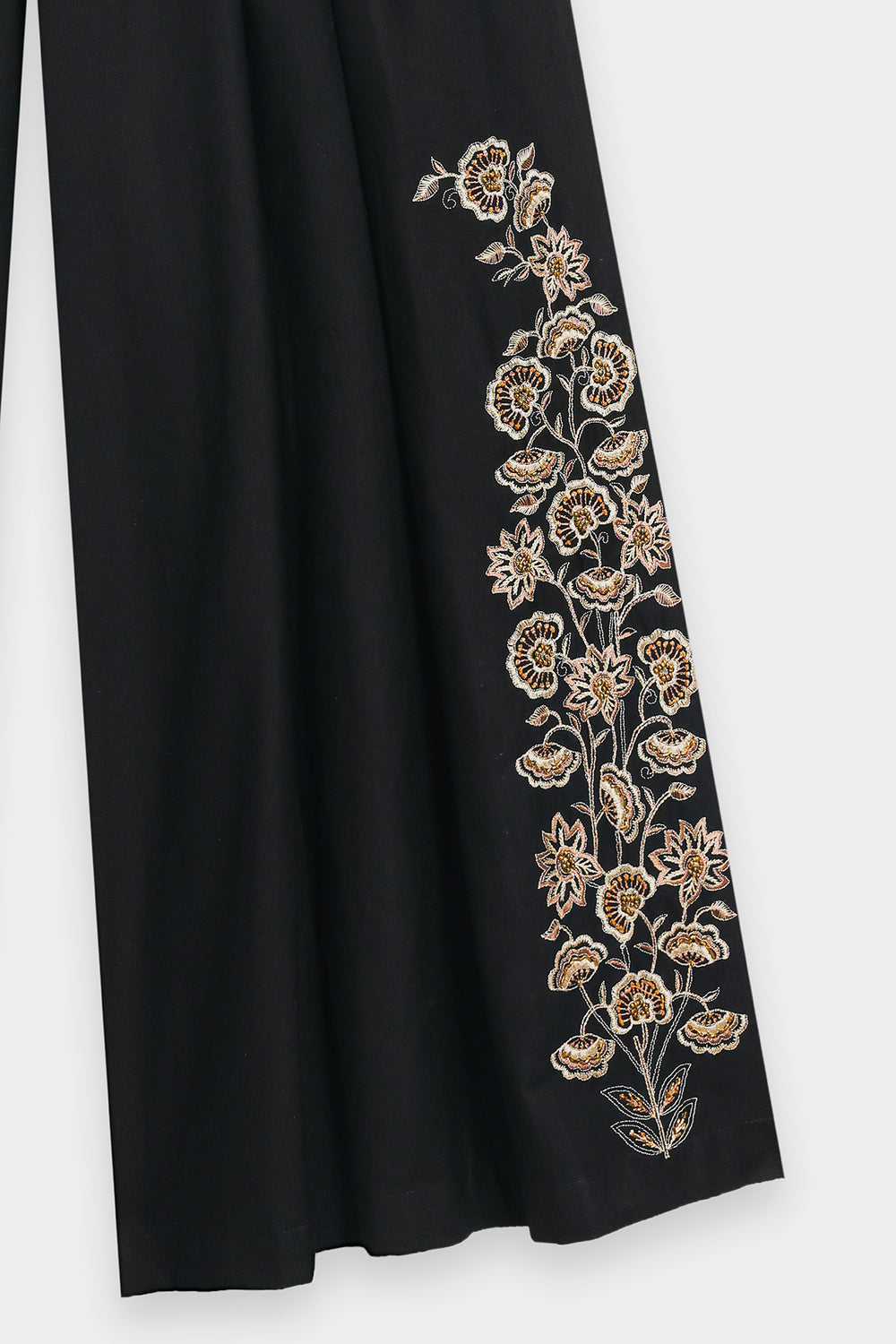 Add a touch of floral elegance to your wardrobe with these captivating pants. The deep black fabric offers a dramatic and versatile base for the beautiful embroidered floral motif that adorns the lower part of the leg. The wide-leg, full-length silhouette creates a flowing and modern look. These pants are designed to be a sophisticated statement piece, pairing effortlessly with any solid-colored top for an instantly chic and artistic ensemble.