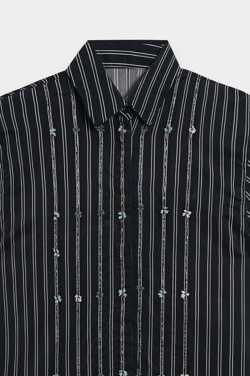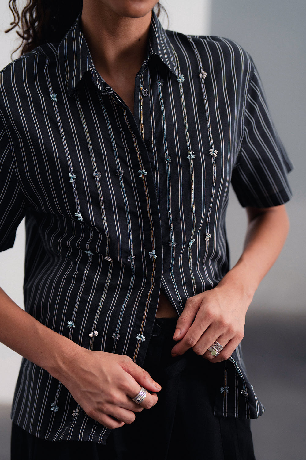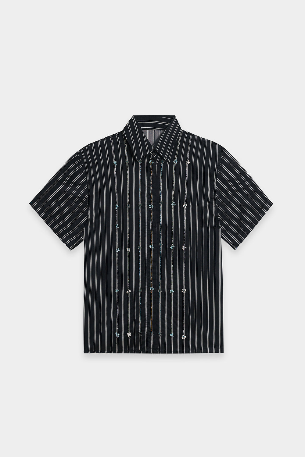 Discover the art of detail in this captivating short-sleeved shirt. It features subtle pinstripes with delicate, intricate embellishments woven into the pattern, adding a unique texture and visual interest. The button-down front and relaxed fit make it a versatile piece for effortless sophistication, perfect for both casual and elevated looks.