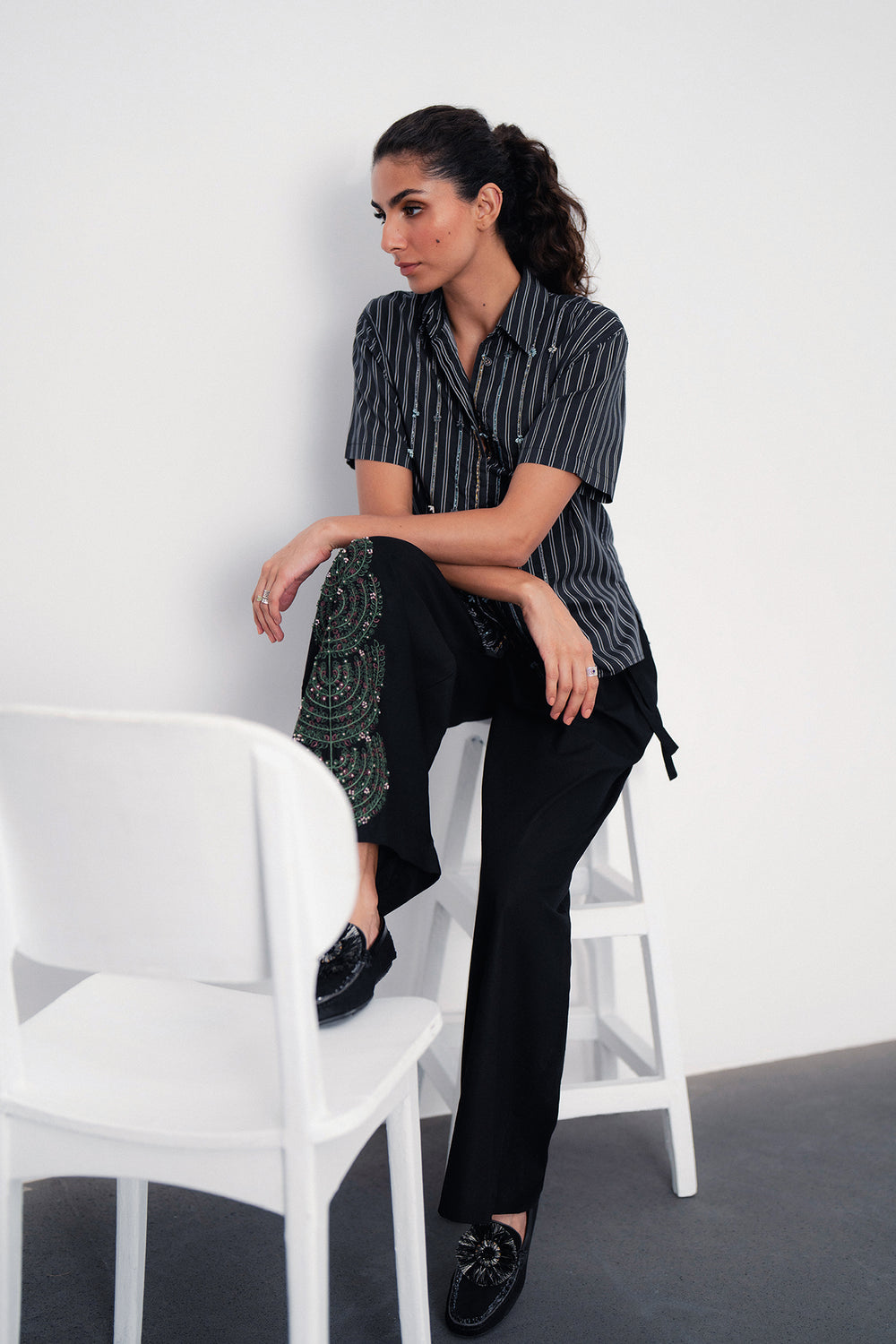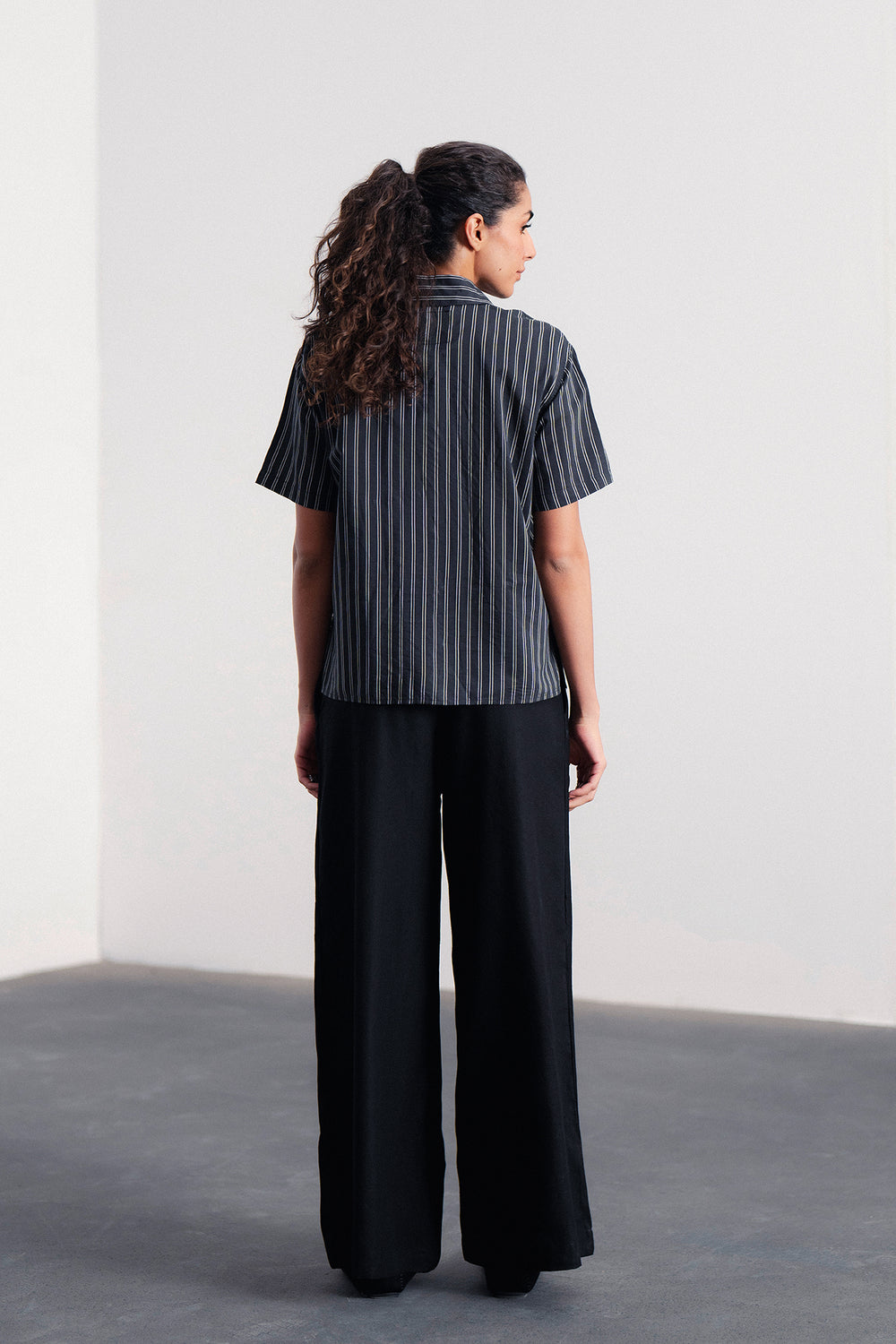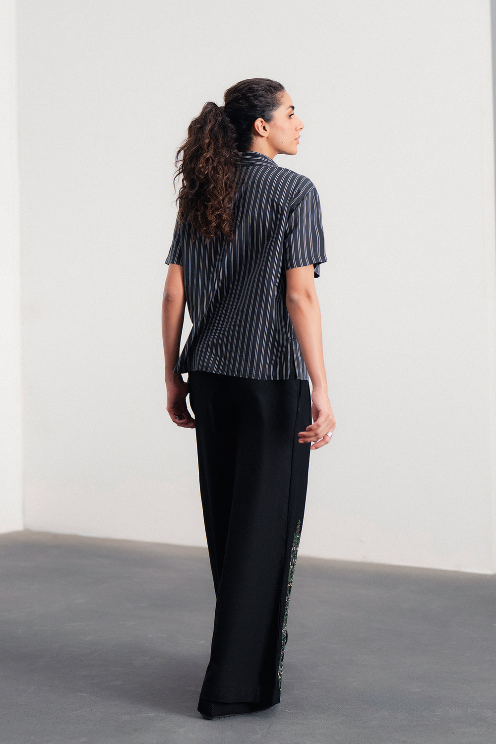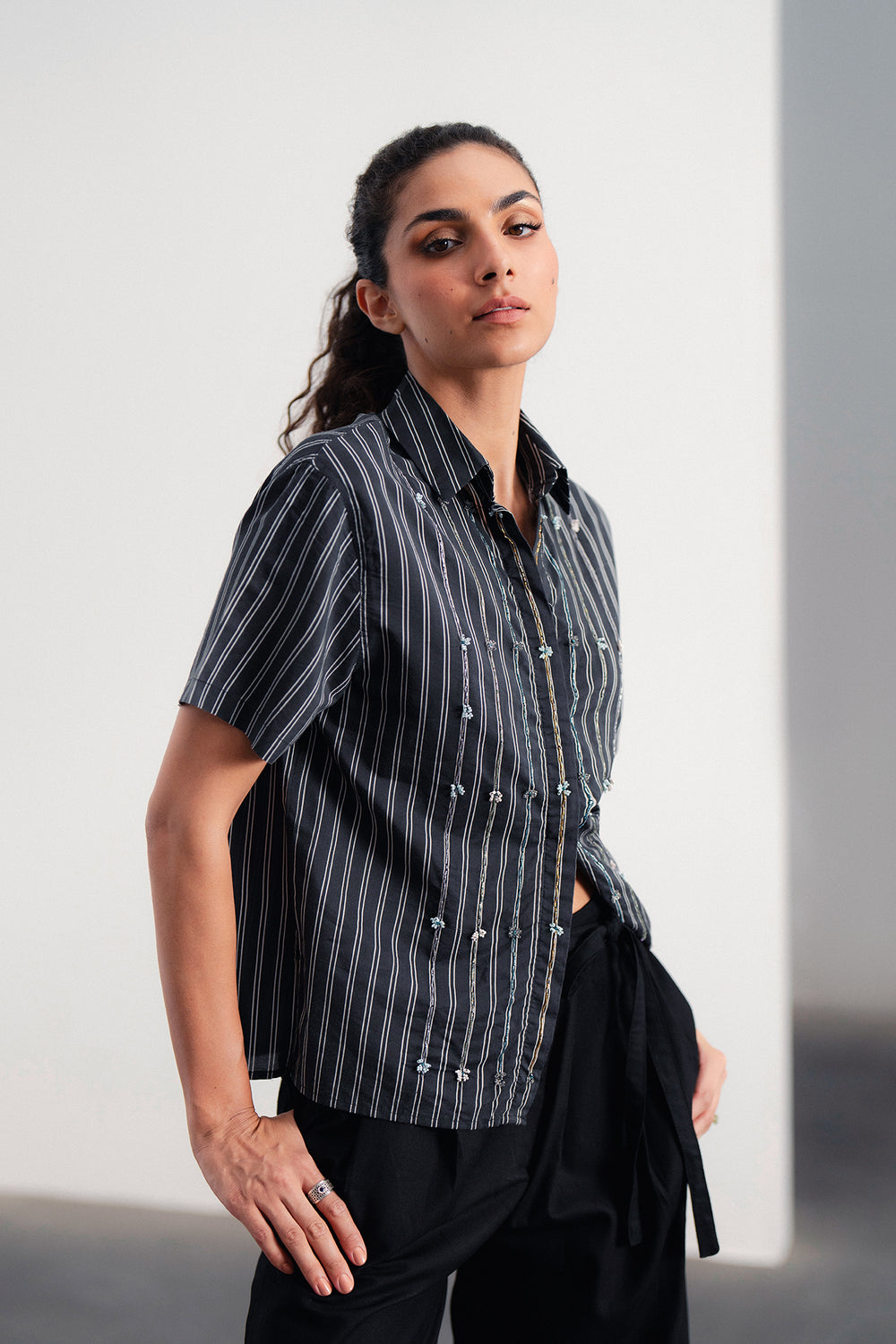 Discover the art of detail in this captivating short-sleeved shirt. It features subtle pinstripes with delicate, intricate embellishments woven into the pattern, adding a unique texture and visual interest. The button-down front and relaxed fit make it a versatile piece for effortless sophistication, perfect for both casual and elevated looks.