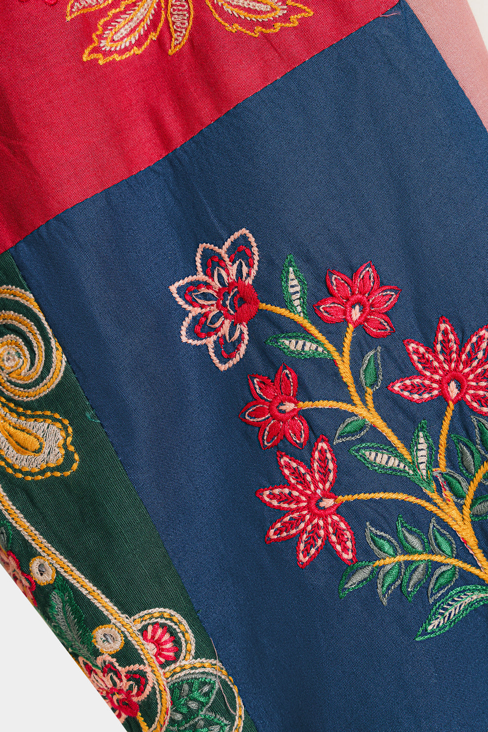 Channel eclectic, vibrant energy with this unique embroidered patchwork shirt. This short-cut shirt features a striking contrast, combining a solid emerald green bodice with voluminous patchwork sleeves. The classic collar and button-down front lend a tailored structure. The sleeves are adorned with colorful fabric panels and intricate floral and paisley embroidery in shades of pink, blue, yellow, and green, making each sleeve a wearable piece of art. This statement piece offers a modern fusion of classic style and rich, traditional textile motifs.