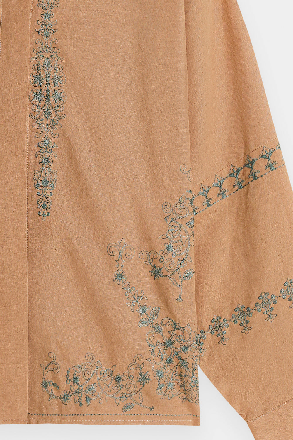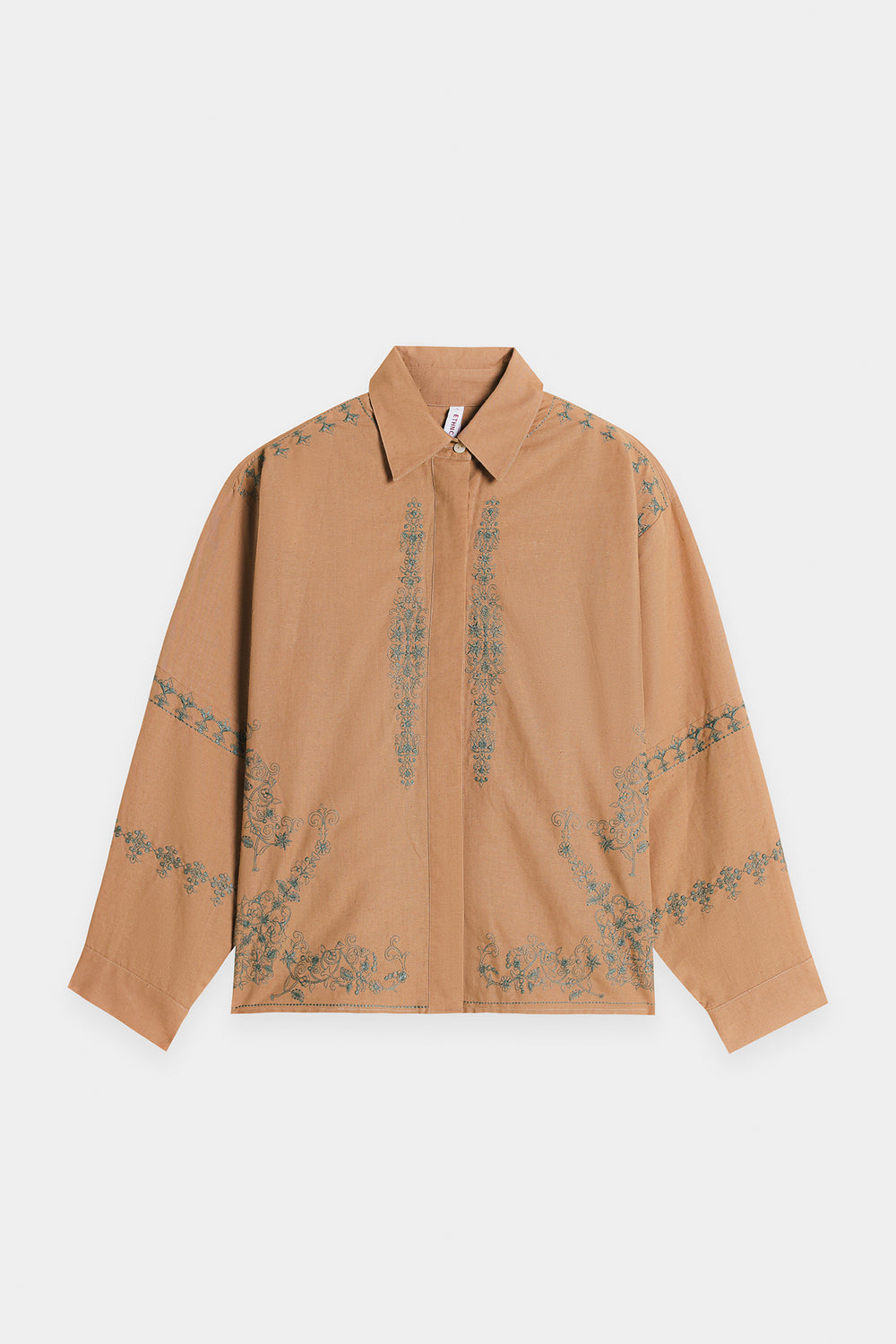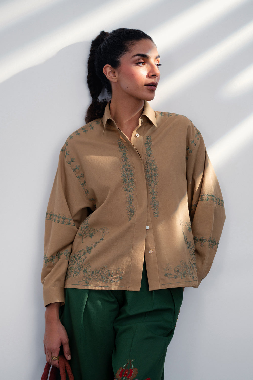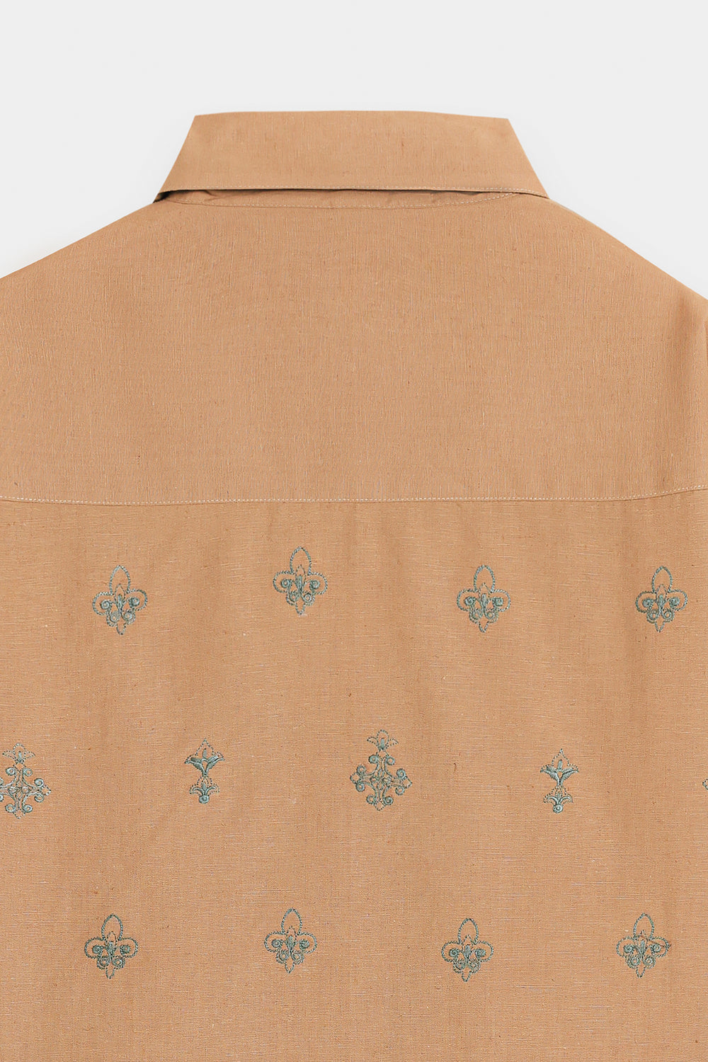 This elegantly embroidered shirt in a warm, earthy tone is a testament to refined style. The classic long-sleeved, button-down silhouette is subtly elevated by delicate floral embroidery that frames the shoulders, chest, and cuffs. This understated yet sophisticated design makes it a versatile piece, perfect for adding a touch of subtle artistry to any ensemble.