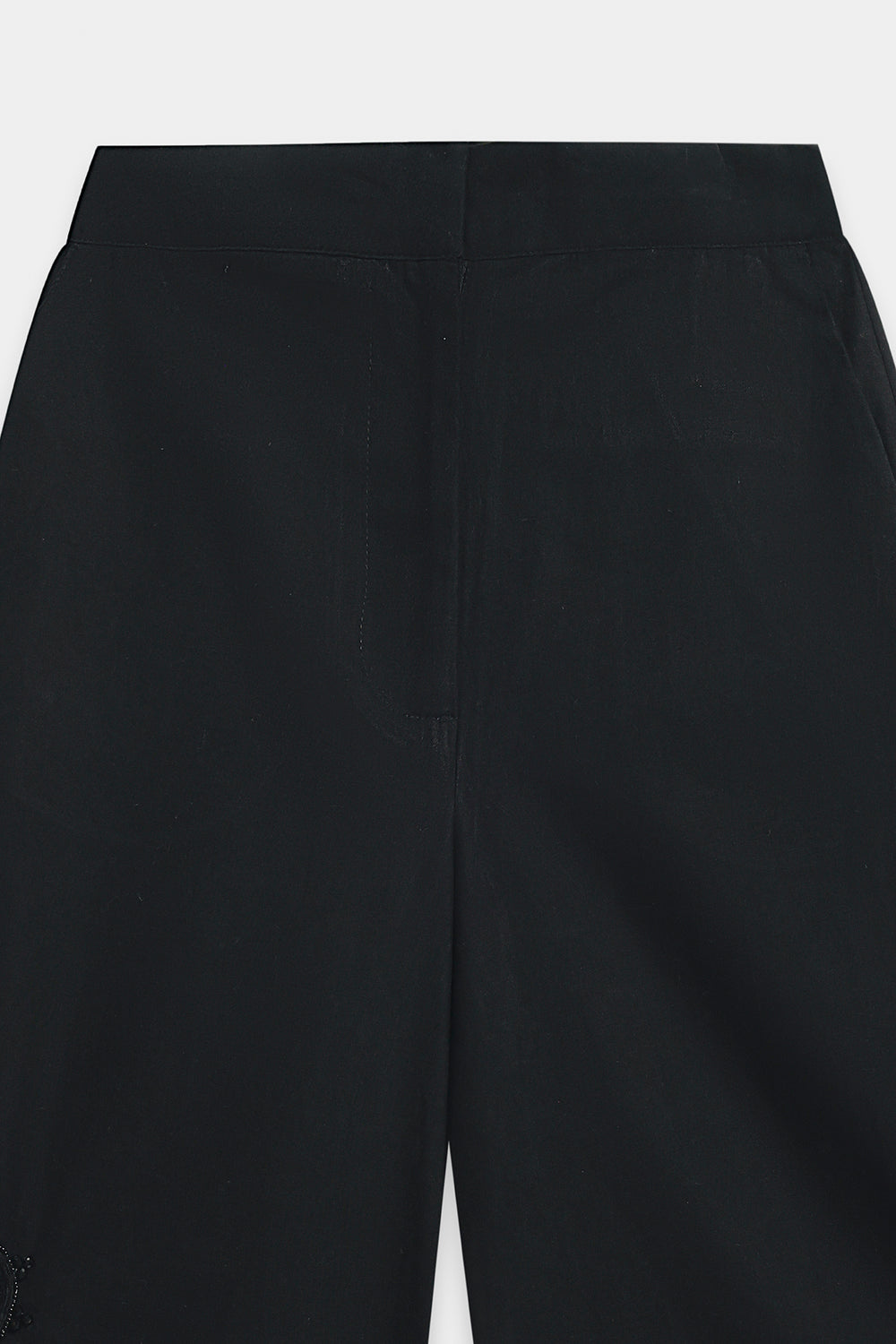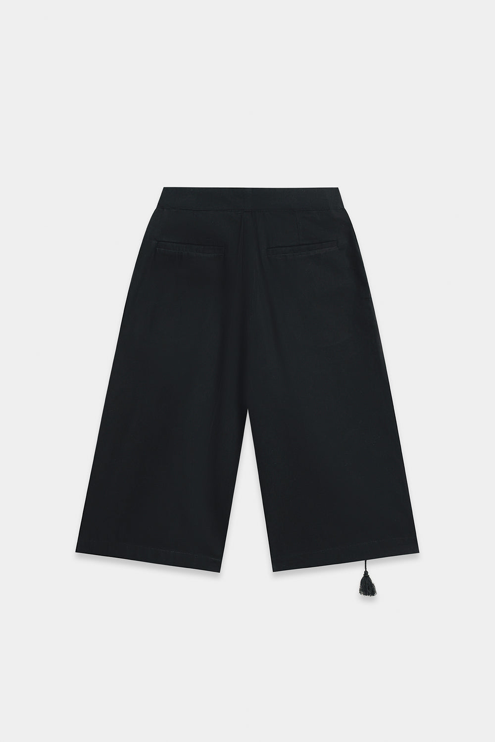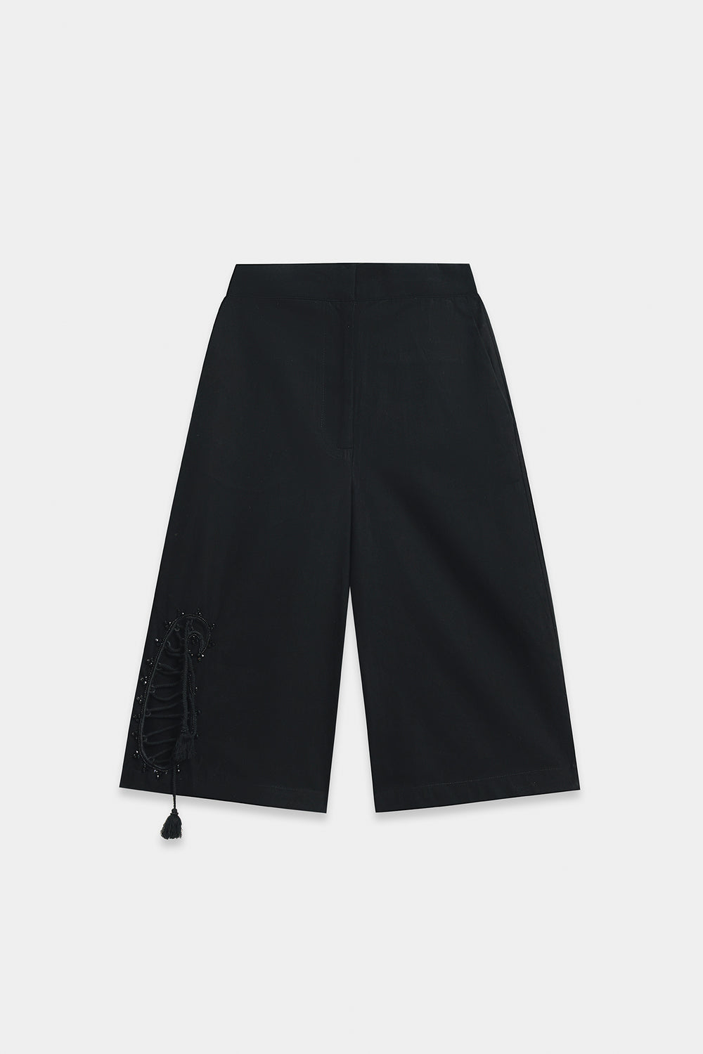 Inject a touch of playful chic into your look with these elegant shorts. Crafted in versatile black, these culotte-style shorts feature a sophisticated, high-waisted silhouette that falls to a cropped length. A subtle, intricate tassel detail on the side adds a unique and feminine flourish, turning a simple piece into a statement. These shorts are perfect for pairing with a fitted top for a contemporary and polished casual ensemble.