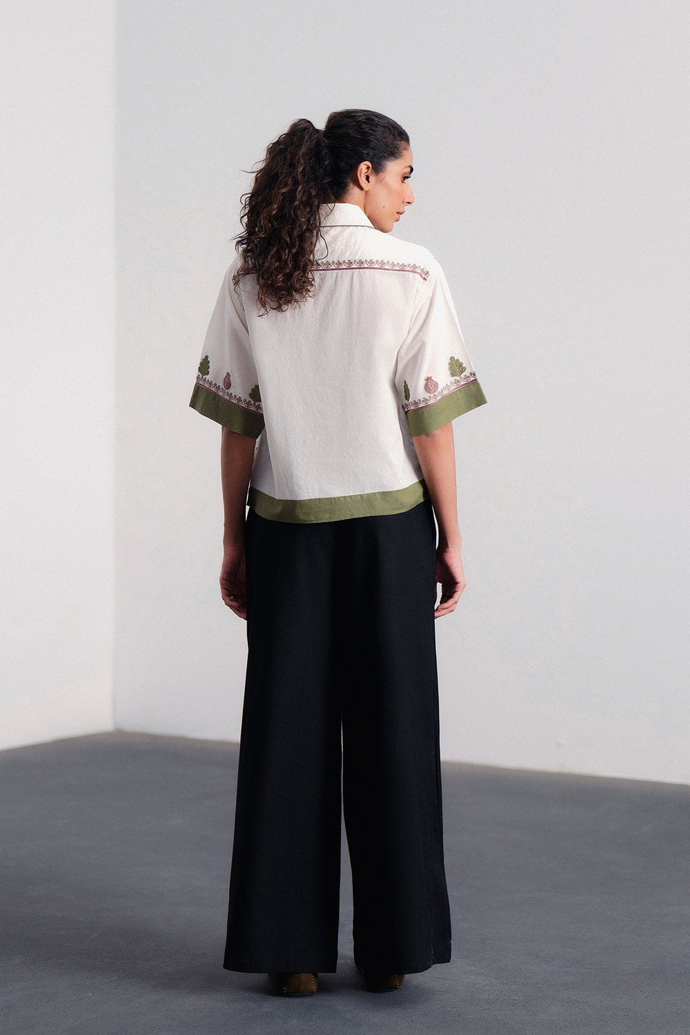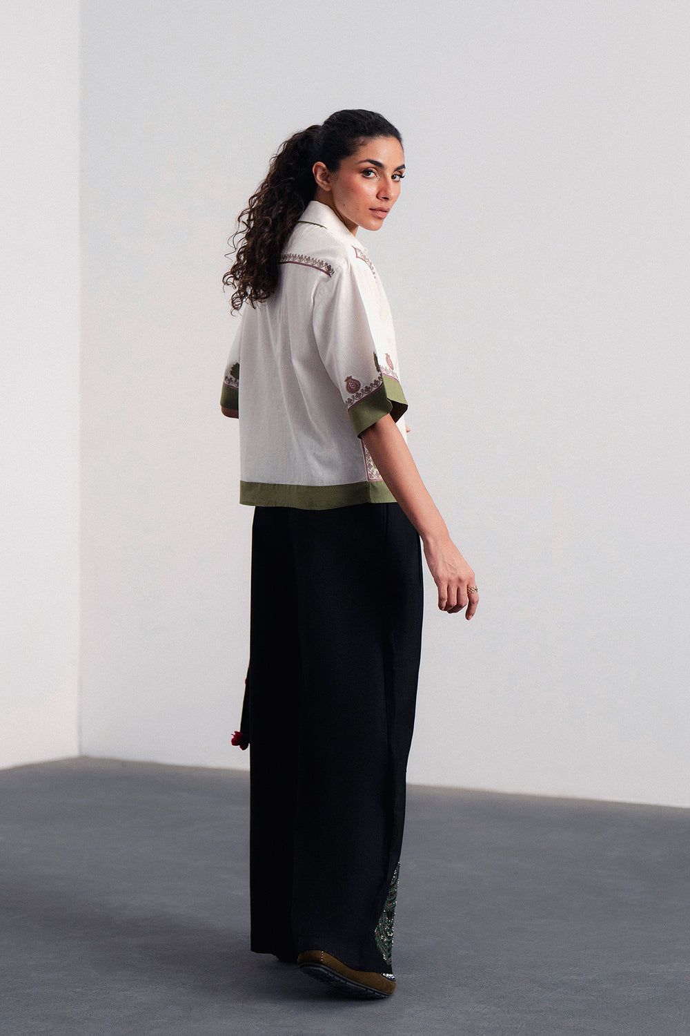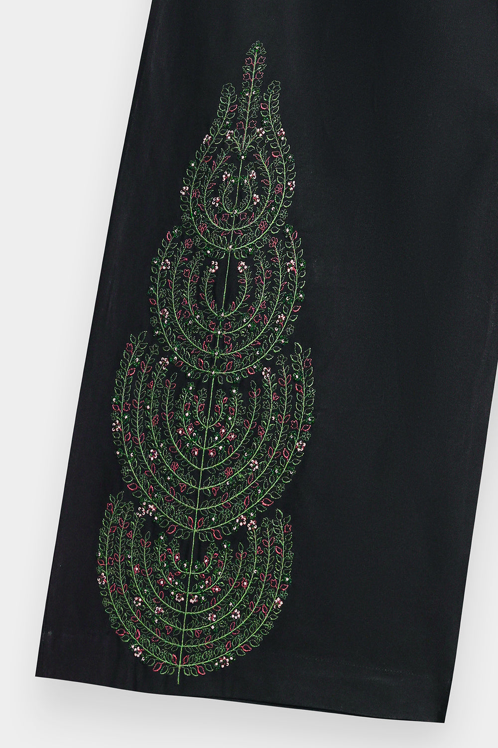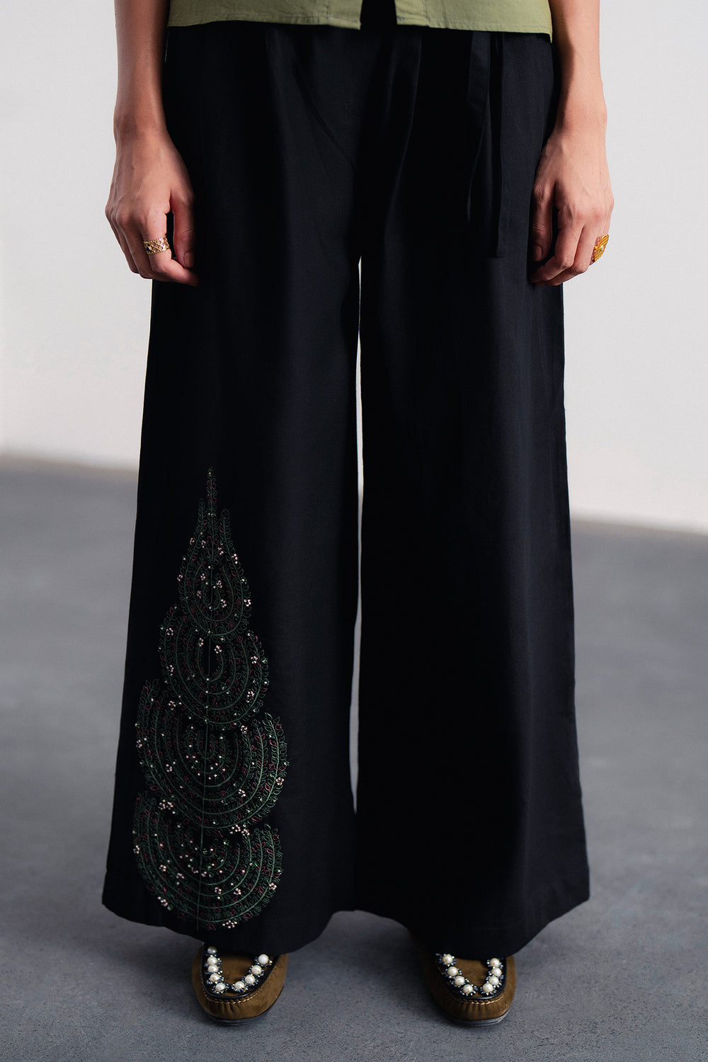 A flowing silhouette meets intricate craftsmanship in these stunning trousers. The wide-leg design in a classic black hue offers a relaxed yet elegant drape. Adorning the lower leg is a breathtaking, detailed embroidery, creating a sense of artistic luxury. This piece is perfect for adding a touch of sophisticated drama to any ensemble.