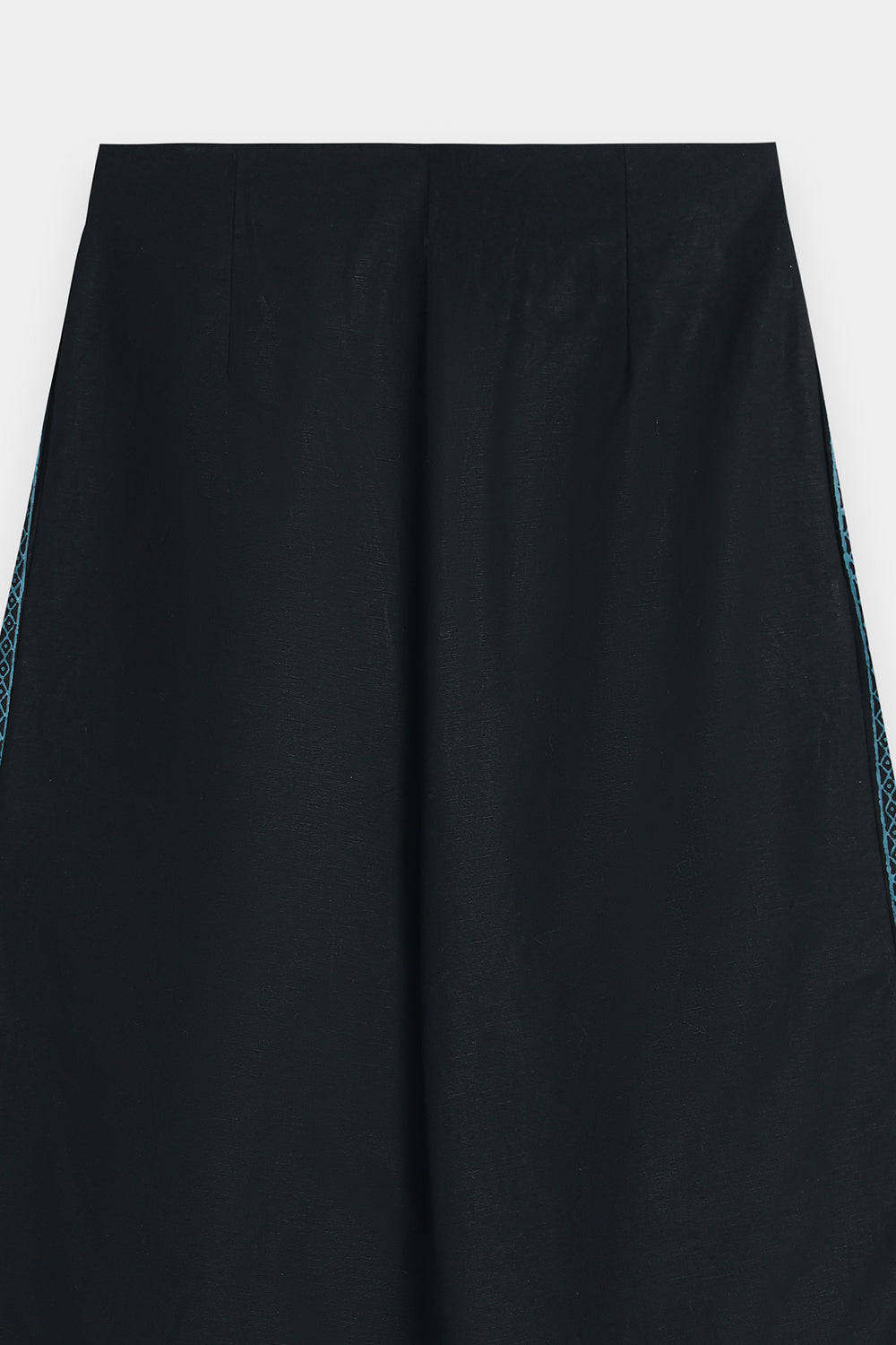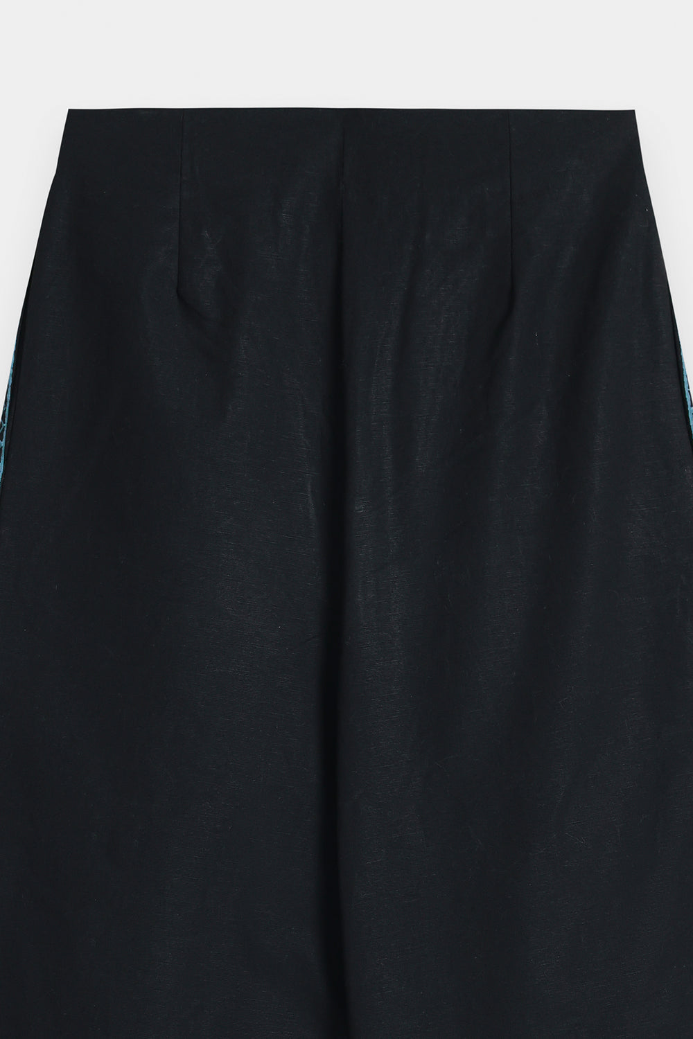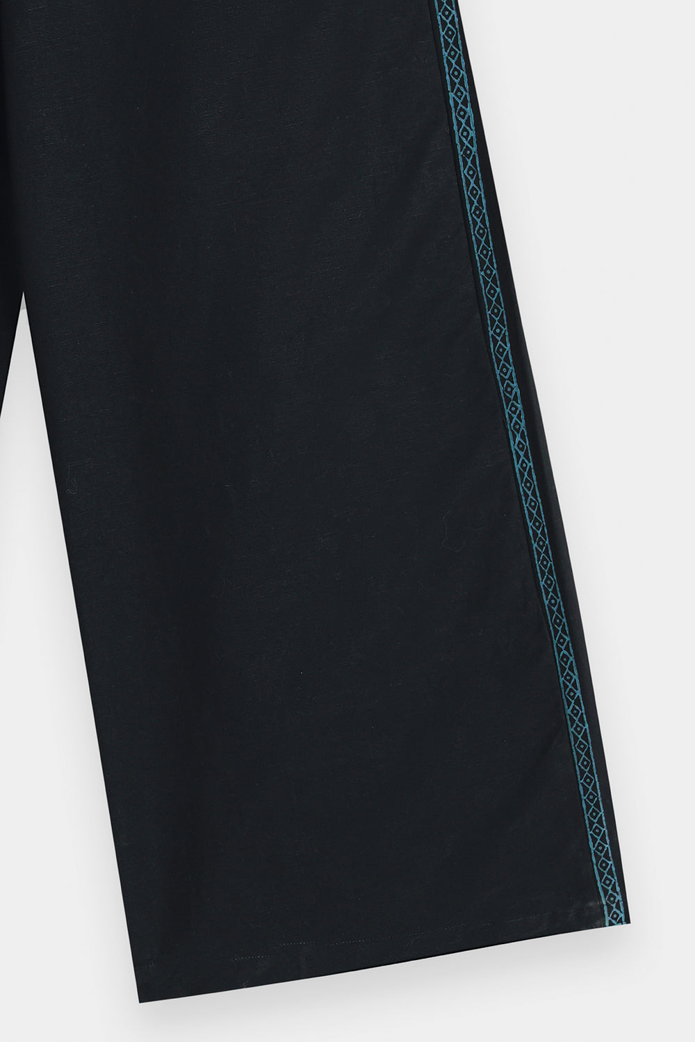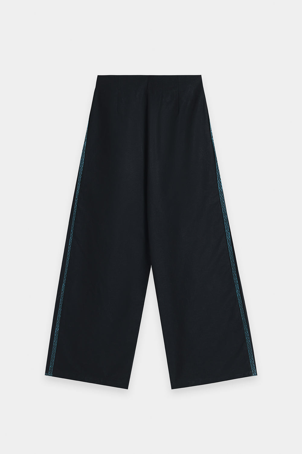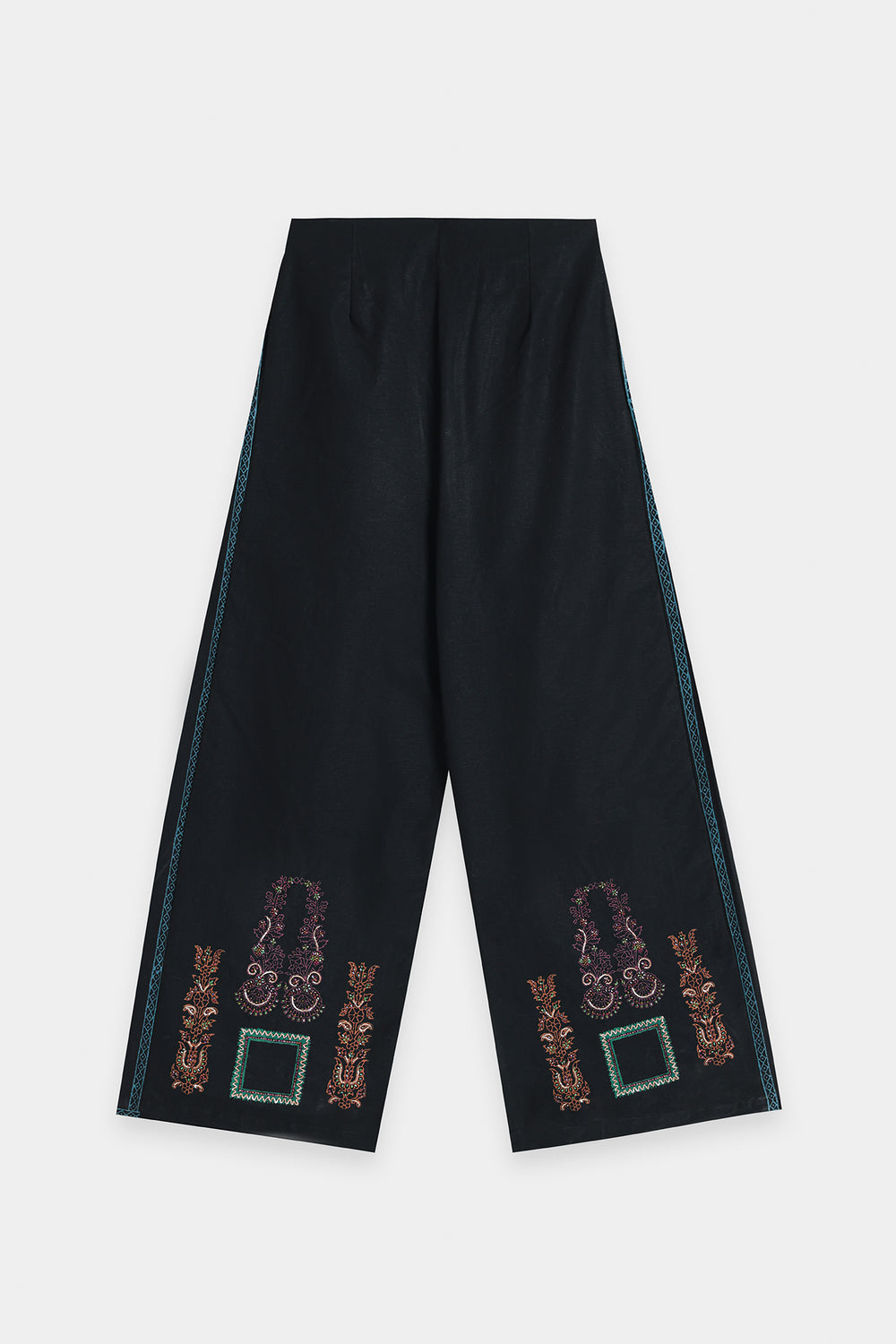 Embrace a seamless blend of modern edge and artisanal heritage with these striking wide-leg trouser. Designed for the woman who appreciates a bold, fluid silhouette, these trousers serve as a sophisticated canvas for exquisite craftsmanship and effortless style. The deep black base provides a dramatic contrast to the intricate, multi-colored embroidery at the hem, which features a rich tapestry of traditional motifs and geometric patterns. This voluminous cut offers a breezy movement that brings an air of high-fashion sophistication to your wardrobe, while a delicate lace trim along the bottom edge provides a soft, feminine finish.