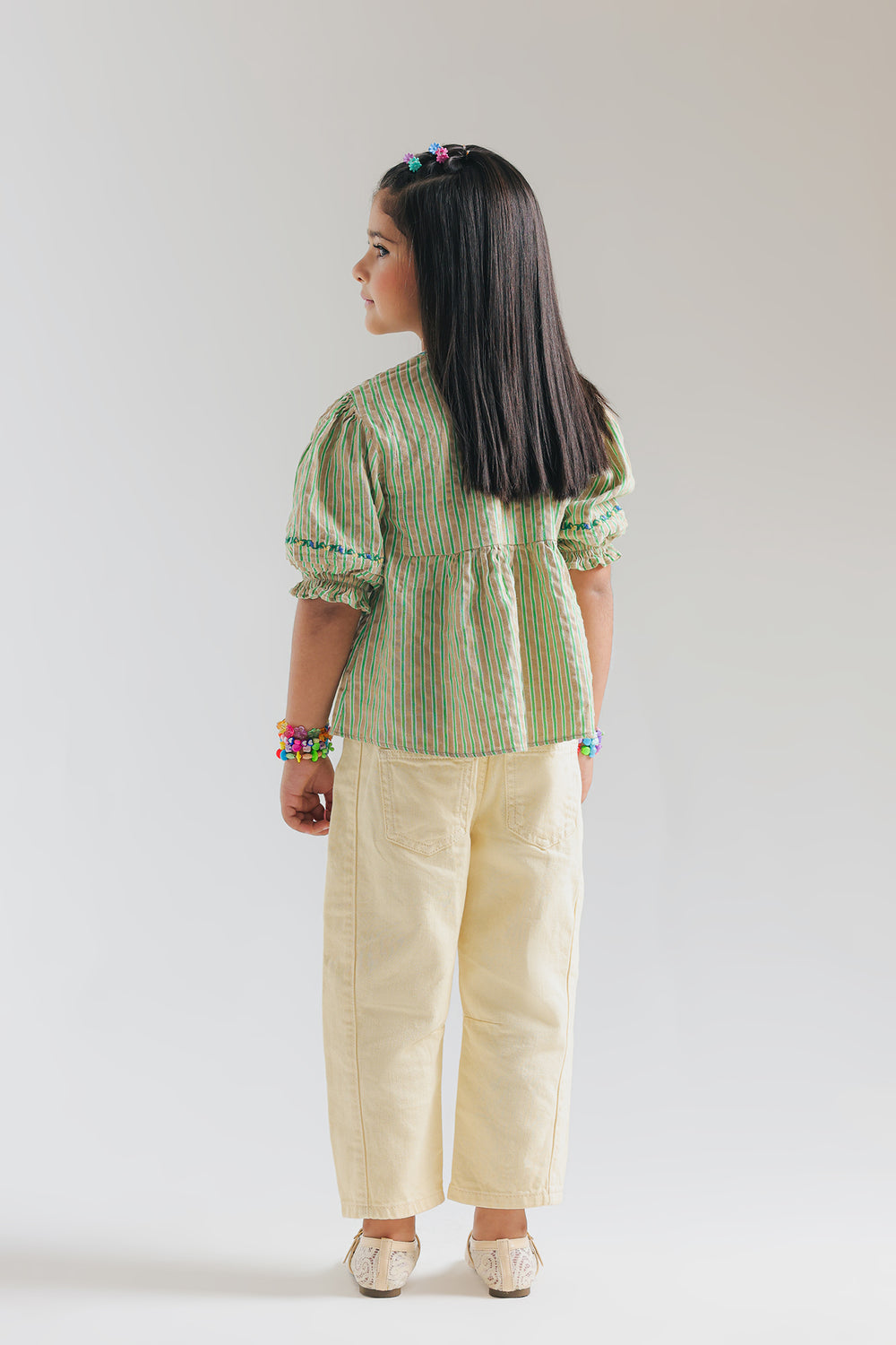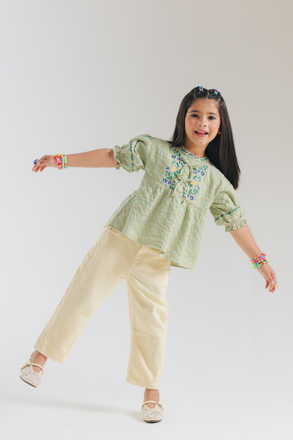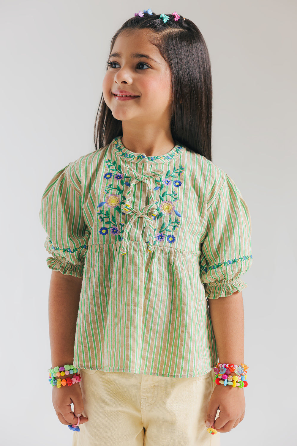 This charming girls' blouse combines timeless design with playful details. The soft green-and-white vertical stripes provide a classic foundation, while hand-embroidered florals in yellow, blue, and green add character and visual interest. Sleeves with elasticated cuffs ensure comfort without compromising style, making movement effortless for active children. The breezy, cheerful design transitions seamlessly from casual summer wear to festive daytime occasions, offering versatility for any young wardrobe.