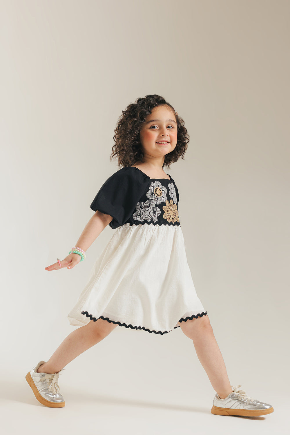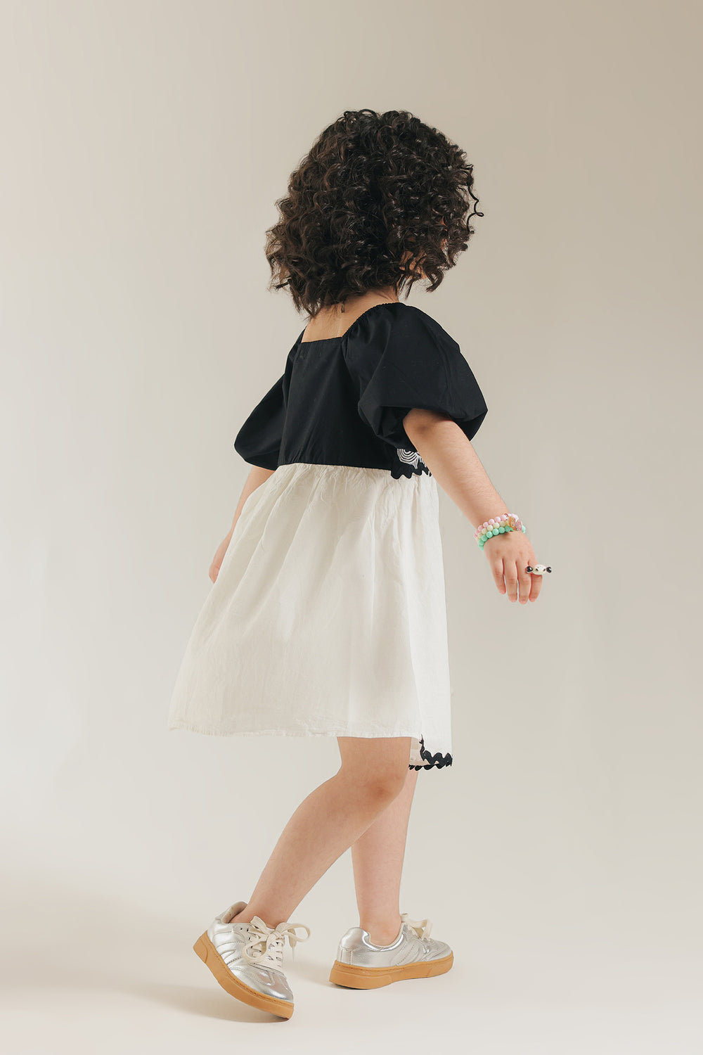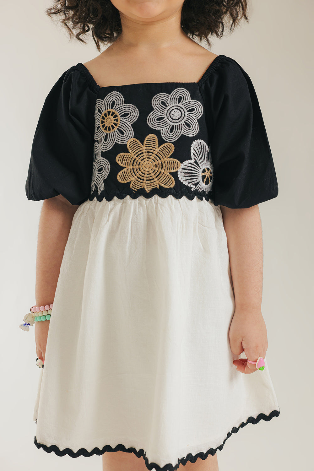 Inject retro flower power into her wardrobe with this fun, monochrome dress. The knee-length frock features a square neckline and is contrasted by puffed, short black balloon sleeves. The fitted black yoke is beautifully decorated with oversized floral embroidery in white, gold, and tan. The dress flows into a solid white skirt with a playful scalloped black trim at the hem, creating a bold and charming look.