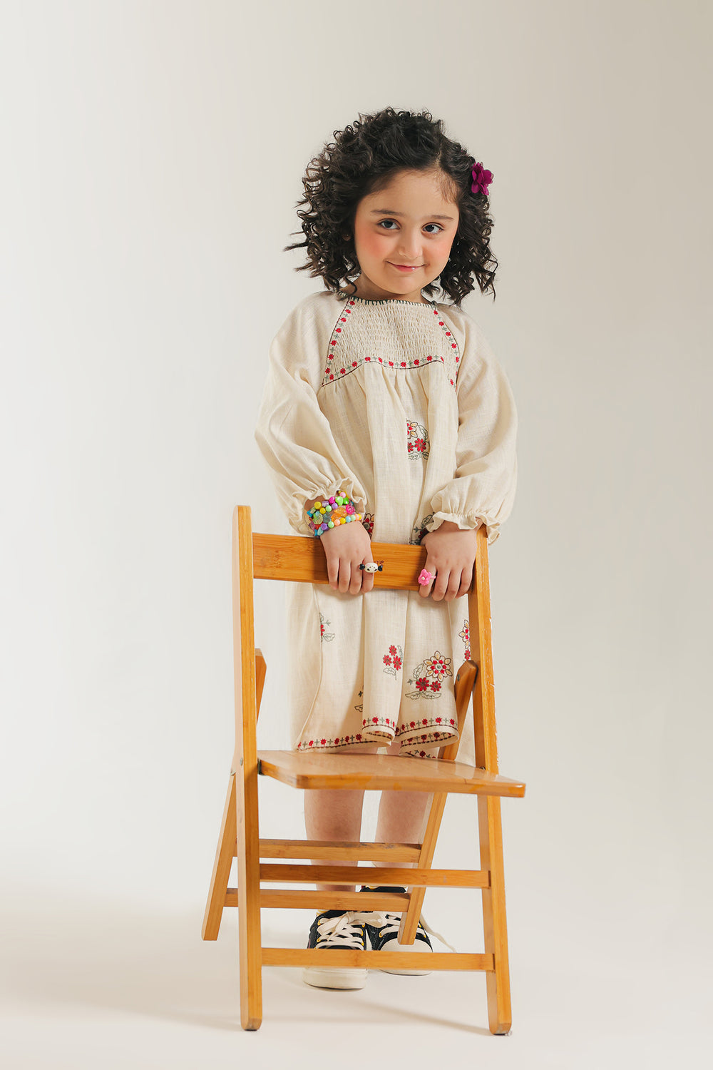 Embrace innocent, folk-inspired style with this adorable cream embroidered dress. This long-sleeved dress is crafted from a natural-toned, light fabric. It features a comfortable smocked yoke with accent embroidery in red and white. The body of the dress is adorned with playful scattered floral motifs in red and green, and the long sleeves gather softly at the wrist. The simple, flared silhouette makes it a perfect, cheerful dress for everyday wear.