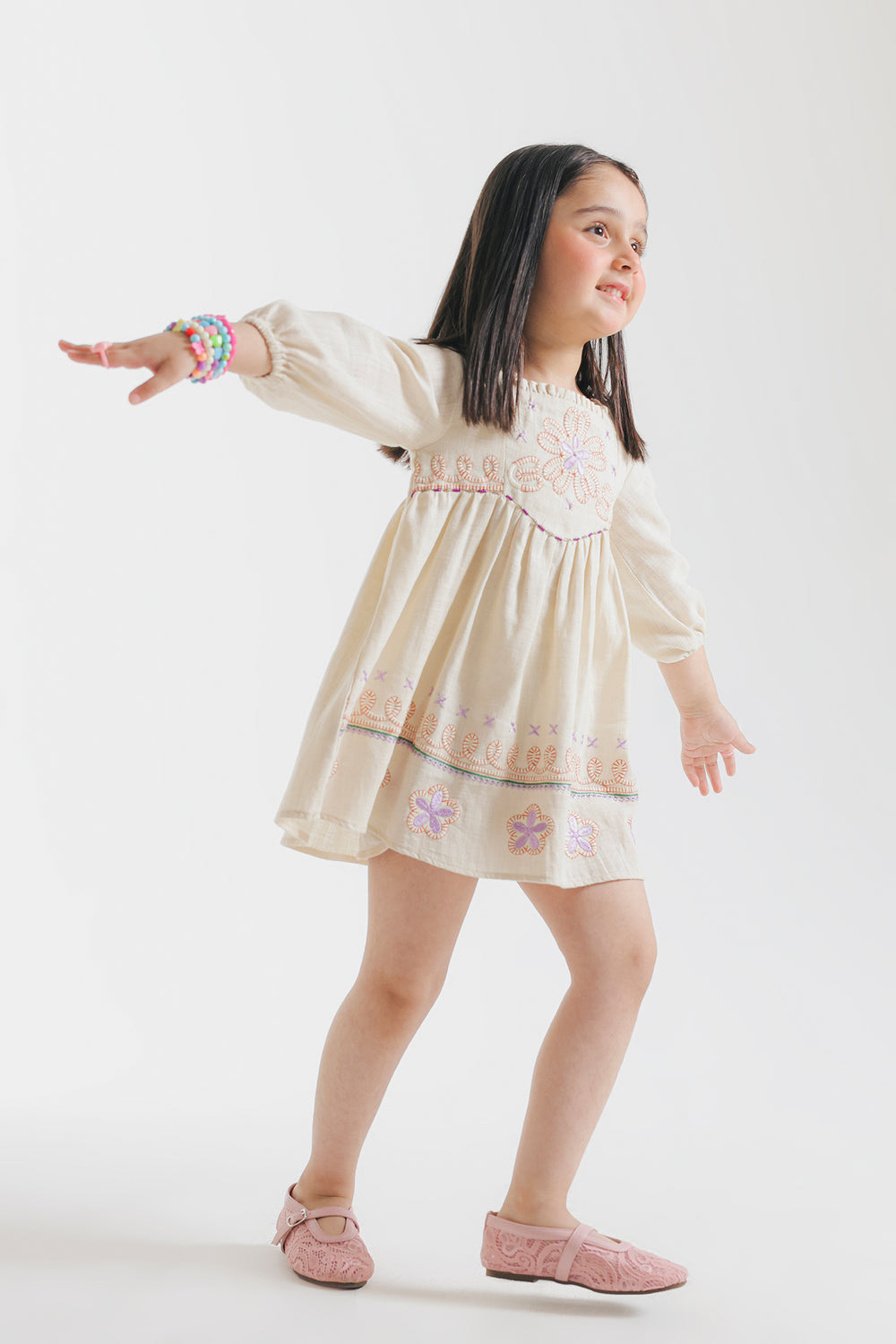 Let your little one stroll in a sun dappled meadow with this white dress. Delicately embroidered details featuring whimsical florals and playful pineapples, adds a touch of enchantment. The gentle puff sleeves and relaxed silhouette create a comfortable and airy feel, perfect for little adventurers and daydreamers alike.