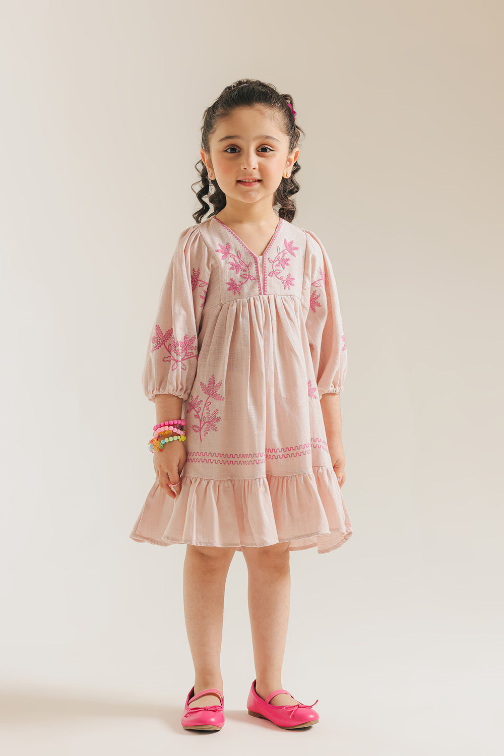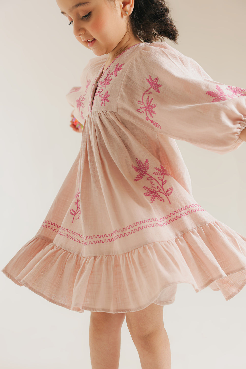 Wrap her in comfort and charm with this sweet pink embroidered dress. This delightful dress is crafted from a soft, light fabric in a beautiful dusty pink shade. The design features lovely tonal pink floral and geometric embroidery detailing the V-neckline and down the center front. The silhouette is relaxed and swingy, complete with a softly gathered waist that leads to a full skirt finished with a delicate ruffled tier. The three-quarter bishop sleeves with gathered cuffs add a touch of playful volume, making this a perfect dress for easy, stylish wear.