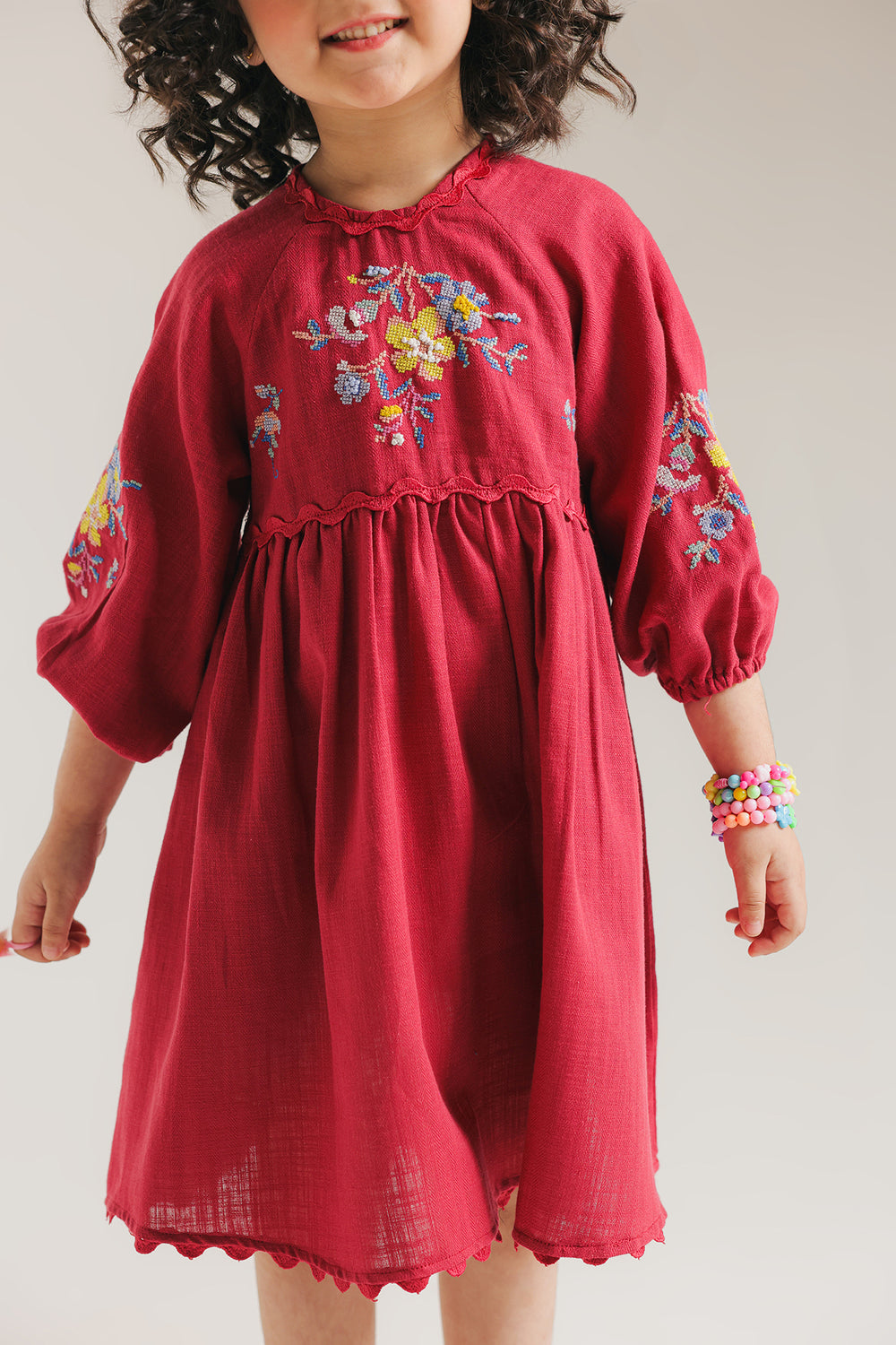 Elegant wine-colored dress designed for children, featuring a knee-length silhouette that offers comfort and sophistication. The dress showcases intricate embroidery detailing on the front bodice and sleeves, adding a refined touch perfect for special occasions or festive celebrations. Crafted with quality construction, this piece combines traditional artistry with contemporary styling, making it an ideal choice for young ones who appreciate detailed craftsmanship and timeless elegance.