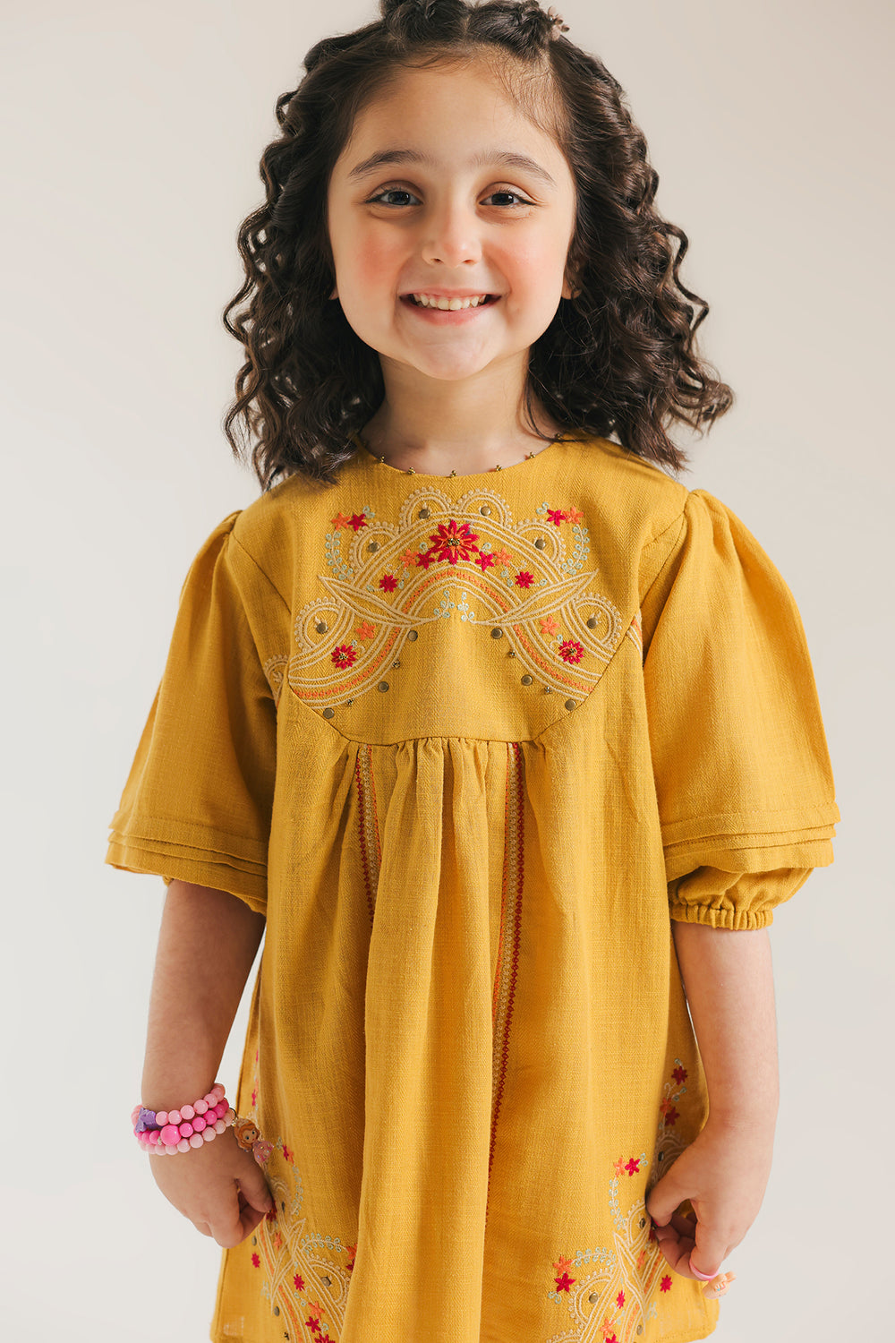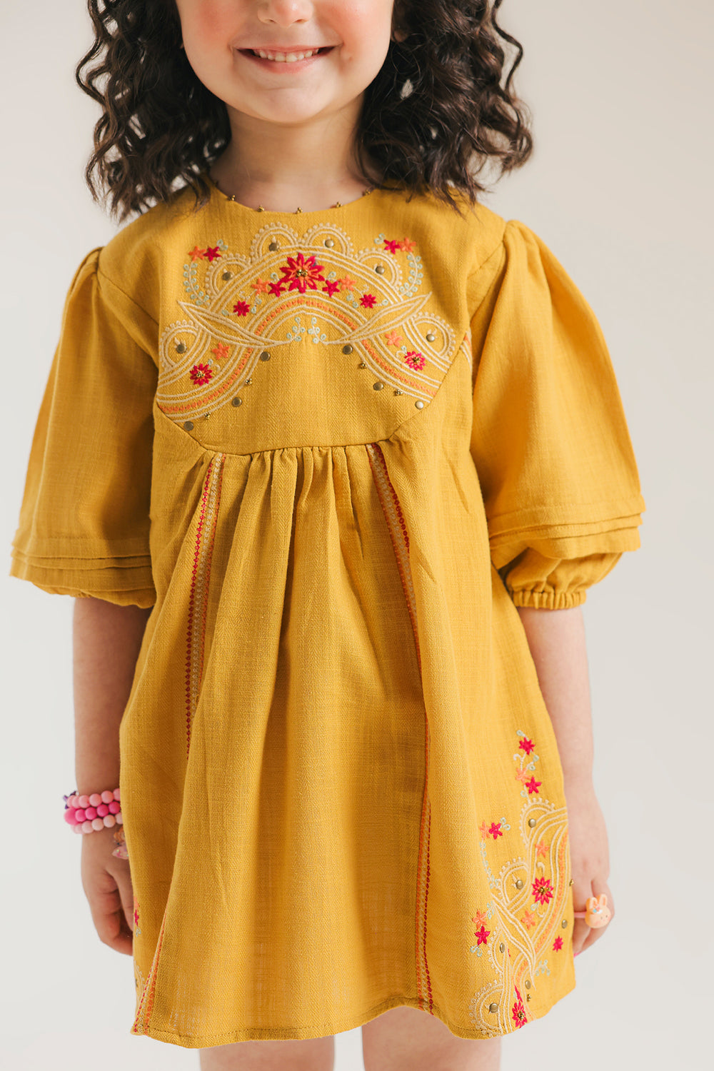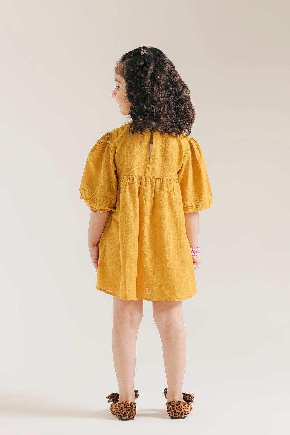 Brighten your wardrobe with this cheerful yellow short dress. The front features delicate floral embroidery that adds a touch of elegance and charm. Designed with a comfortable round neckline and quarter-length sleeves with elastic cuffs for a relaxed fit. Perfect for casual outings, gatherings, or everyday wear. This dress combines style and comfort in one beautiful piece.