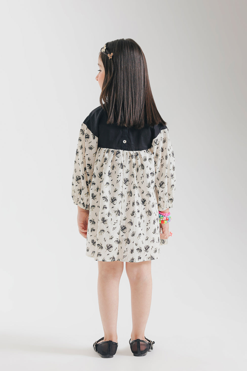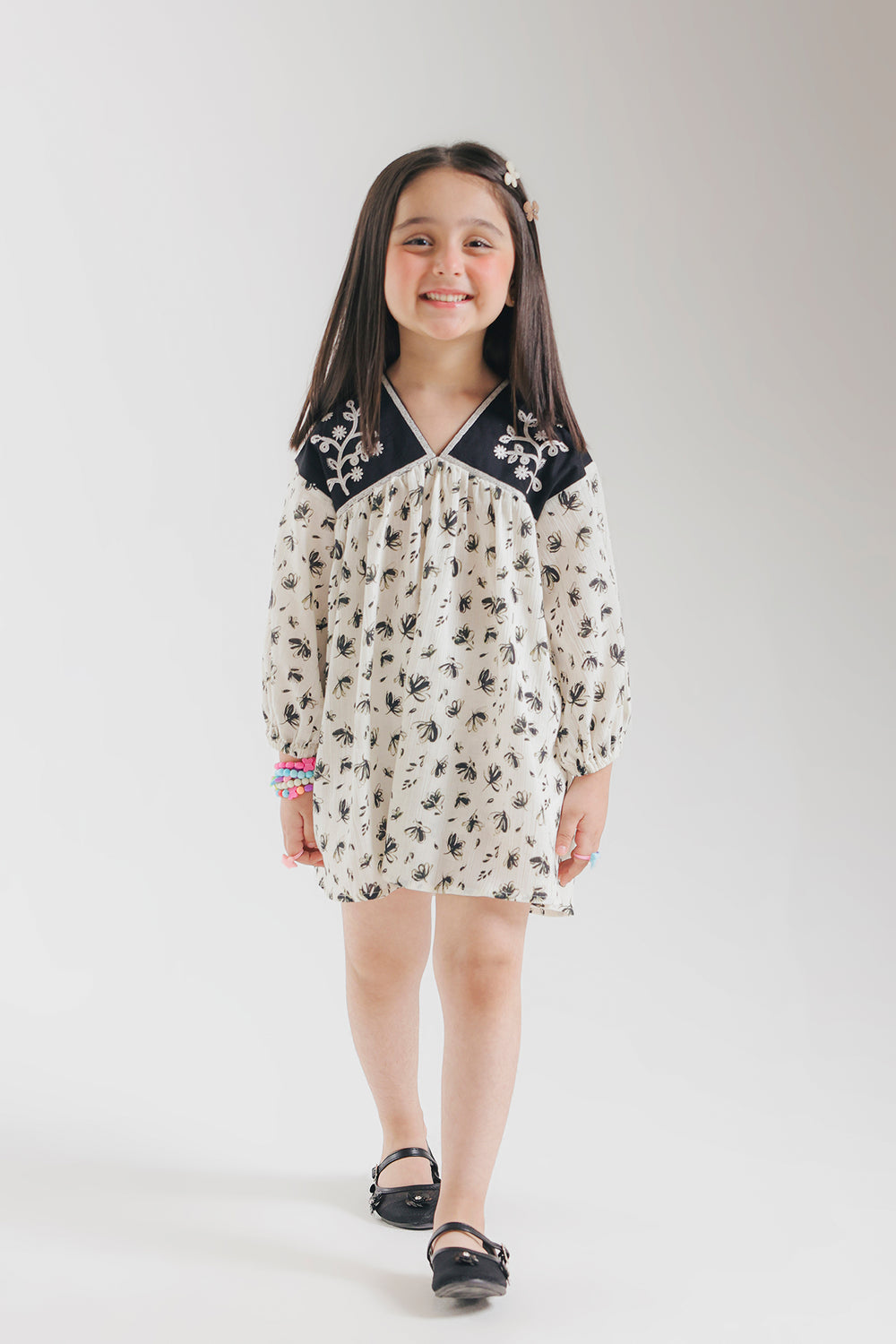 Elegant short dress featuring a striking black yolk adorned with delicate white embroidery. The full sleeves provide a modest, graceful silhouette perfect for casual outings or gatherings. The intricate embroidery detailing adds a touch of traditional charm to this versatile piece. Comfortable and stylish, this dress combines classic design with contemporary appeal.