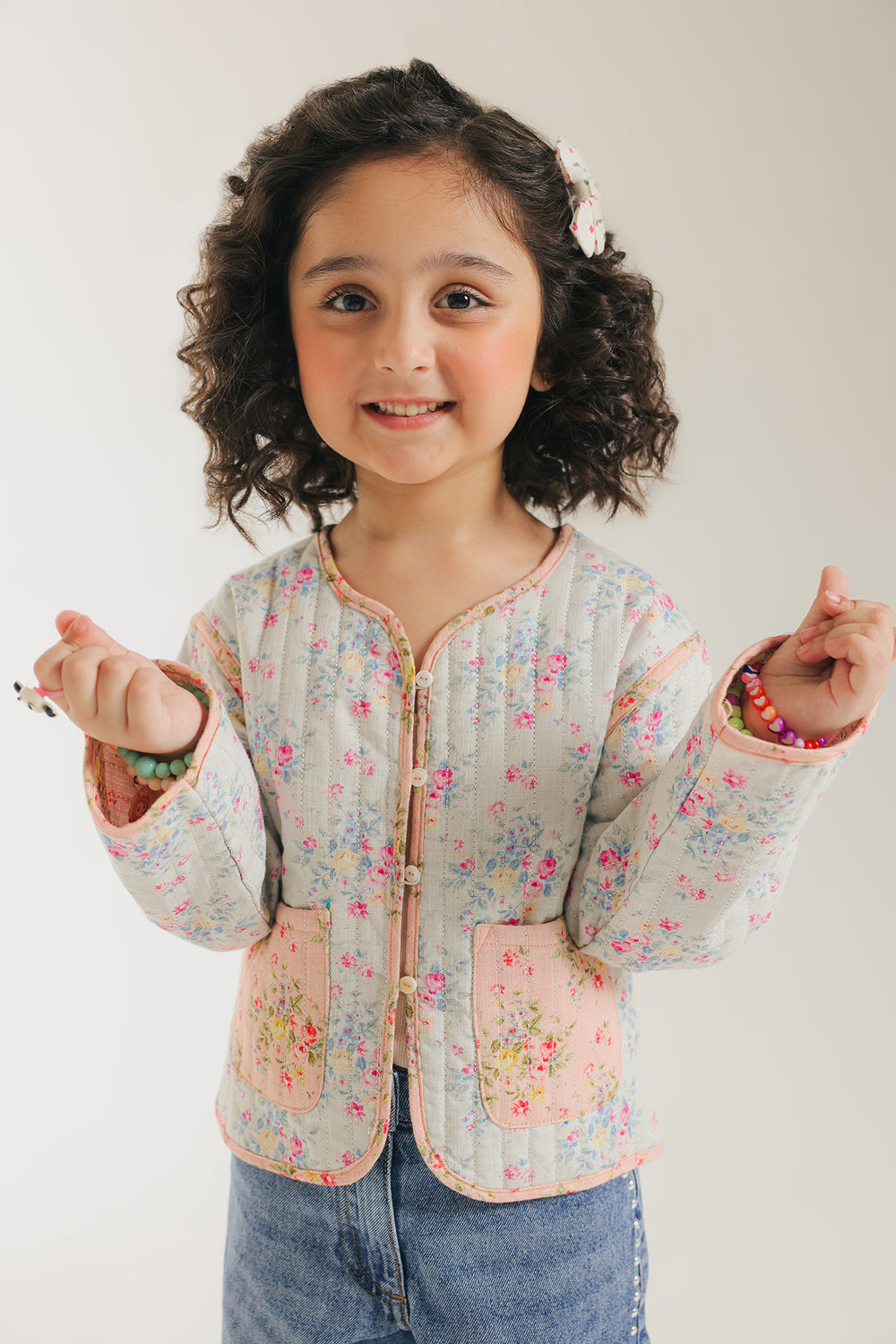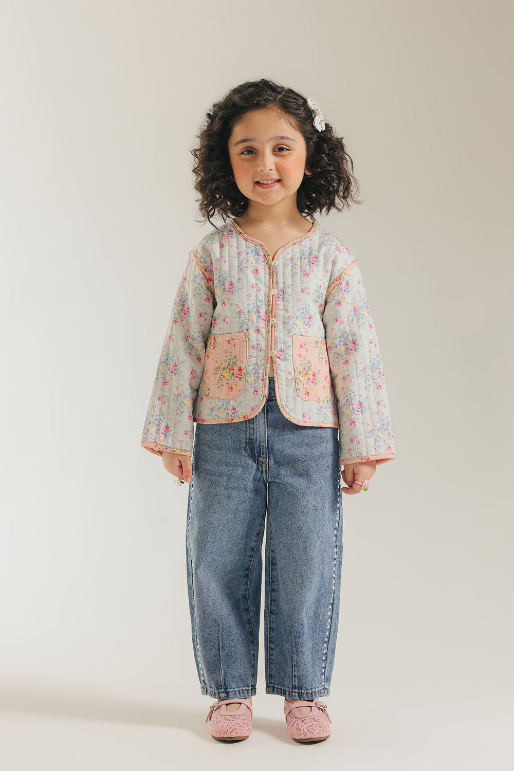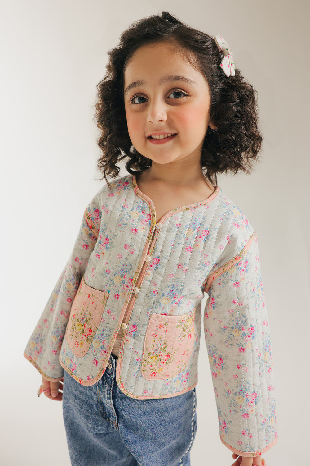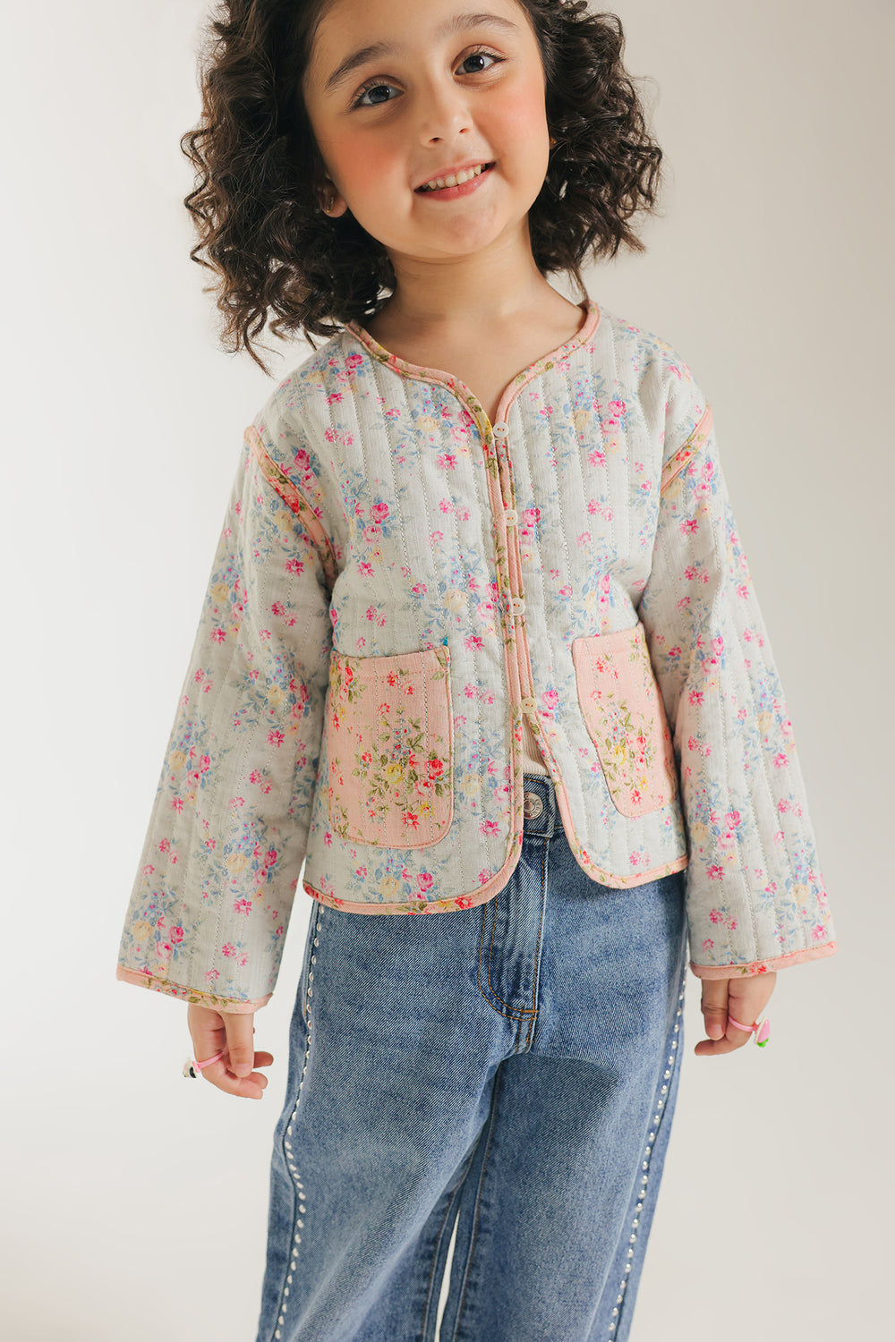 Unveil sweet, vintage charm with this adorable floral quilted top. The jacket features a delightful quilted pattern on white fabric adorned with a gentle pink and green floral print. It has an easy-to-wear, slightly cropped fit, a round neckline, and charmingly contrasting pink trim. The two front patch pockets with pink trim complete this cozy and darling piece, perfect for layering.
