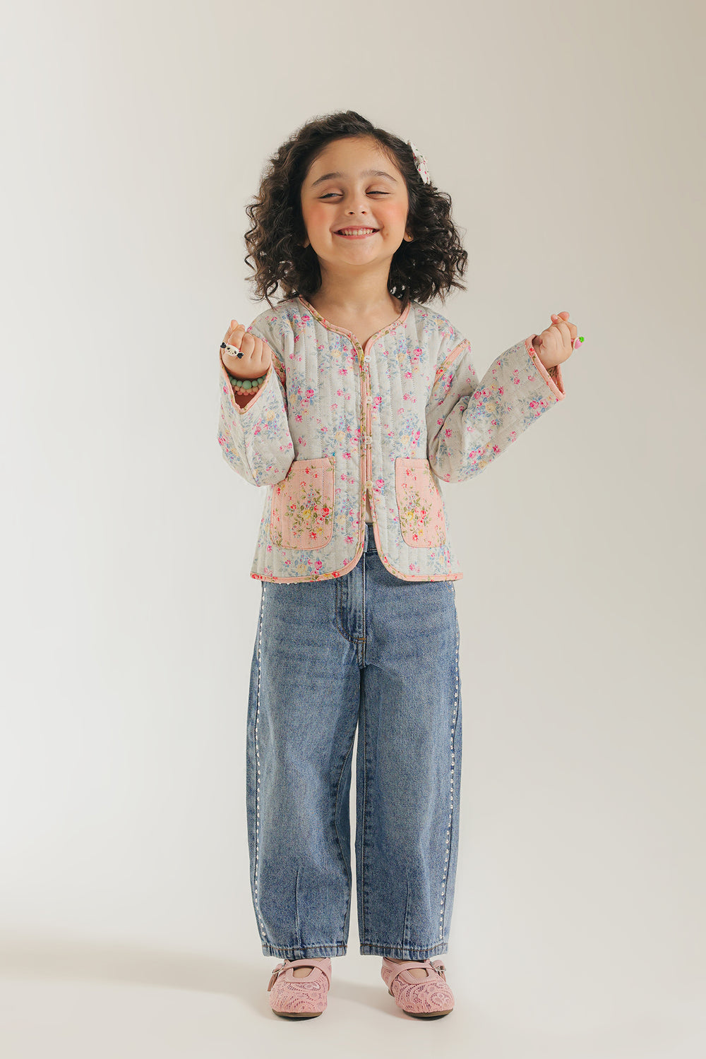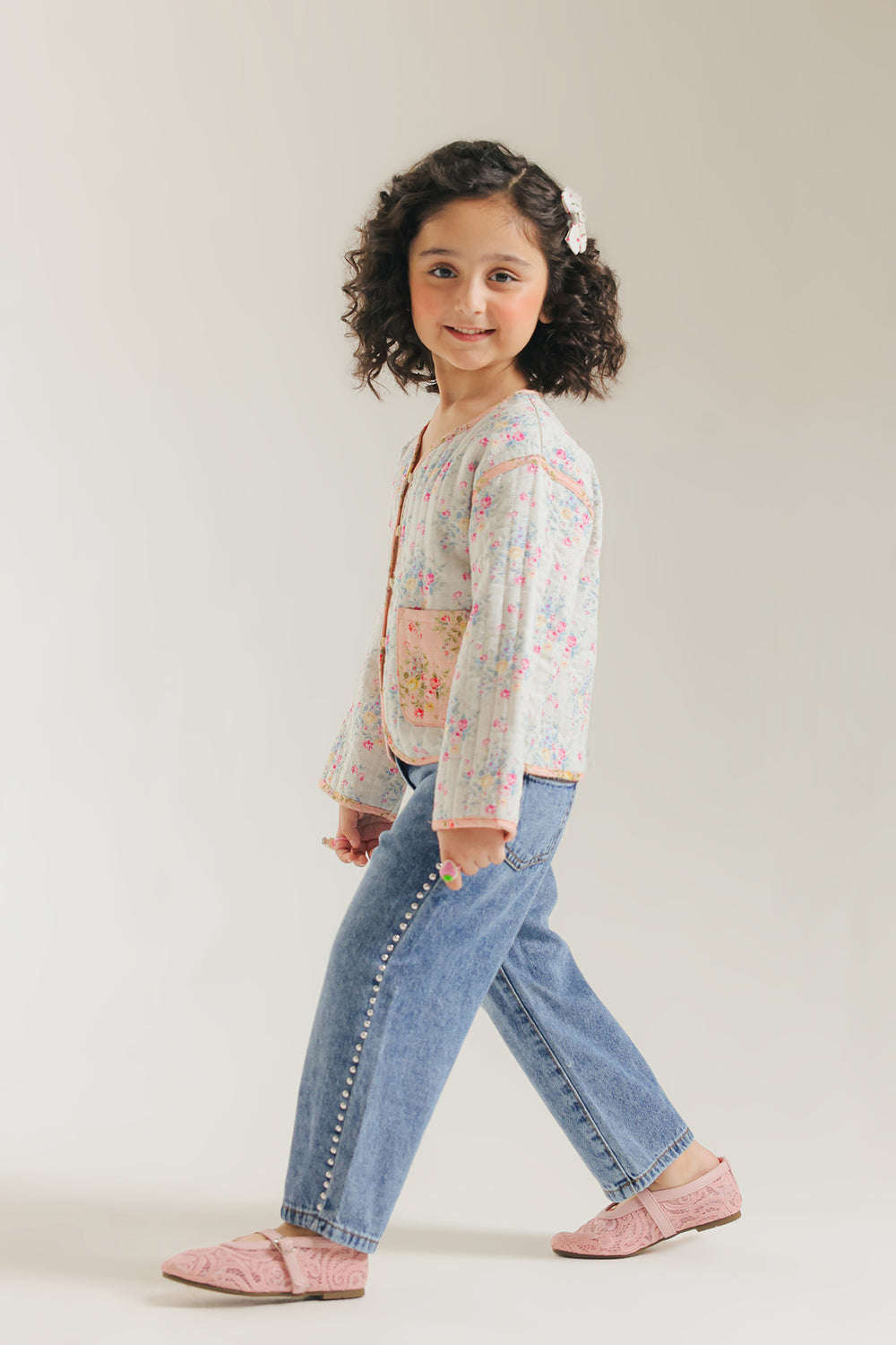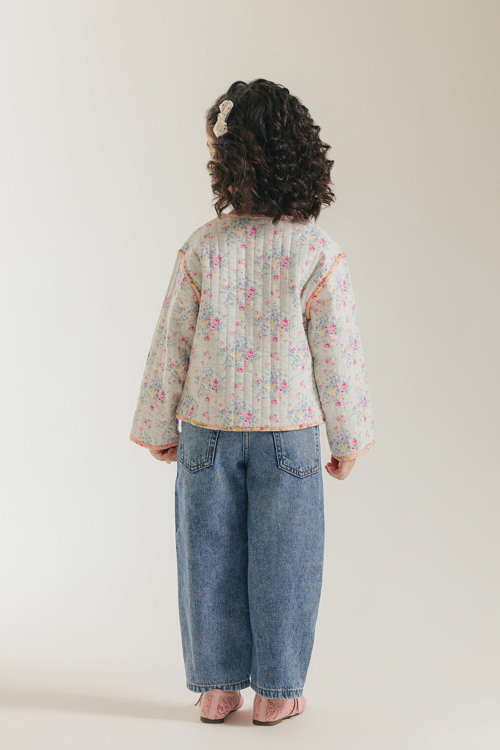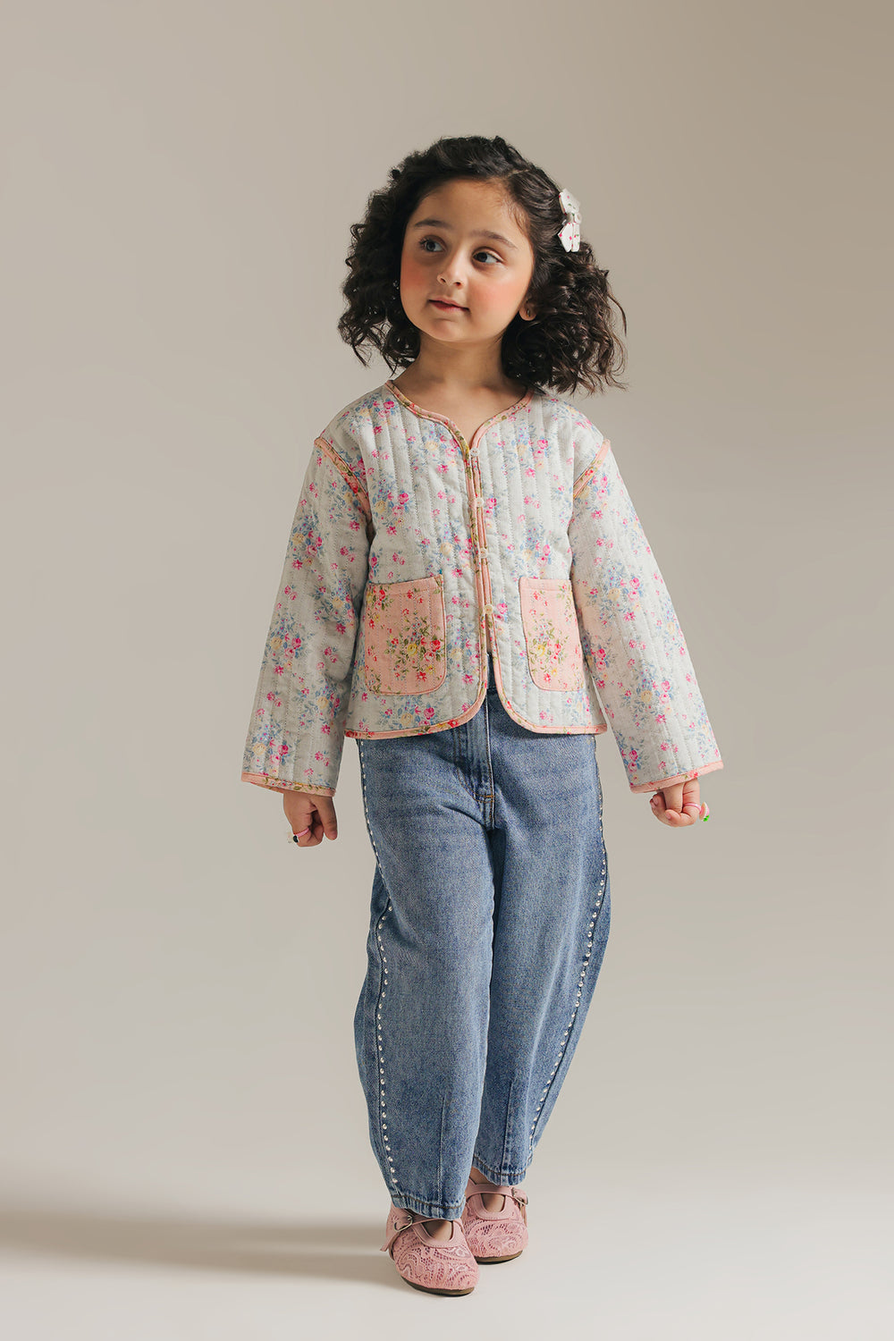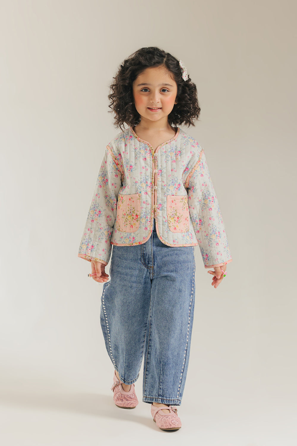 Unveil sweet, vintage charm with this adorable floral quilted top. The jacket features a delightful quilted pattern on white fabric adorned with a gentle pink and green floral print. It has an easy-to-wear, slightly cropped fit, a round neckline, and charmingly contrasting pink trim. The two front patch pockets with pink trim complete this cozy and darling piece, perfect for layering.