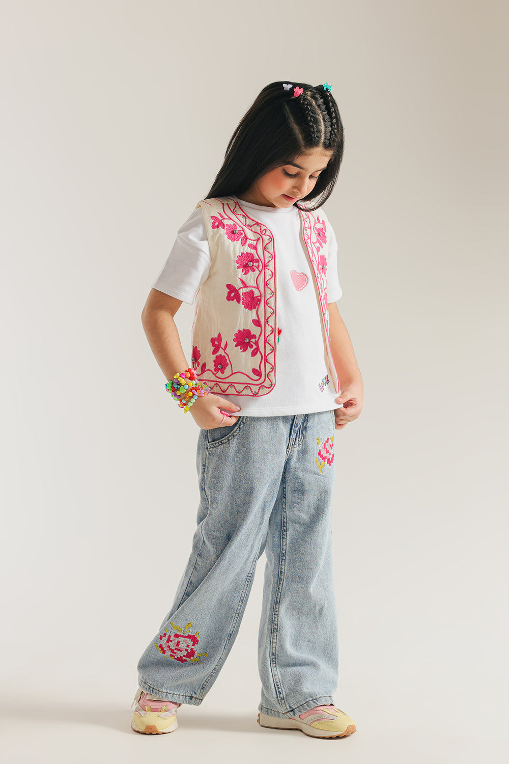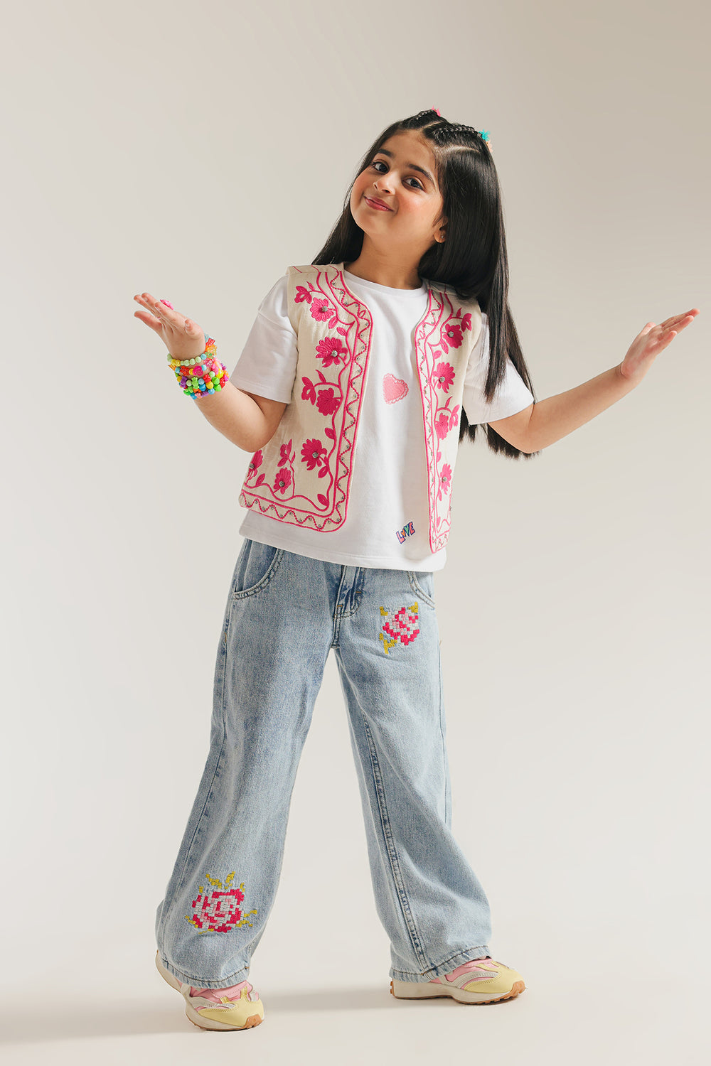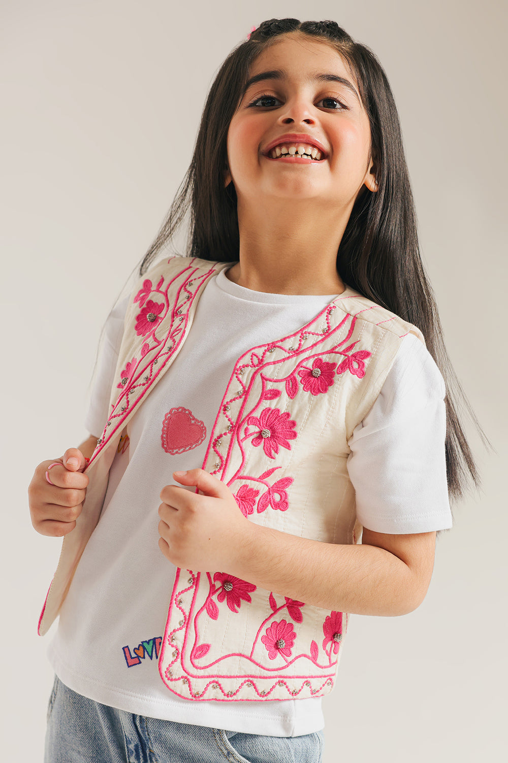 Add a touch of timeless charm to any outfit with this exquisite waistcoat. This stunning piece features a crisp white base beautifully adorned with vibrant, intricate pink floral embroidery that creates a delicate and artistic pattern. Perfect for layering over a simple tee, it instantly elevates a casual look, transforming it into a statement of elegance and tradition.