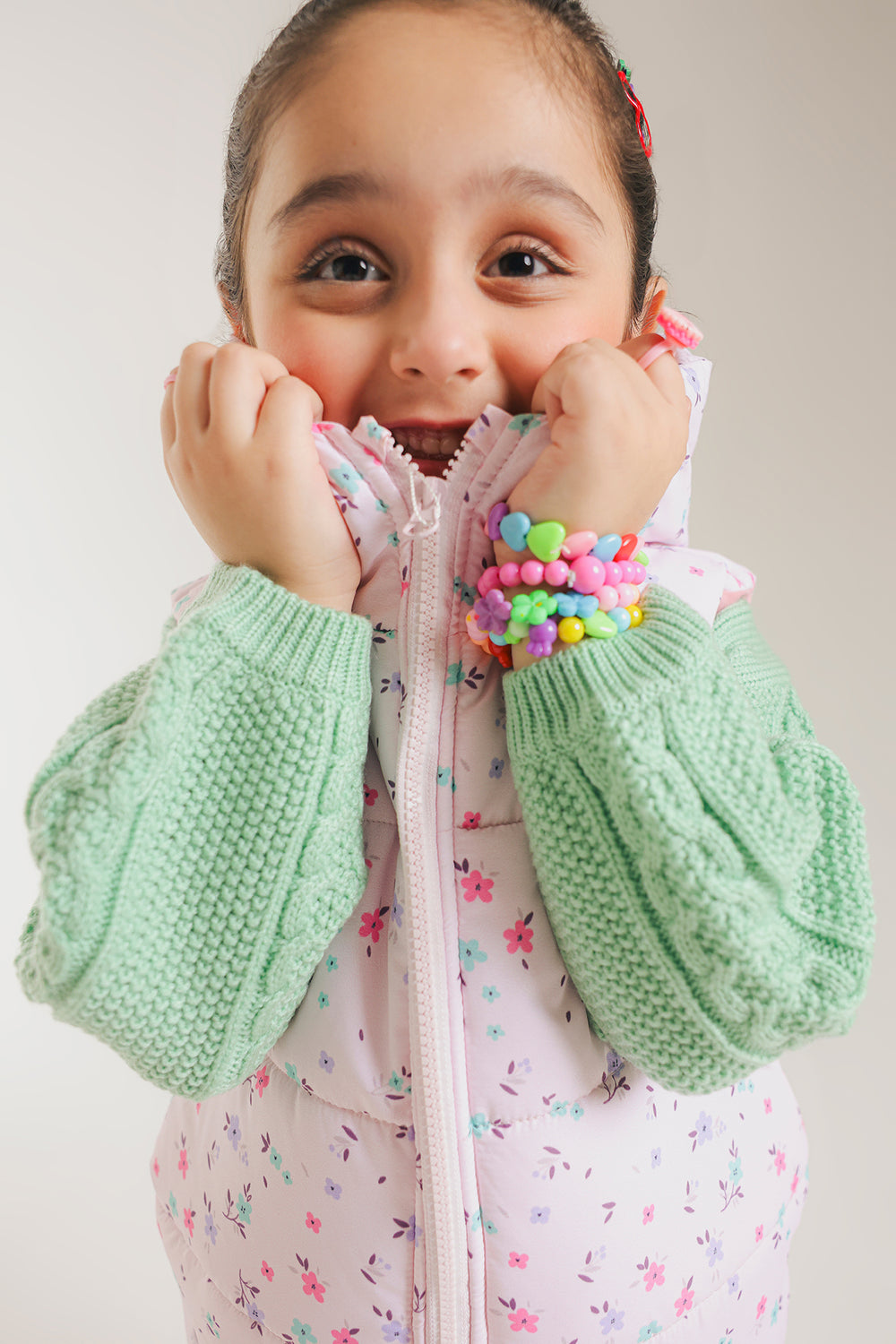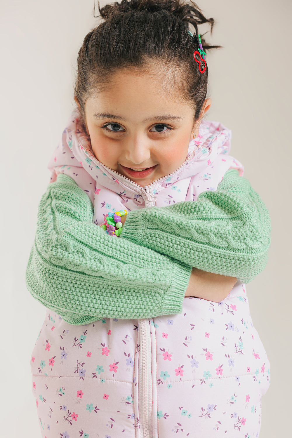 Drape her in cozy, playful style with this adorable floral puffer Jacket. This sleeveless puffer is crafted in a light pink fabric and features a delicate all-over floral print in pastel hues. It includes a cozy hood and a practical front zipper closure. Perfect for layering over sweaters or long-sleeved tops, this jacket adds a touch of warmth and charm to any casual outfit.