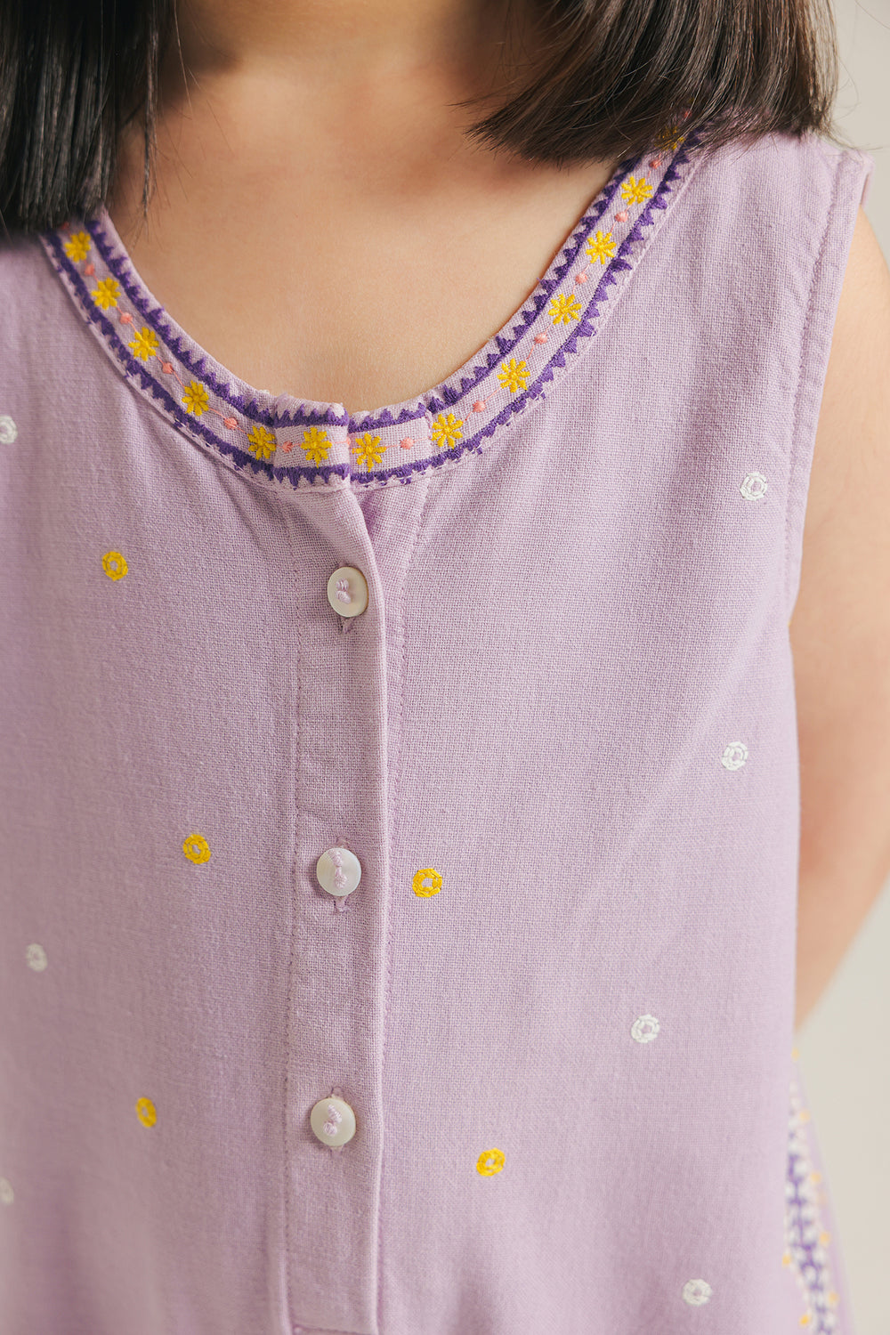 Step into a world of whimsical charm with this enchanting jumpsuit. This soft, lavender-hued piece features a comfortable, sleeveless design with a playful button-down front. The wide-leg pants are beautifully adorned with a border of vibrant floral embroidery at the hem, while delicate flower dots are scattered across the bodice. It's a delightful and carefree outfit for any special day.