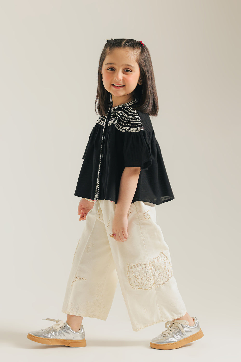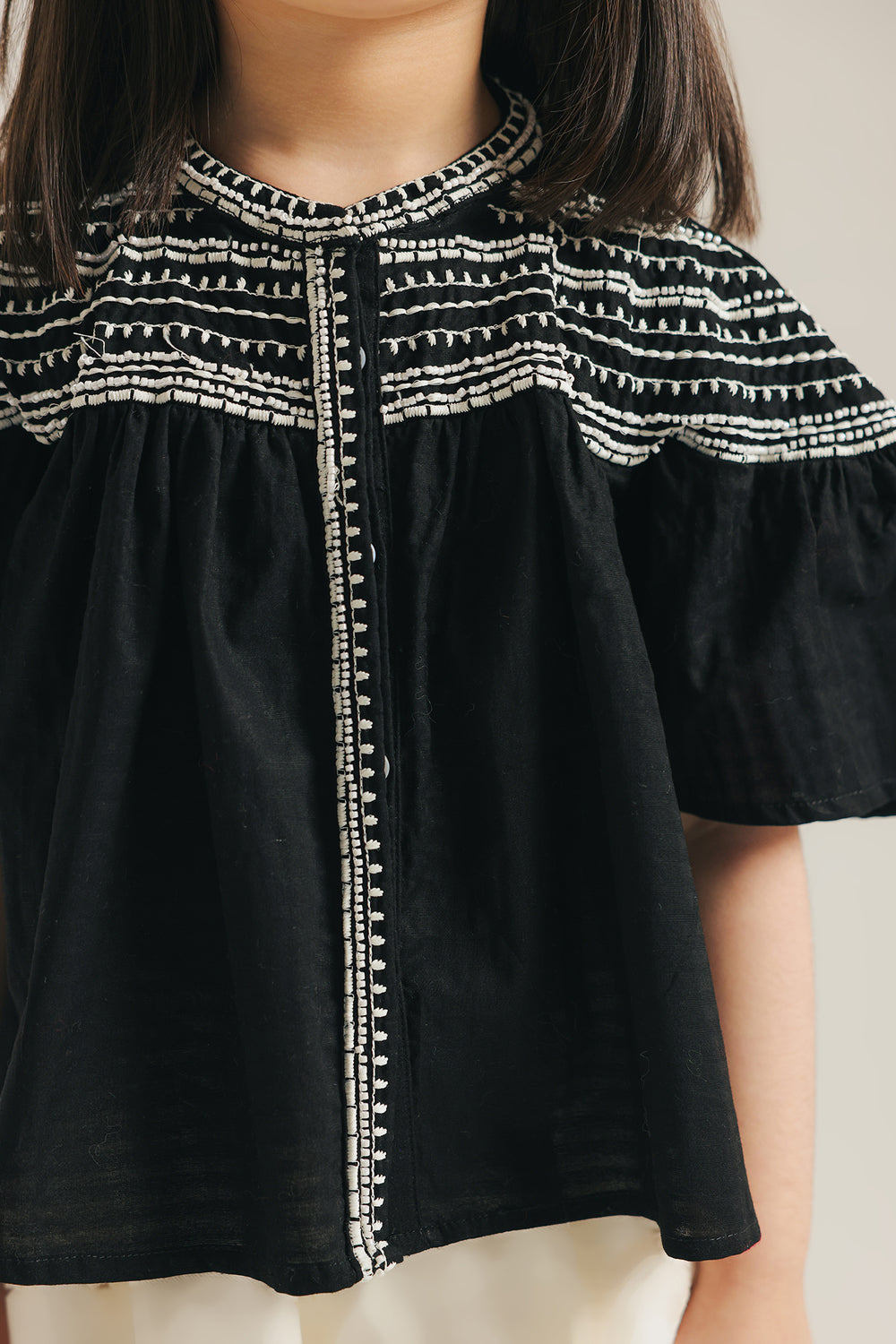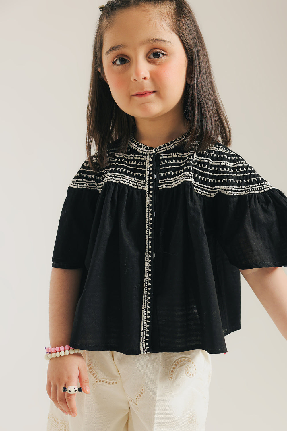Make a statement with this stylish shirt. Crafted in a chic black, this top features intricate white embroidery and delicate beading across the yoke, creating a captivating contrast. The relaxed fit, wide flared short sleeves, and round neckline add to its bohemian charm. Pair it with her favorite trousers for a truly standout look.