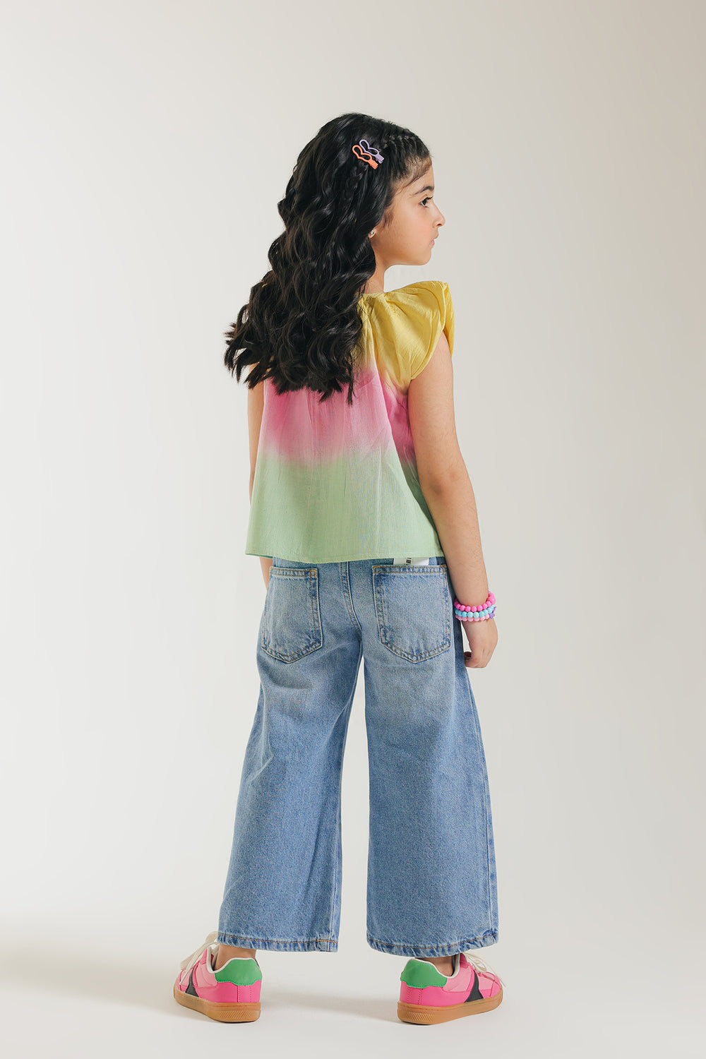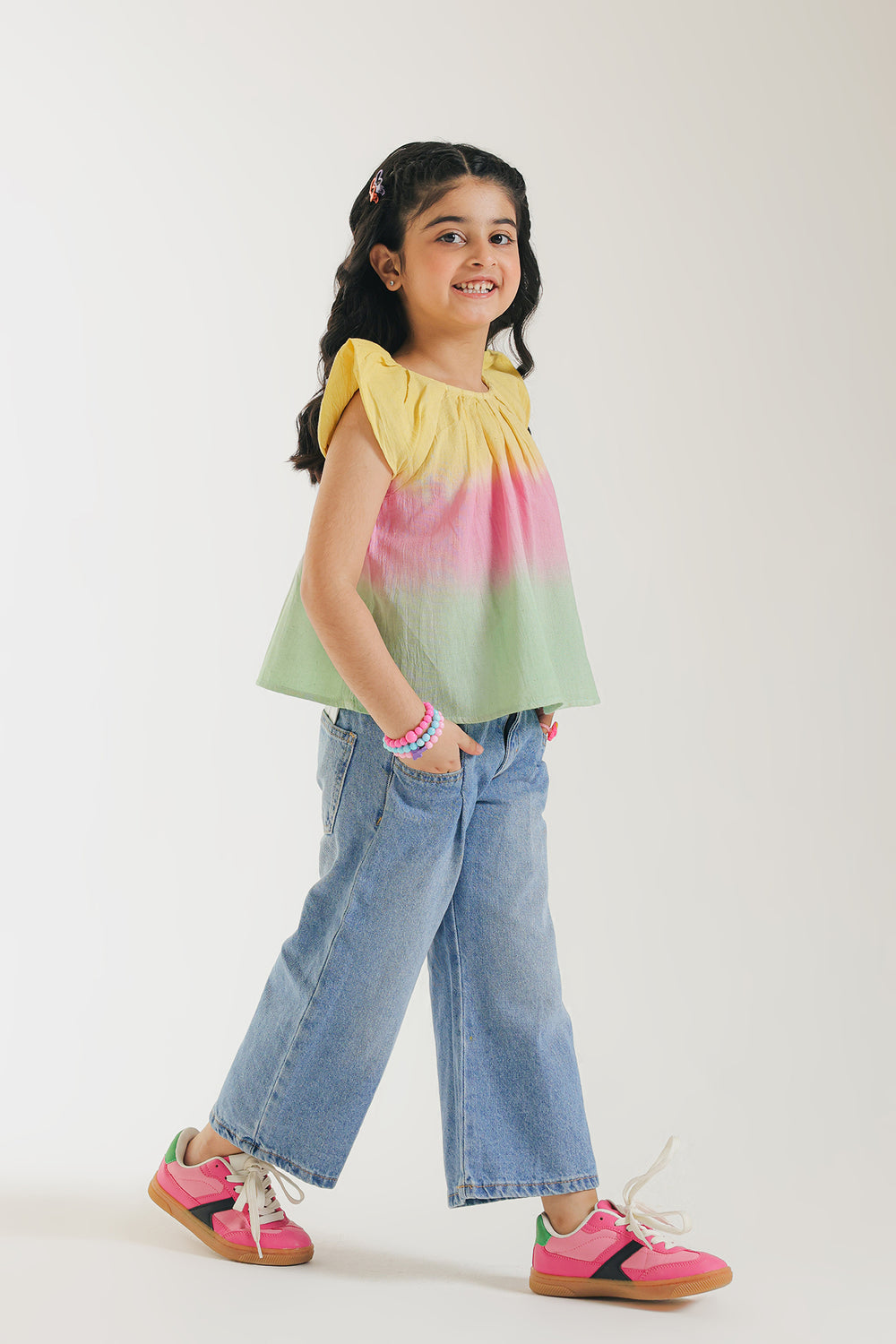 This vibrant top captures the magic of a perfect sunset. The soft, flowing fabric showcases a stunning gradient of yellow, pink, and green, evoking the colors of a breathtaking twilight sky. The relaxed fit and sleeveless silhouette create a comfortable and effortlessly stylish look. This top is a wearable work of art, perfect for adding a touch of dreamy color to any day.