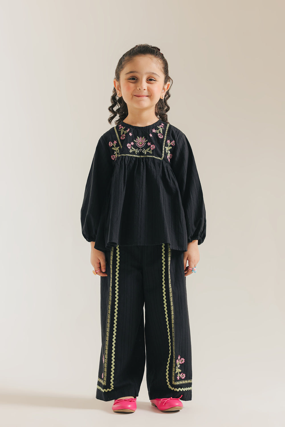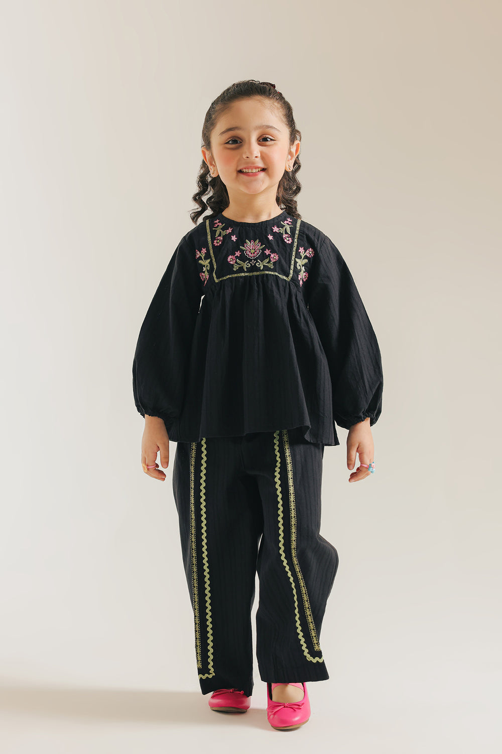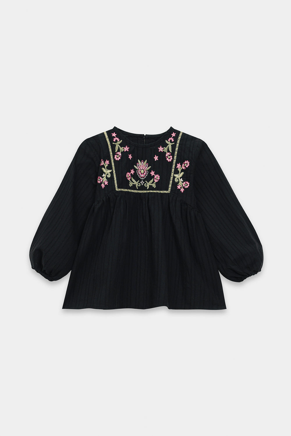 Introduce a touch of chic sophistication to her wardrobe with this adorable black embroidered peasant blouse. This stylish top is crafted from a textured black fabric and features a comfortable, relaxed fit. The blouse is beautifully detailed with delicate pink and green floral embroidery accenting the yoke neckline. A gathered seam below the yoke creates a lovely flow and volume, complemented by the comfortable, full long sleeves. This black blouse paired with coordinating straight fit trouser, offers a timeless, elegant look.
