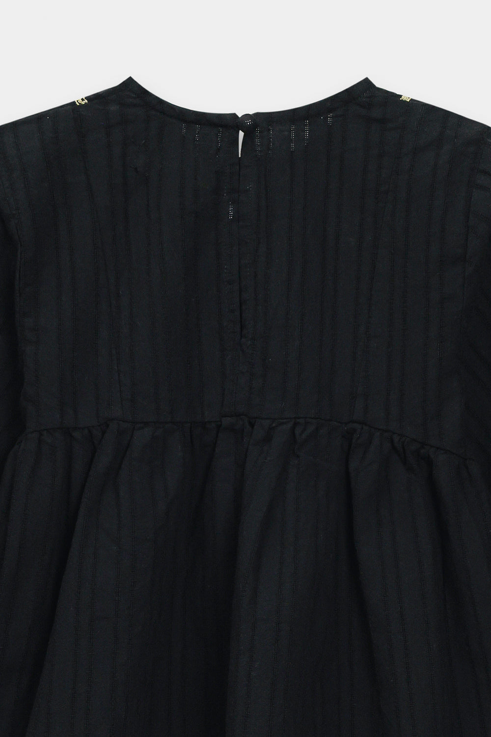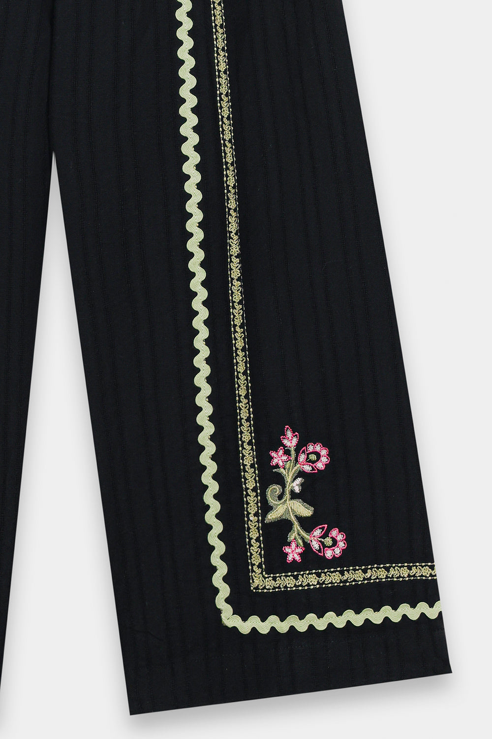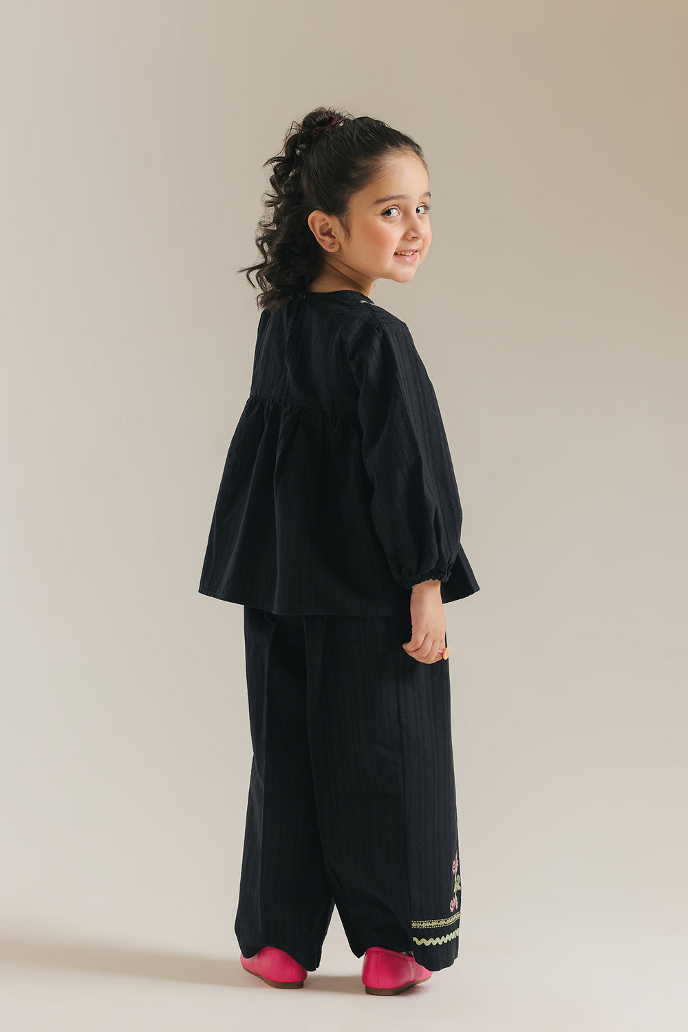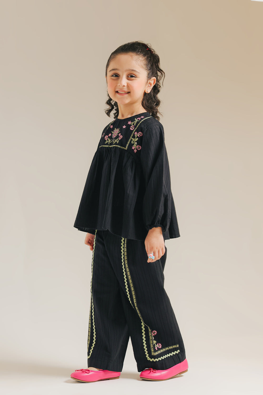 Introduce a touch of chic sophistication to her wardrobe with this adorable black embroidered peasant blouse. This stylish top is crafted from a textured black fabric and features a comfortable, relaxed fit. The blouse is beautifully detailed with delicate pink and green floral embroidery accenting the yoke neckline. A gathered seam below the yoke creates a lovely flow and volume, complemented by the comfortable, full long sleeves. This black blouse paired with coordinating straight fit trouser, offers a timeless, elegant look.