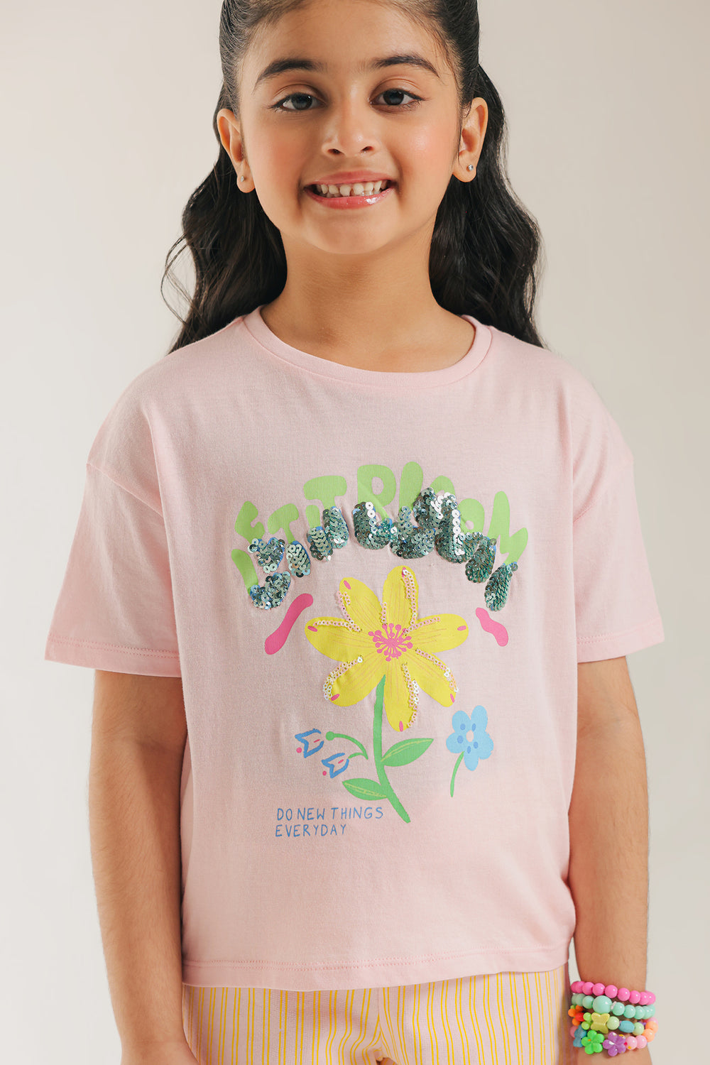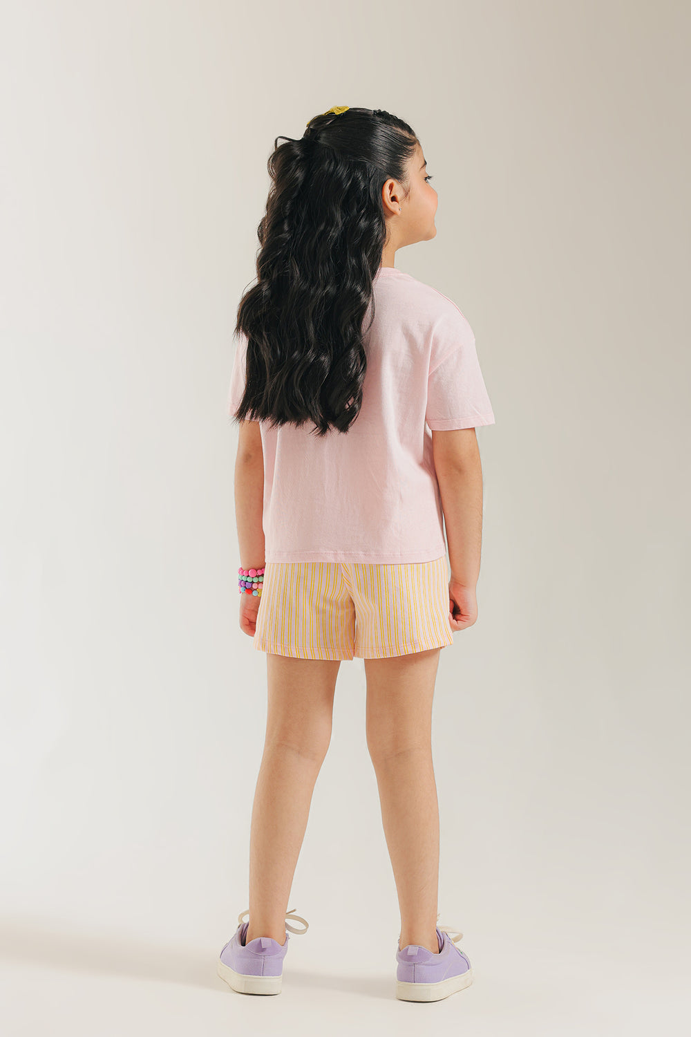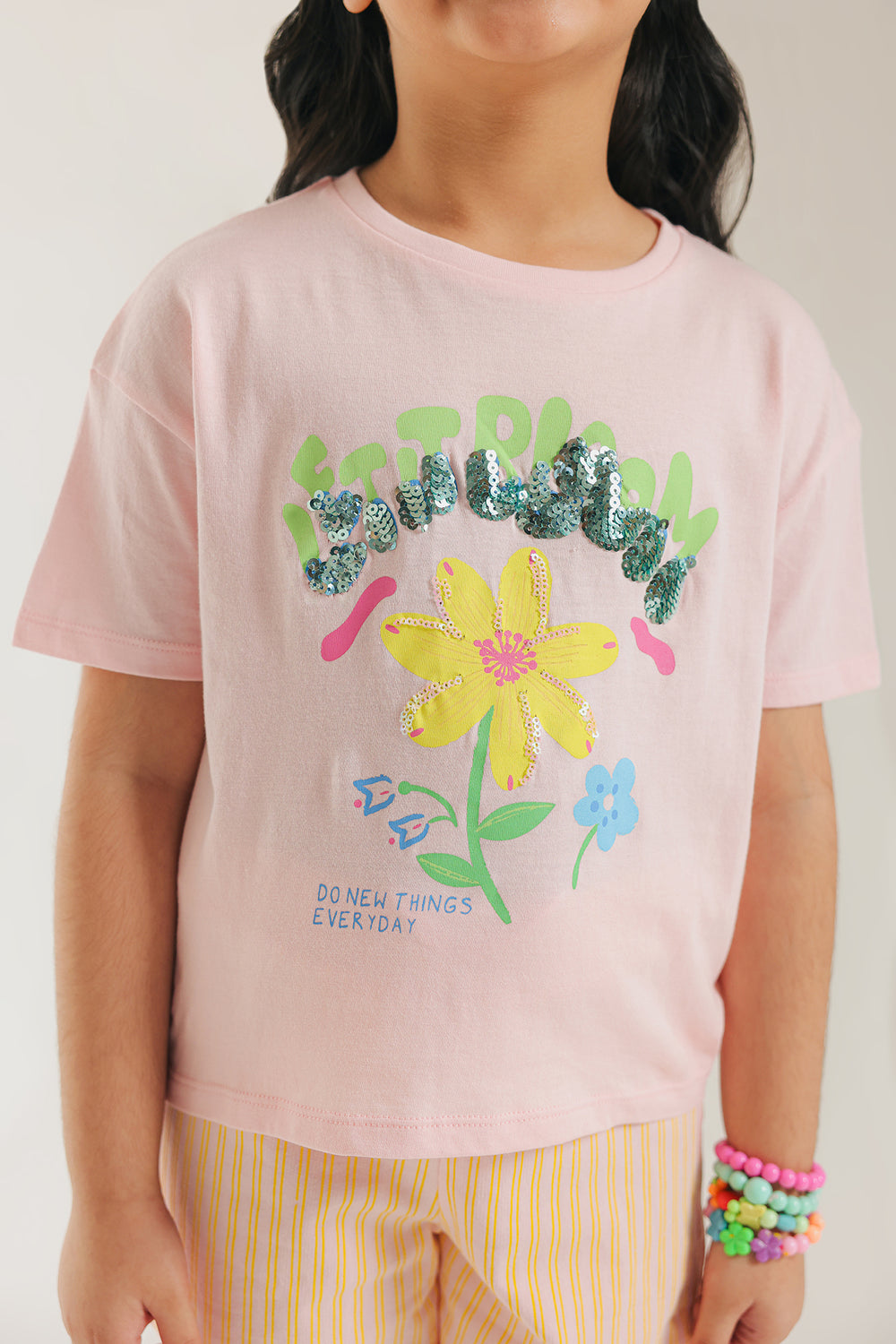 A soft pink T-shirt featuring a fun, whimsical graphic print. The centerpiece is a yellow flower, and the text above is adorned with shimmering sequins for a touch of sparkle. Matching knit shorts in a delightful pink and yellow vertical stripe pattern, completed with a comfortable elastic waistband and a decorative pink drawstring tie. This ensemble is a perfect blend of comfort and eye-catching style, ready for sunny days and creative play.