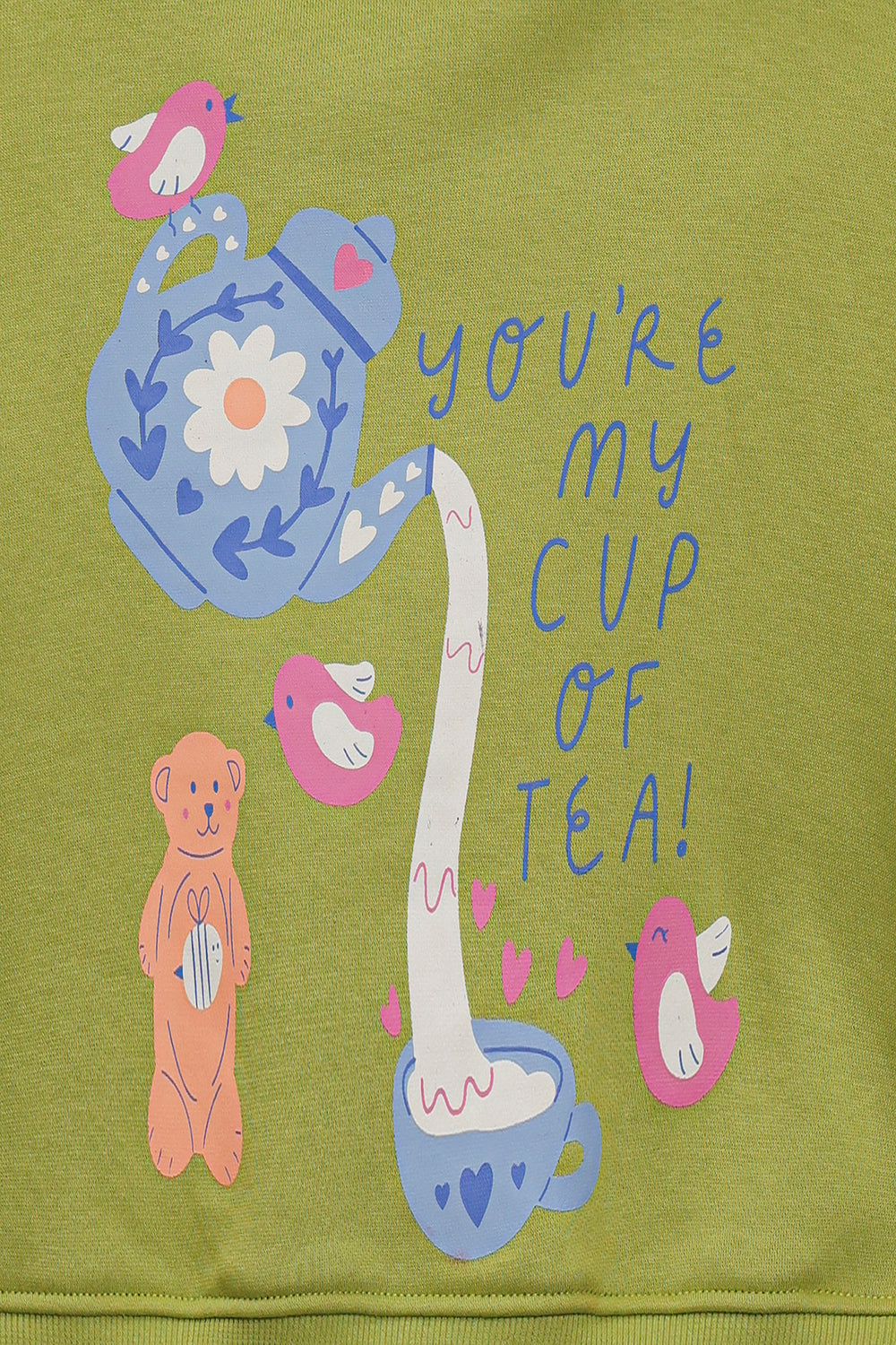 Parrot green co-ord set featuring a charming "You are my cup of tea" design. This matching two-piece set combines comfort with playful style, perfect for casual outings or relaxed weekends. The vibrant green shade pairs beautifully with the quirky text detail, making it an ideal choice for those who love expressing their personality through fashion. Soft, wearable, and effortlessly chic.