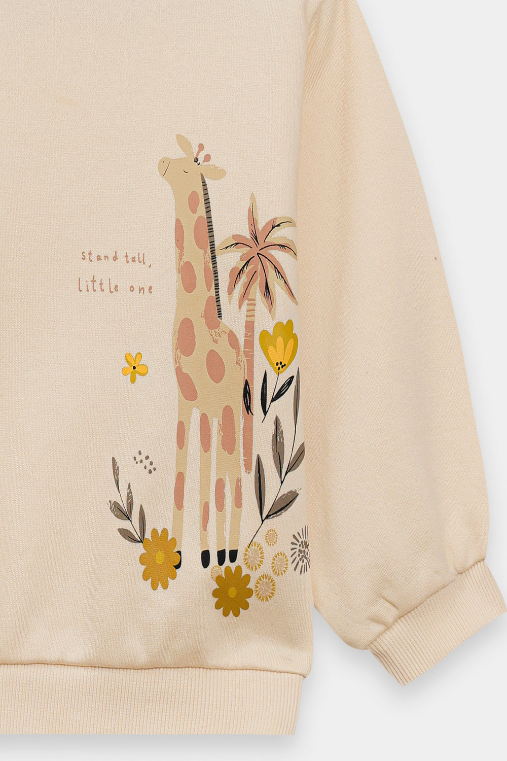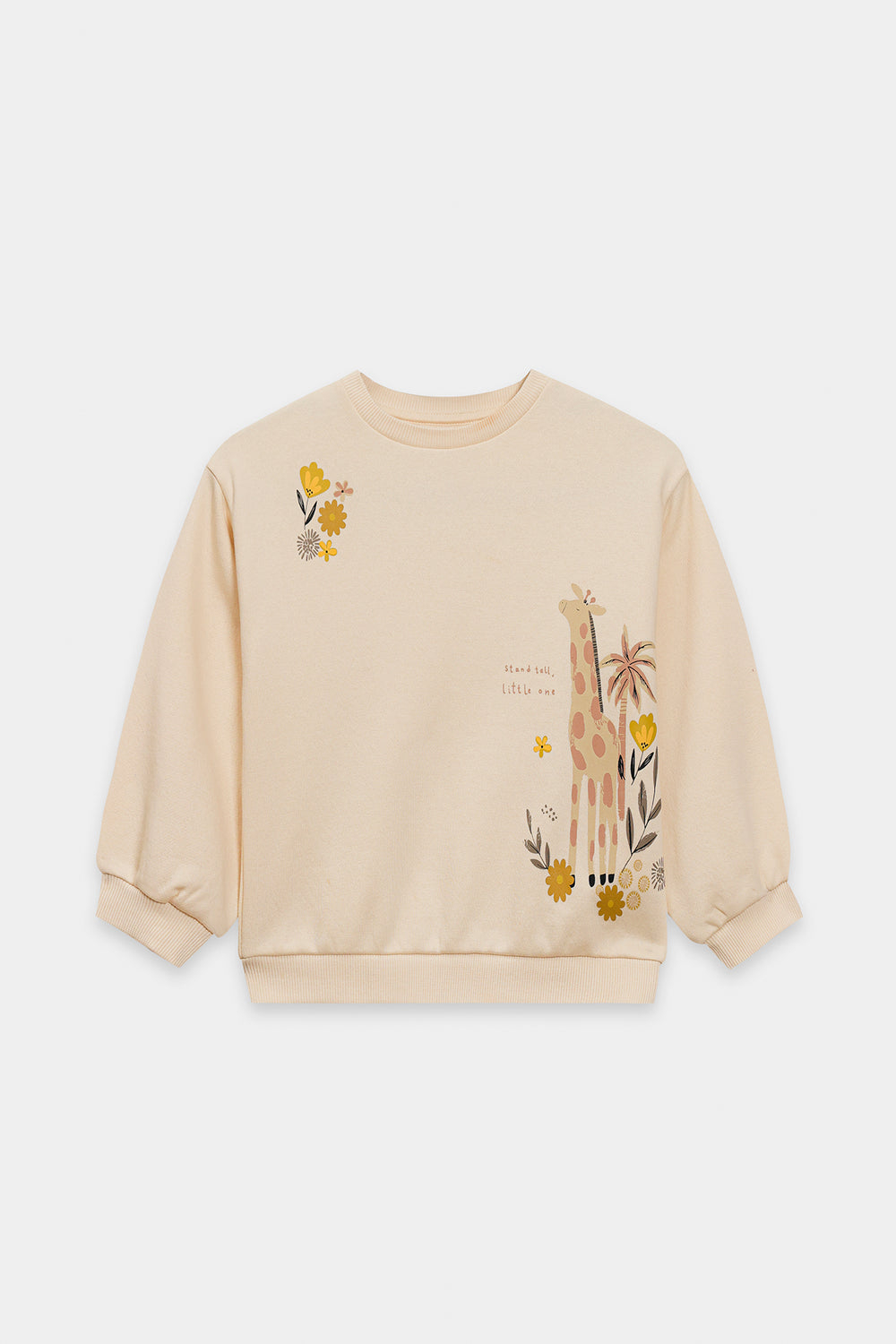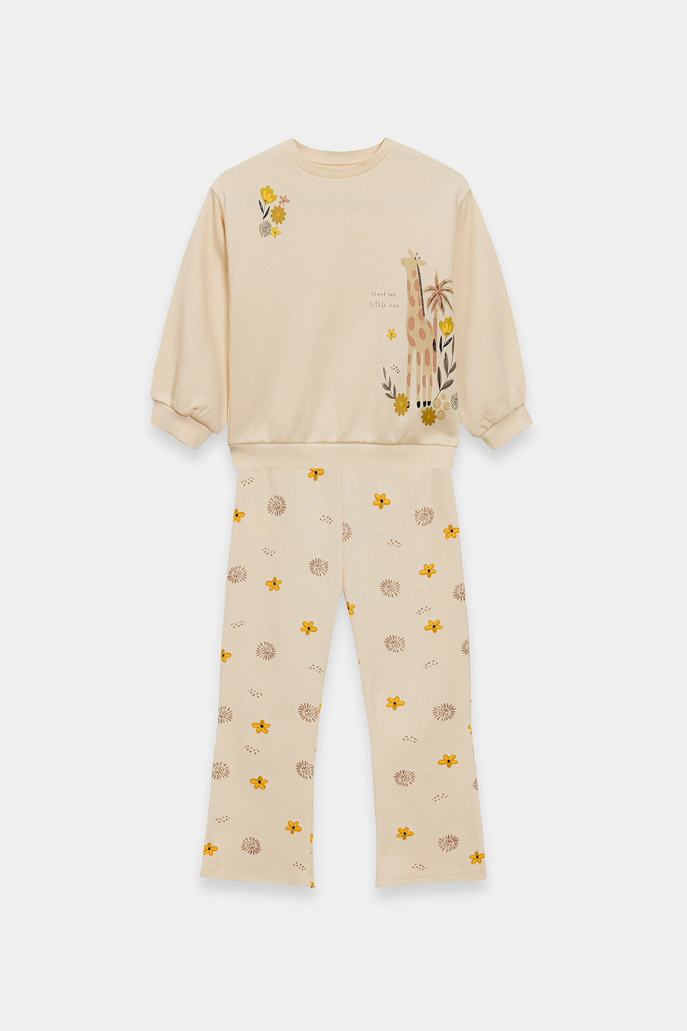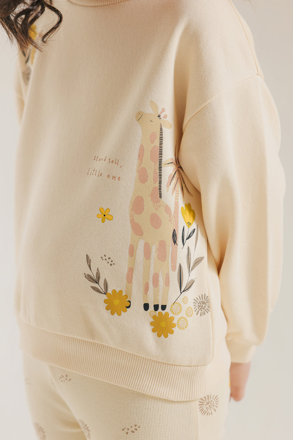 Elevate your child's everyday wardrobe with this thoughtfully curated coordinate set. The co-ord set features a classy off white sweatshirt adorned with a vibrant floral and giraffe illustrations, paired with relaxed fit straight trouser enriched with adorable prints. Crafted for comfort and versatility, this ensemble transitions seamlessly from leisurely afternoons to active play. The soft construction and breathable fabric ensure all-day wearability, while the coordinated design eliminates styling decisions. Perfect for parents seeking quality basics that combine playful aesthetics with practical comfort.