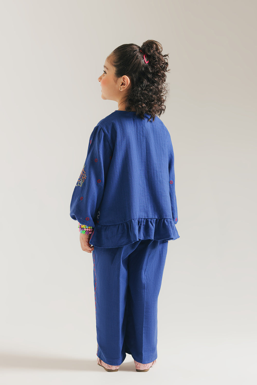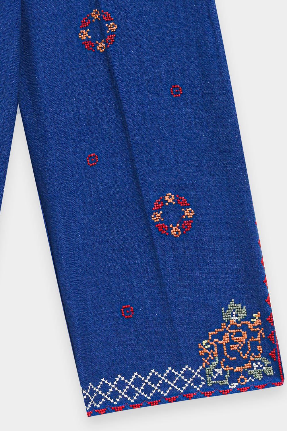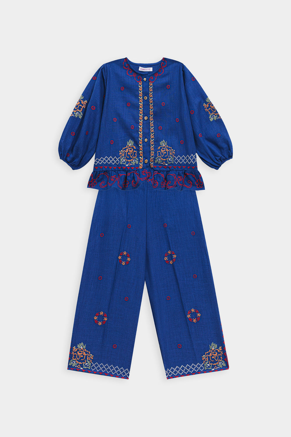 Step into a vibrant world of color and folk-inspired artistry with this charming blue embroidered co-ord set. This delightful two-piece, consisting of a top and coordinating trouser, is made from a rich lavender blue fabric with a subtle texture. The top features beautiful multi-colored embroidery in shades of red, orange, and blue, adorning the neckline, placket, cuffs, and the ruffled hemline. The trouser complement the top with scattered circular floral motifs and prominent geometric border patterns, created in matching threadwork at the hem. This set captures a perfect blend of comfortable casual wear and intricate, festive detailing.