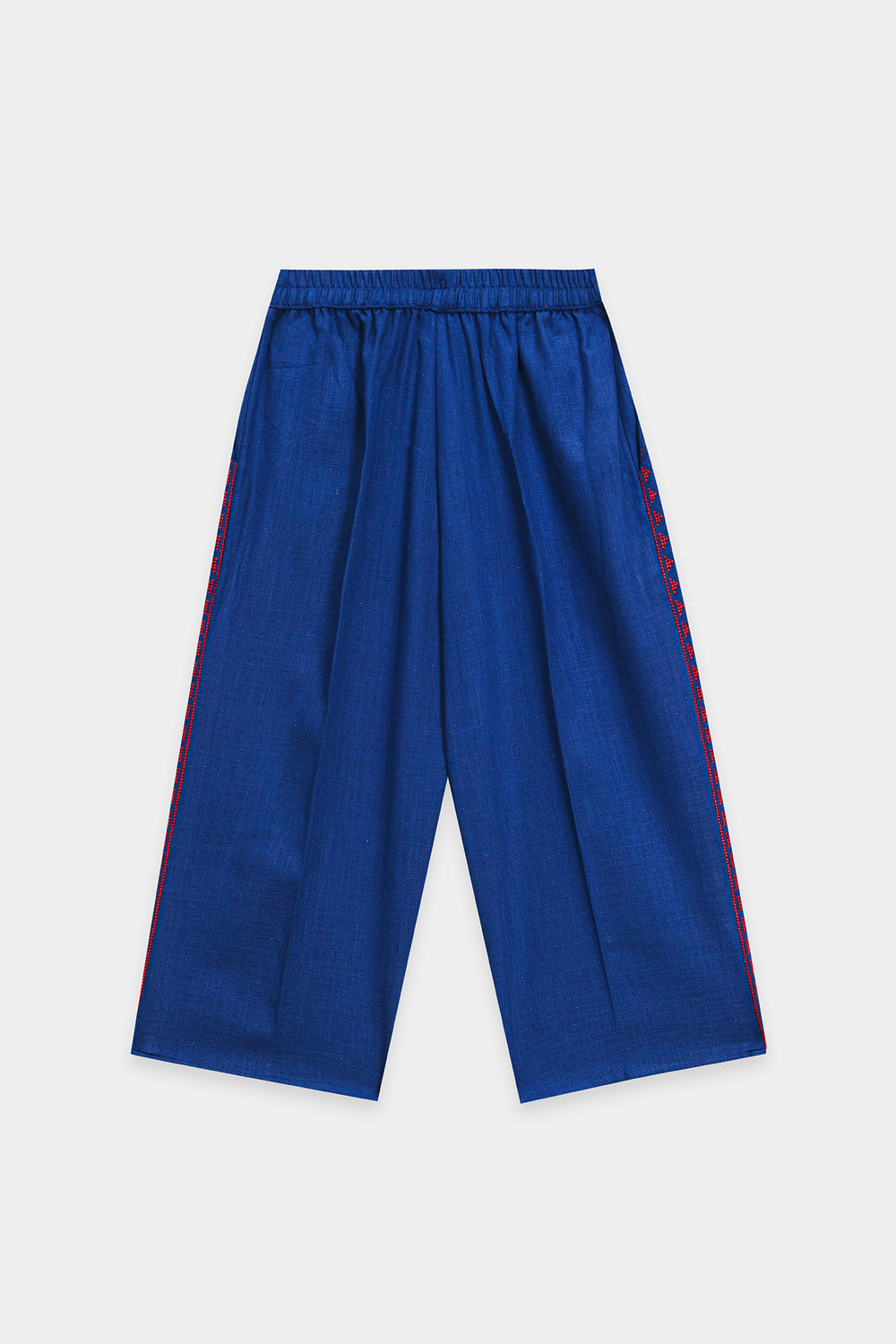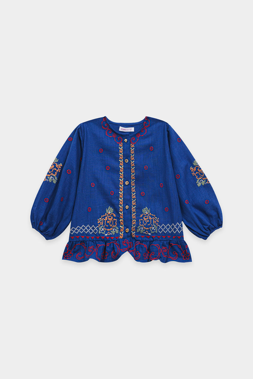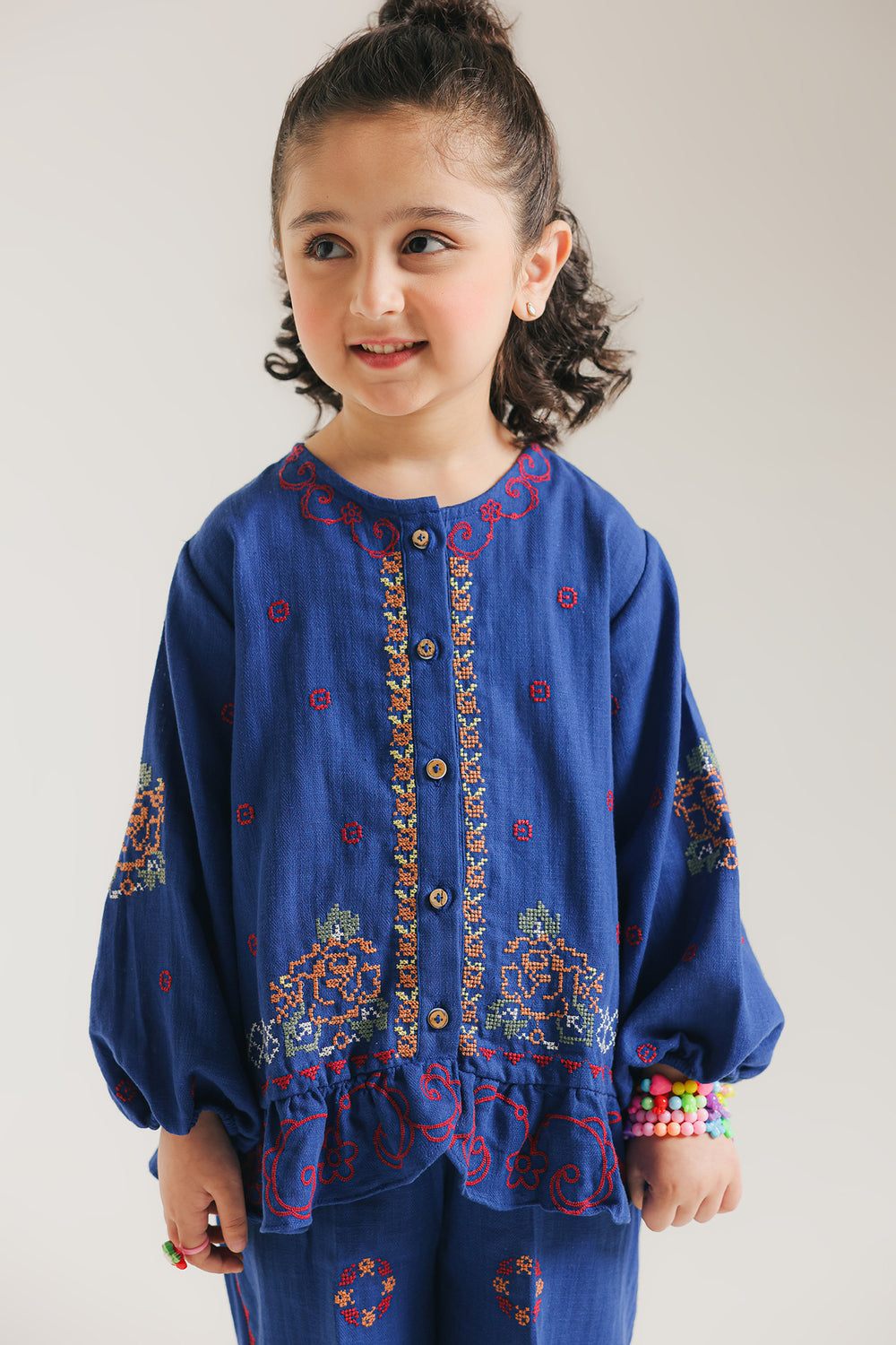 Step into a vibrant world of color and folk-inspired artistry with this charming blue embroidered co-ord set. This delightful two-piece, consisting of a top and coordinating trouser, is made from a rich lavender blue fabric with a subtle texture. The top features beautiful multi-colored embroidery in shades of red, orange, and blue, adorning the neckline, placket, cuffs, and the ruffled hemline. The trouser complement the top with scattered circular floral motifs and prominent geometric border patterns, created in matching threadwork at the hem. This set captures a perfect blend of comfortable casual wear and intricate, festive detailing.