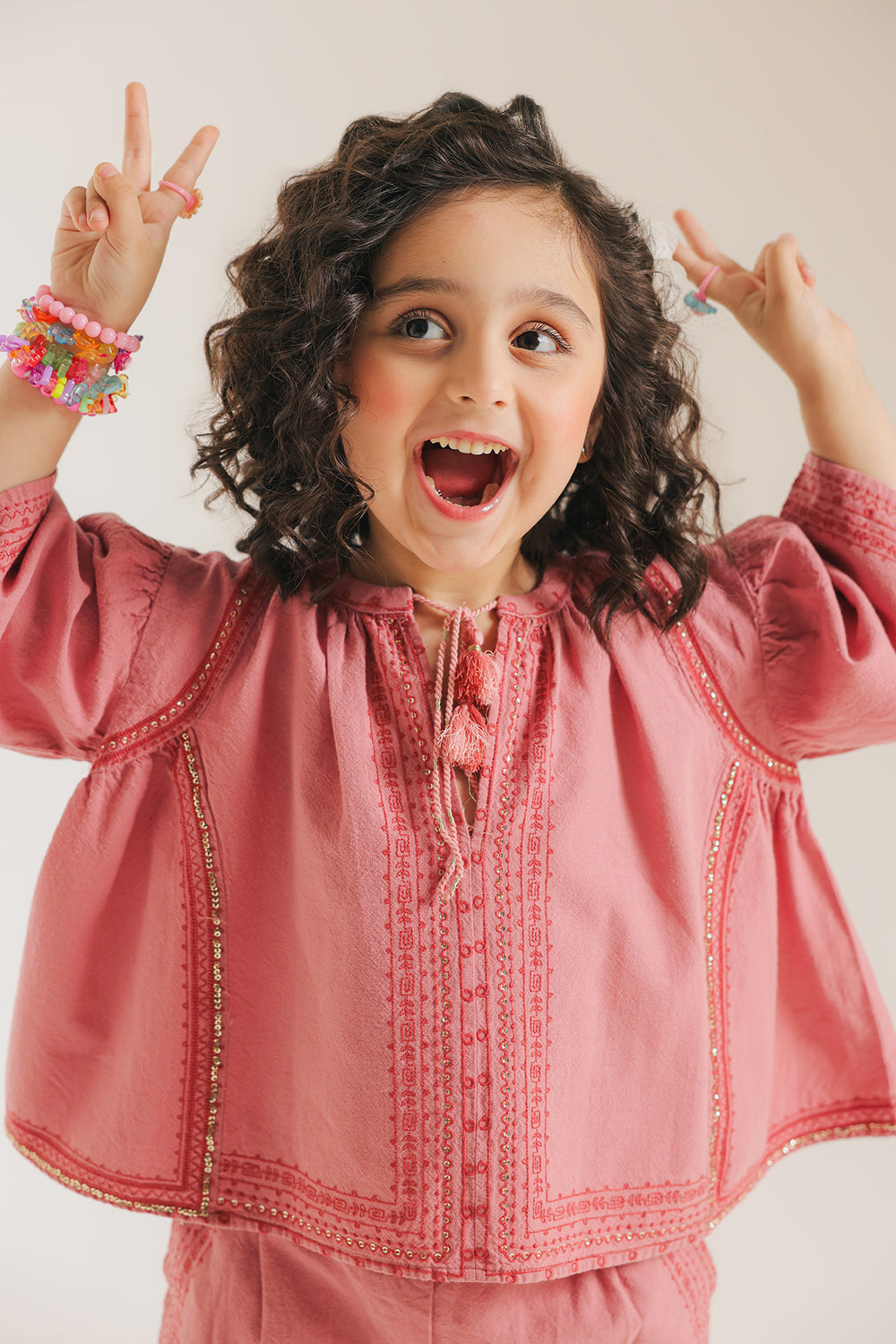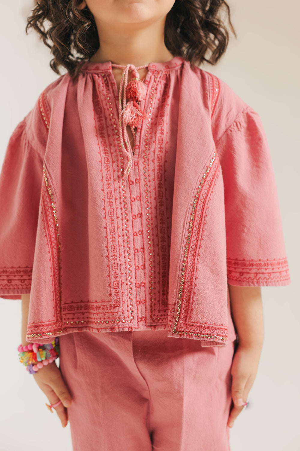 Elevate your kids wardrobe with this sophisticated co-ord set that seamlessly merges contemporary design with timeless elegance. The ensemble comprises a soft pink top and coordinating wide-leg trousers, unified by an intricate design. The peplum silhouette loose fit top features refined pleated detailing and exquisite embroidery with scintillating details. Paired with a classy wide-leg embroidered trouser, this thoughtfully curated two-piece strikes the perfect balance between polished and approachable, making it an ideal selection for occasions demanding both style and comfort.