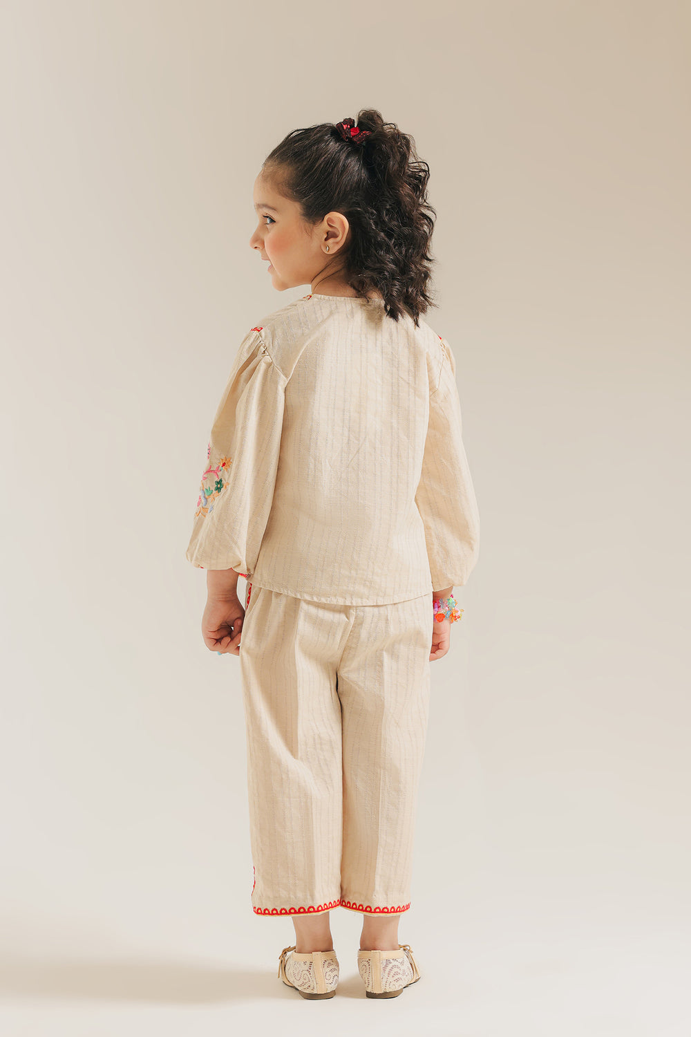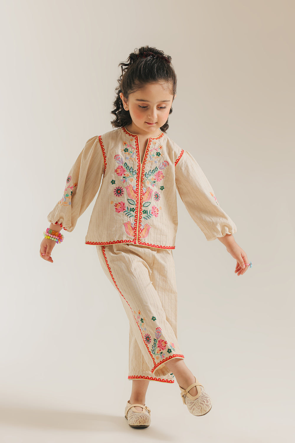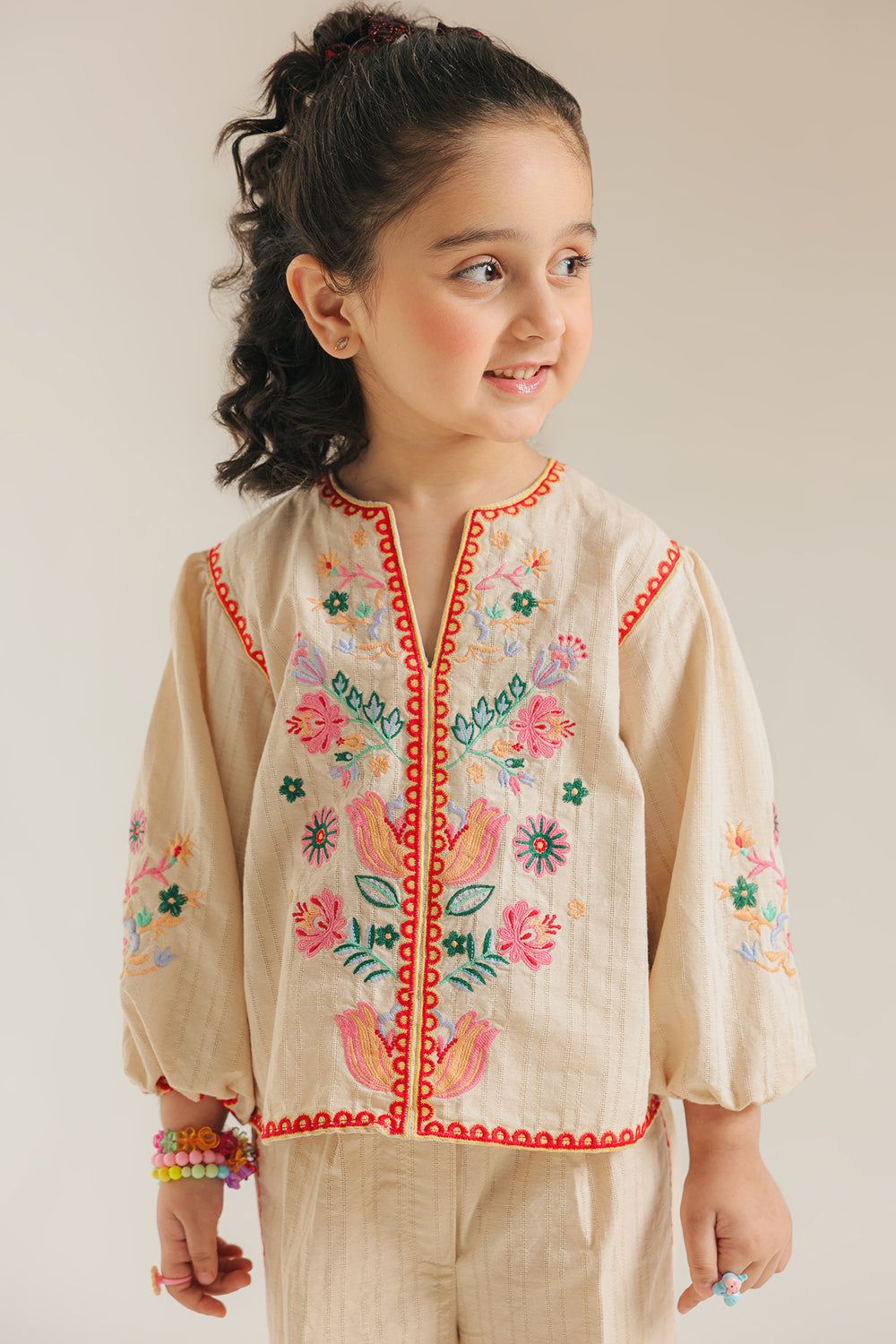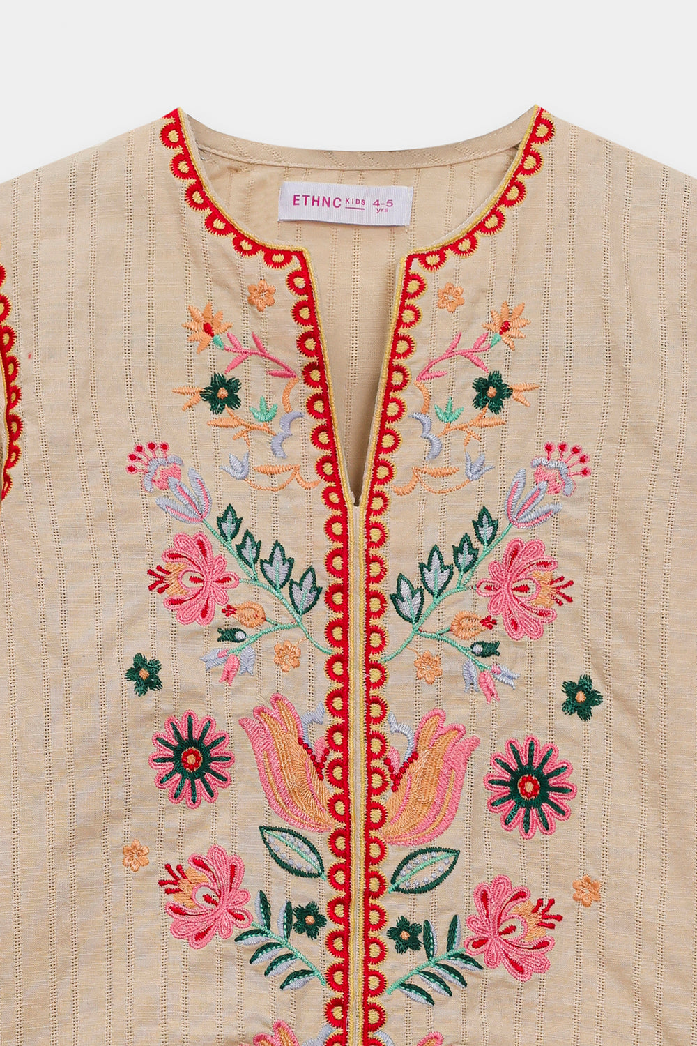 Capture the spirit of bohemian playfulness with this lovely embroidered beige co-ord set. This charming two-piece ensemble for children features both a peasant-style blouse and coordinating trouser, crafted from a light, natural-toned fabric in cream beige. The top showcases intricate, multi-colored floral and geometric embroidery across the yoke and sleeves, finished with a contrasting red trim at the neckline and playful voluminous long sleeves. The matching trouser with delicate vertical stripe texture, feature coordinating floral embroidery detail at the ankles, making this set a perfect combination of comfort and enchanting handcrafted style for any fun occasion.