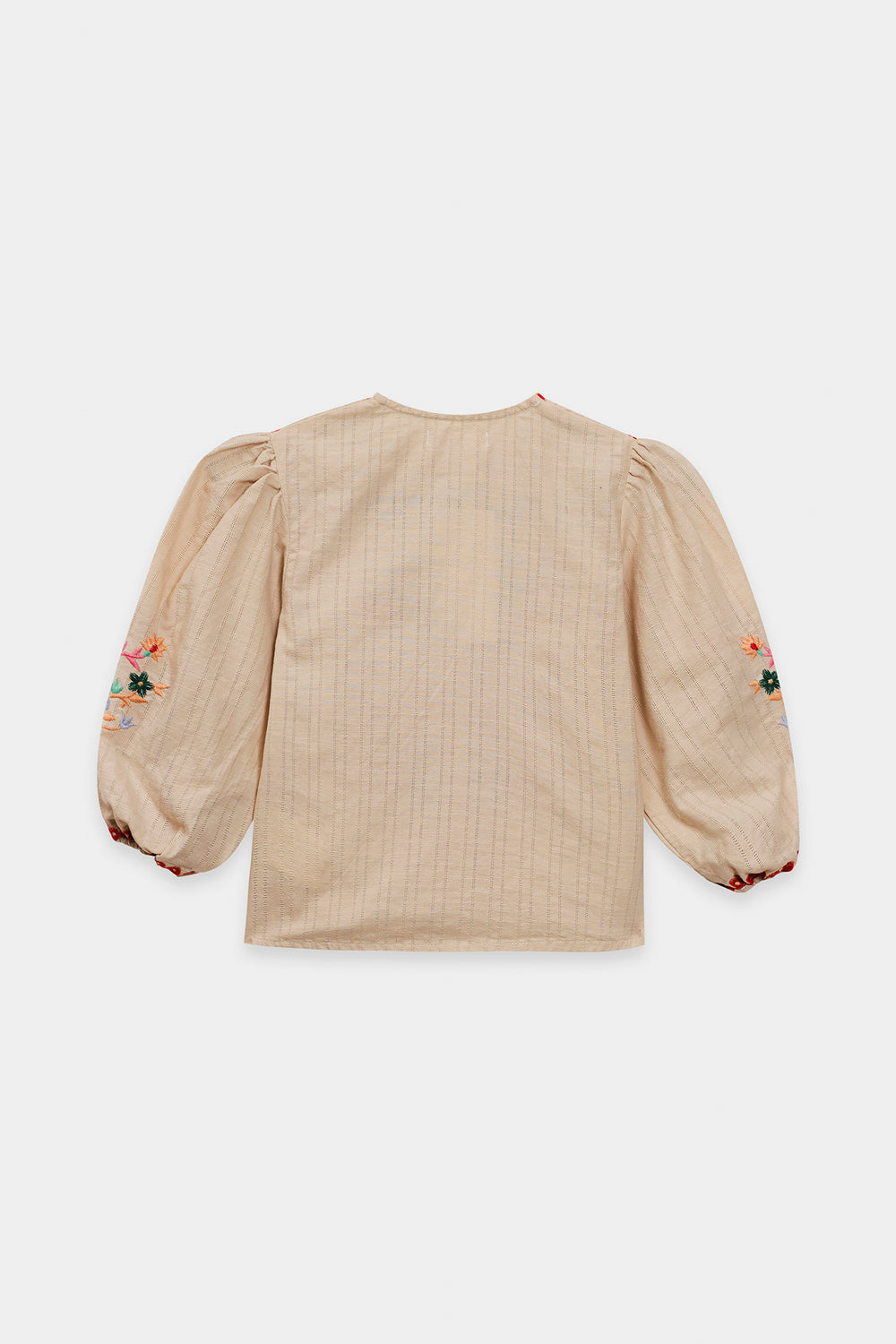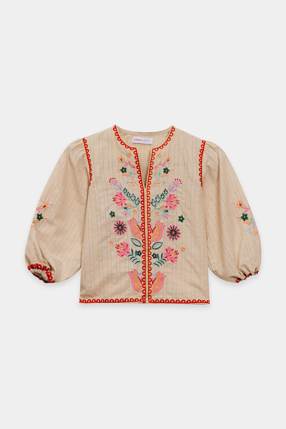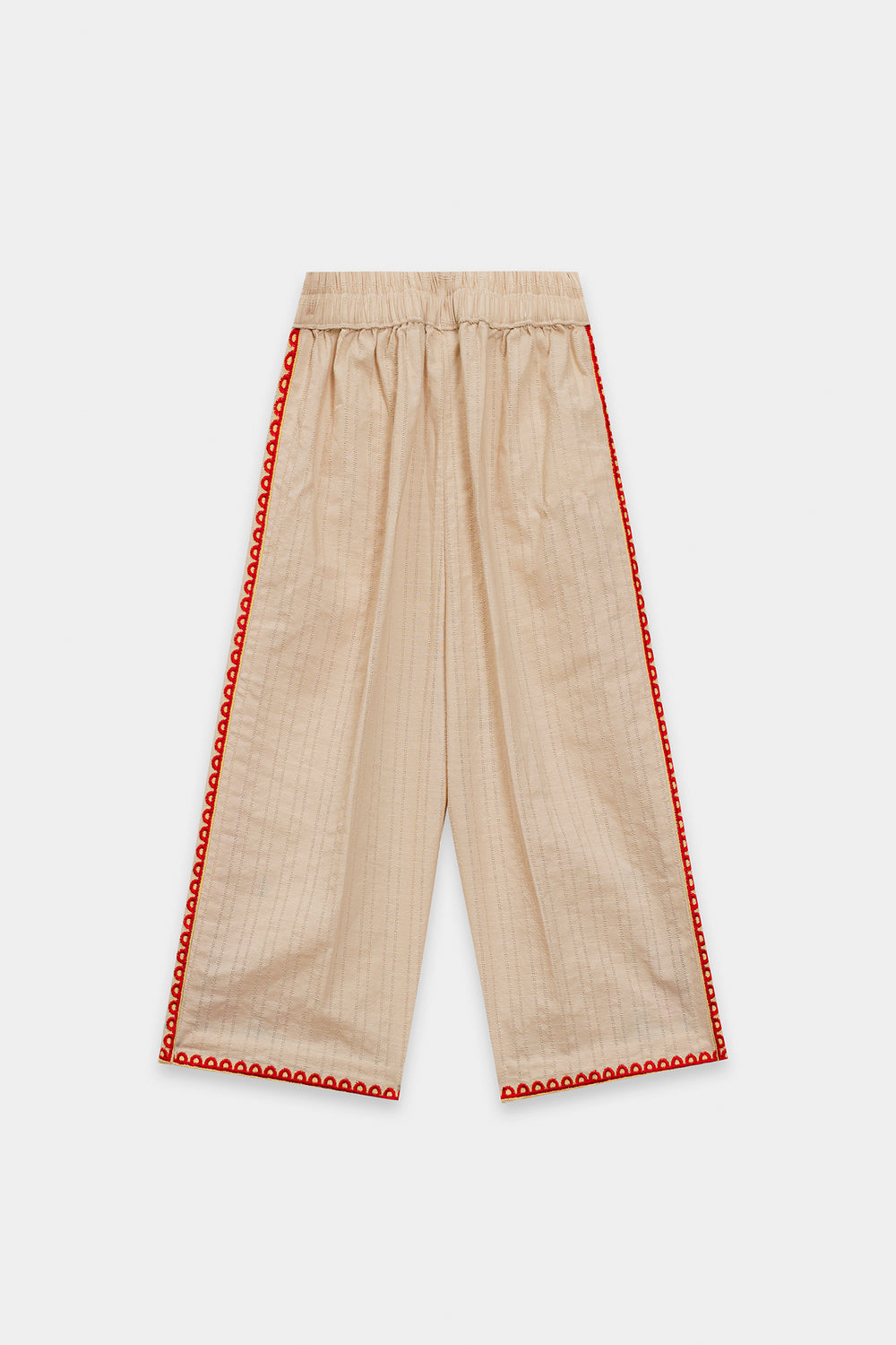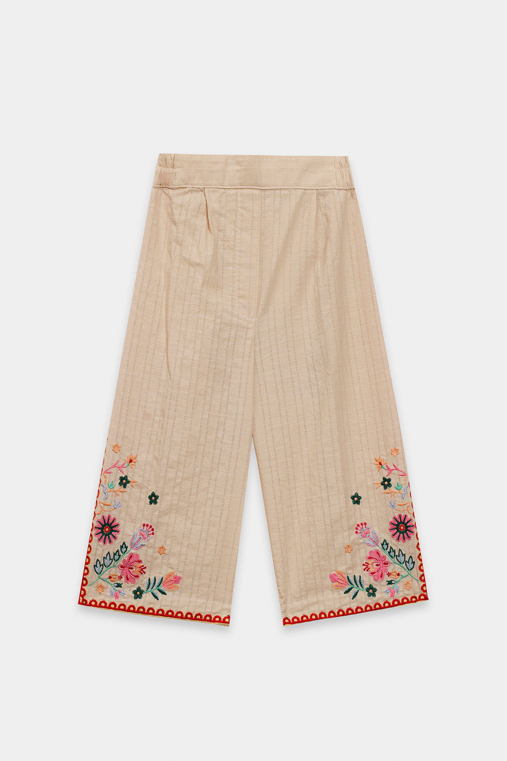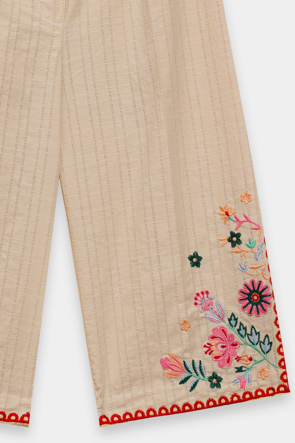 Capture the spirit of bohemian playfulness with this lovely embroidered beige co-ord set. This charming two-piece ensemble for children features both a peasant-style blouse and coordinating trouser, crafted from a light, natural-toned fabric in cream beige. The top showcases intricate, multi-colored floral and geometric embroidery across the yoke and sleeves, finished with a contrasting red trim at the neckline and playful voluminous long sleeves. The matching trouser with delicate vertical stripe texture, feature coordinating floral embroidery detail at the ankles, making this set a perfect combination of comfort and enchanting handcrafted style for any fun occasion.
