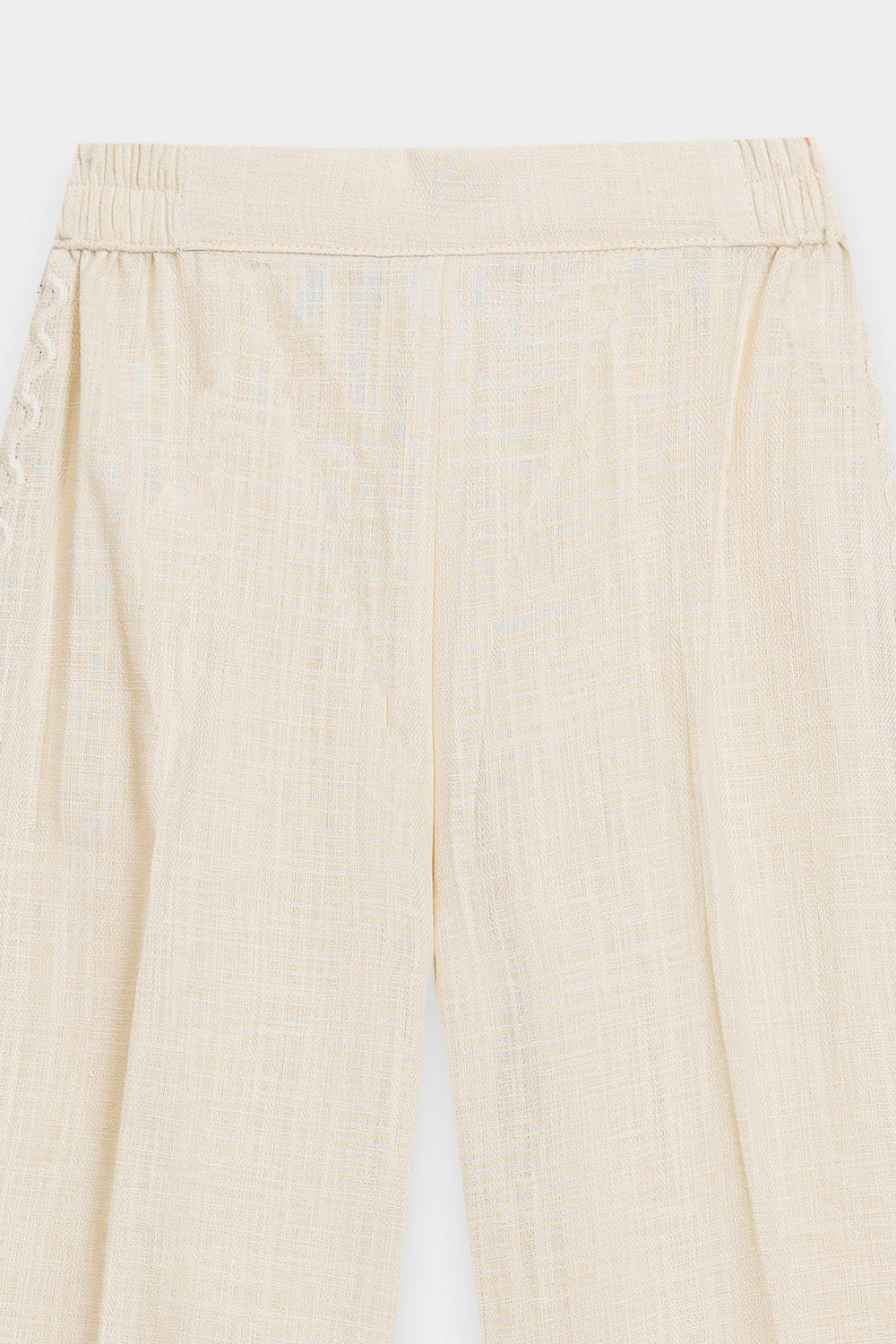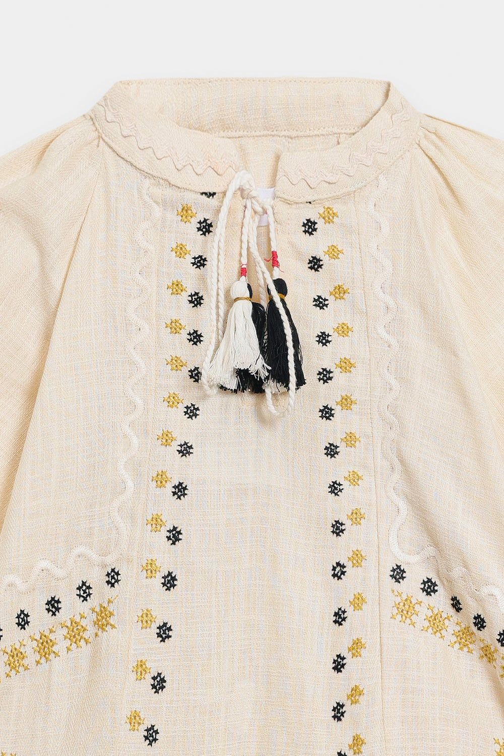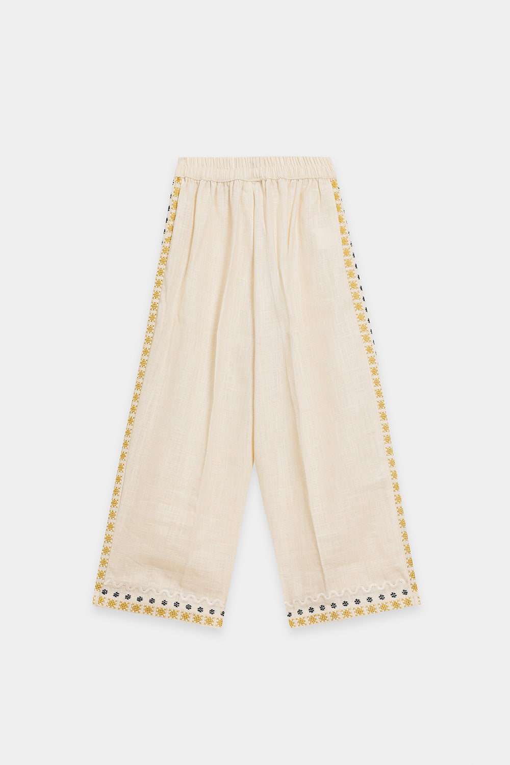 Create a playful and comfortable look with this charming embroidered co-ord set. The set features a lightweight, off-white kurti with a gathered neckline and playful tassels. The top is adorned with delicate embroidered motifs in yellow and black along the yoke, front, and balloon sleeves. The coordinating wide-leg trouser is finished with matching embroidery near the hem. This breezy ensemble is perfect for comfortable and stylish daywear.