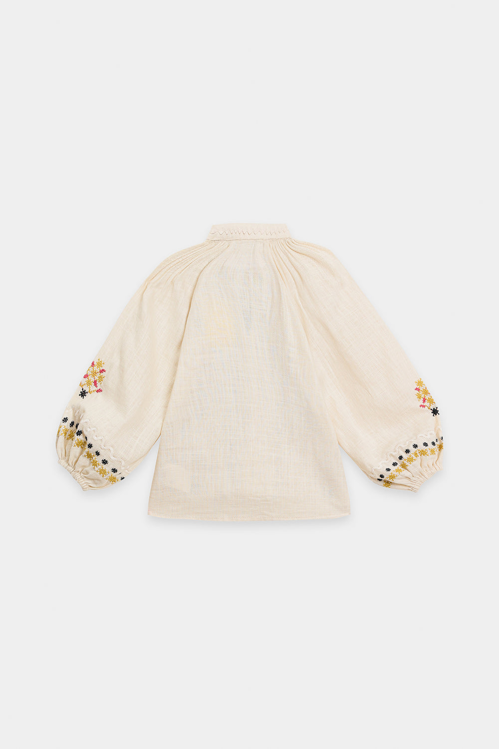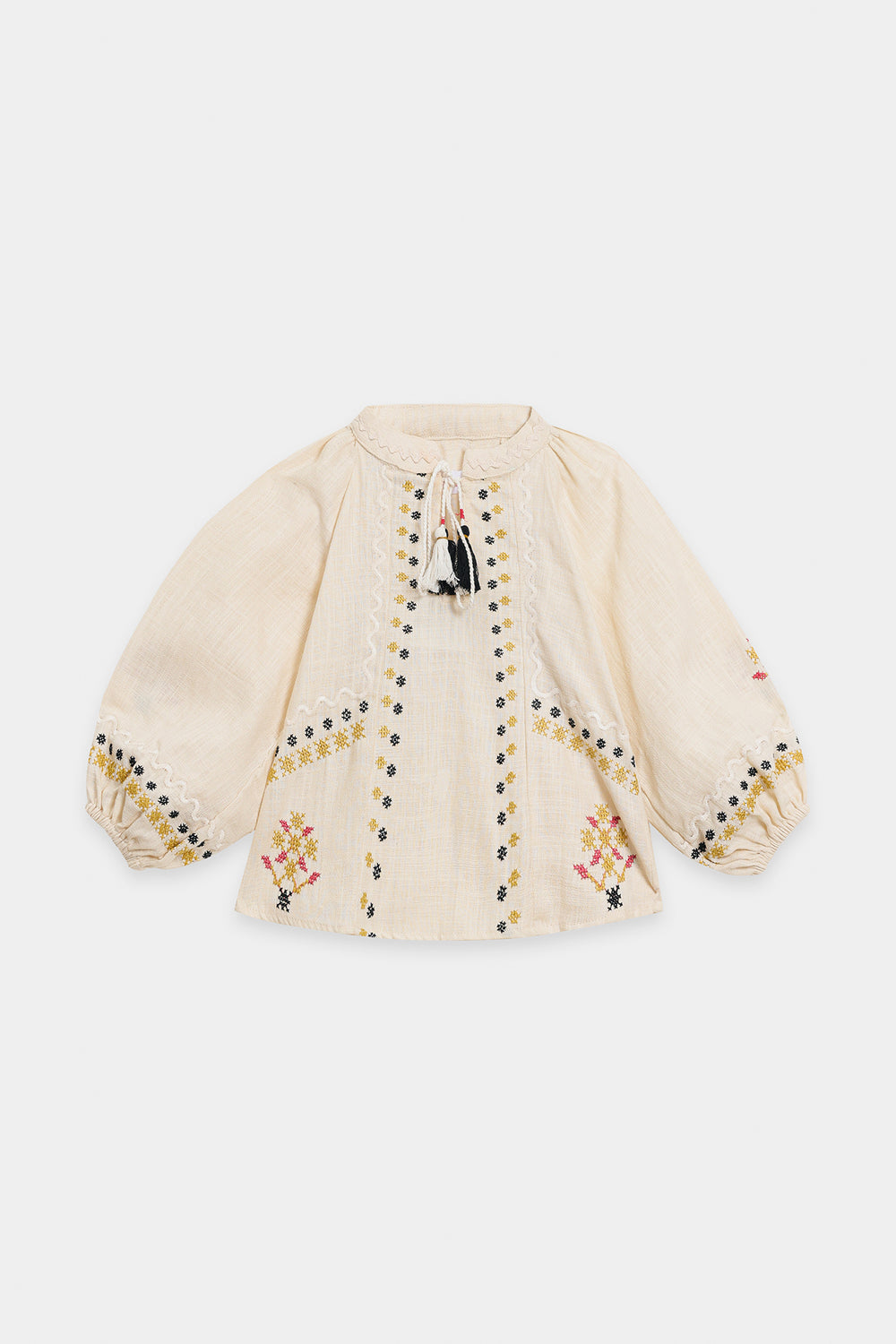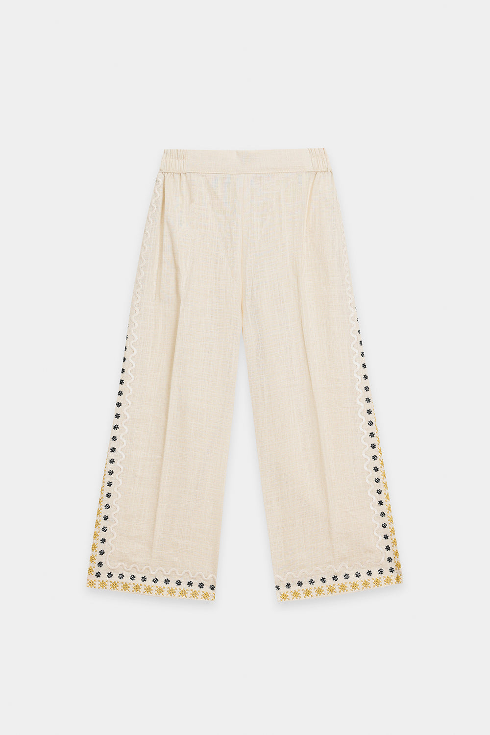 Create a playful and comfortable look with this charming embroidered co-ord set. The set features a lightweight, off-white kurti with a gathered neckline and playful tassels. The top is adorned with delicate embroidered motifs in yellow and black along the yoke, front, and balloon sleeves. The coordinating wide-leg trouser is finished with matching embroidery near the hem. This breezy ensemble is perfect for comfortable and stylish daywear.