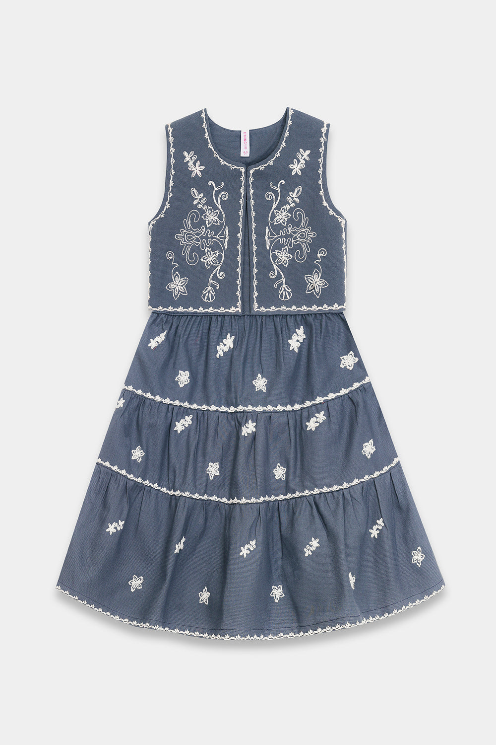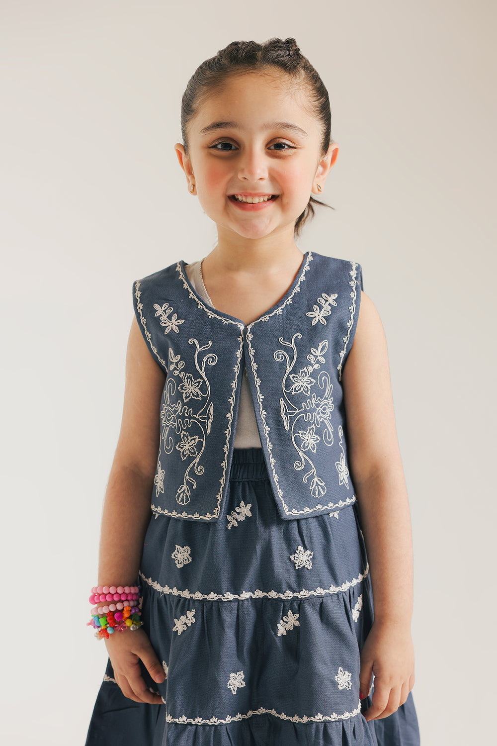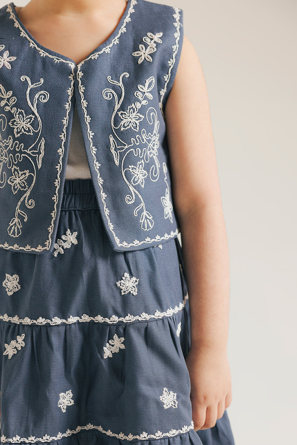 Introduce your child to elegance with this stunning three-piece co-ord set in rich blue. The collection features a beautifully embroidered top, matching waistcoat, and coordinating skirt, all adorned with delicate white embroidery details. Perfect for special occasions, celebrations, or festive gatherings, this set combines traditional charm with modern style. The coordinated pieces work seamlessly together, making dressing up effortless and fun. Crafted for comfort and durability, this ensemble is ideal for kids who love to look their best.