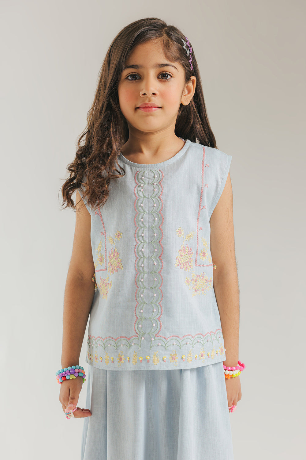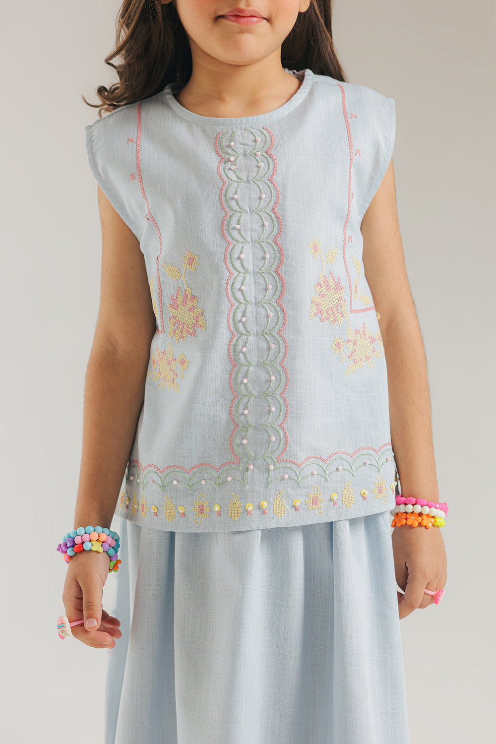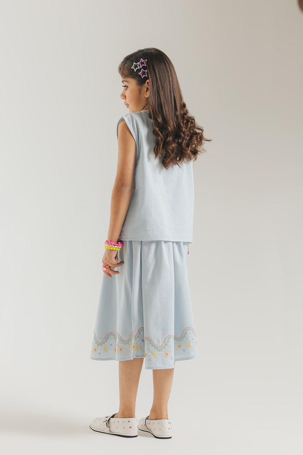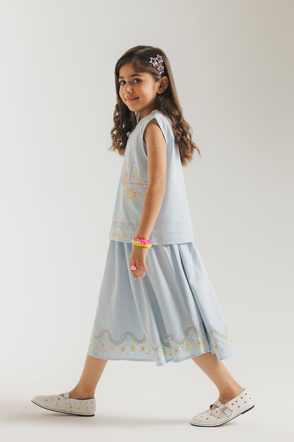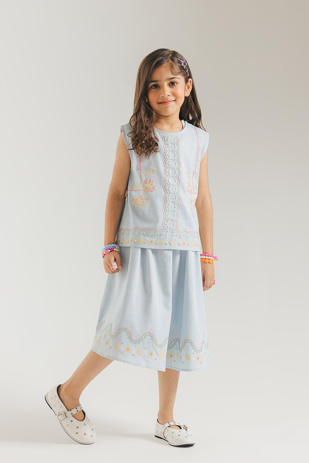 This enchanting light-blue co-ord set blends breezy comfort with artisanal flair. The sleeveless top features shimmering pearl accents and delicate floral embroidery. Paired with matching wide-leg capri boasting a coordinated embroidered border, this lightweight ensemble is perfect for keeping her stylish and cool during festive celebrations.