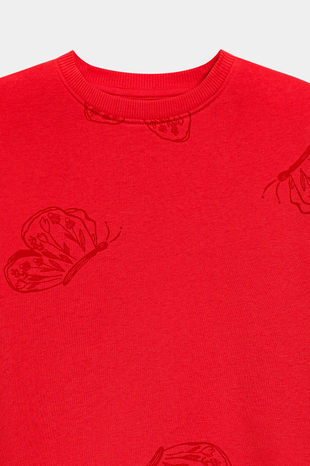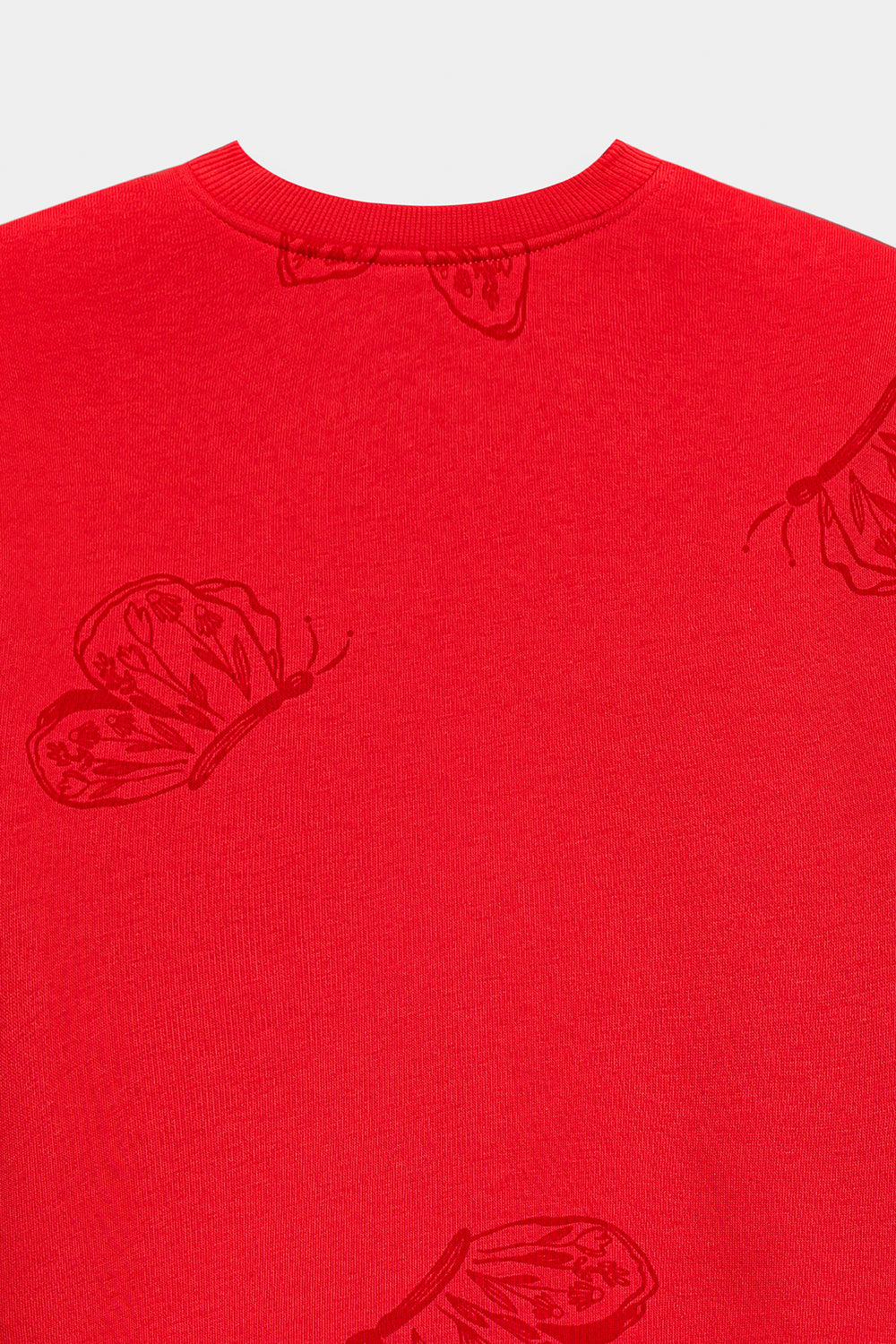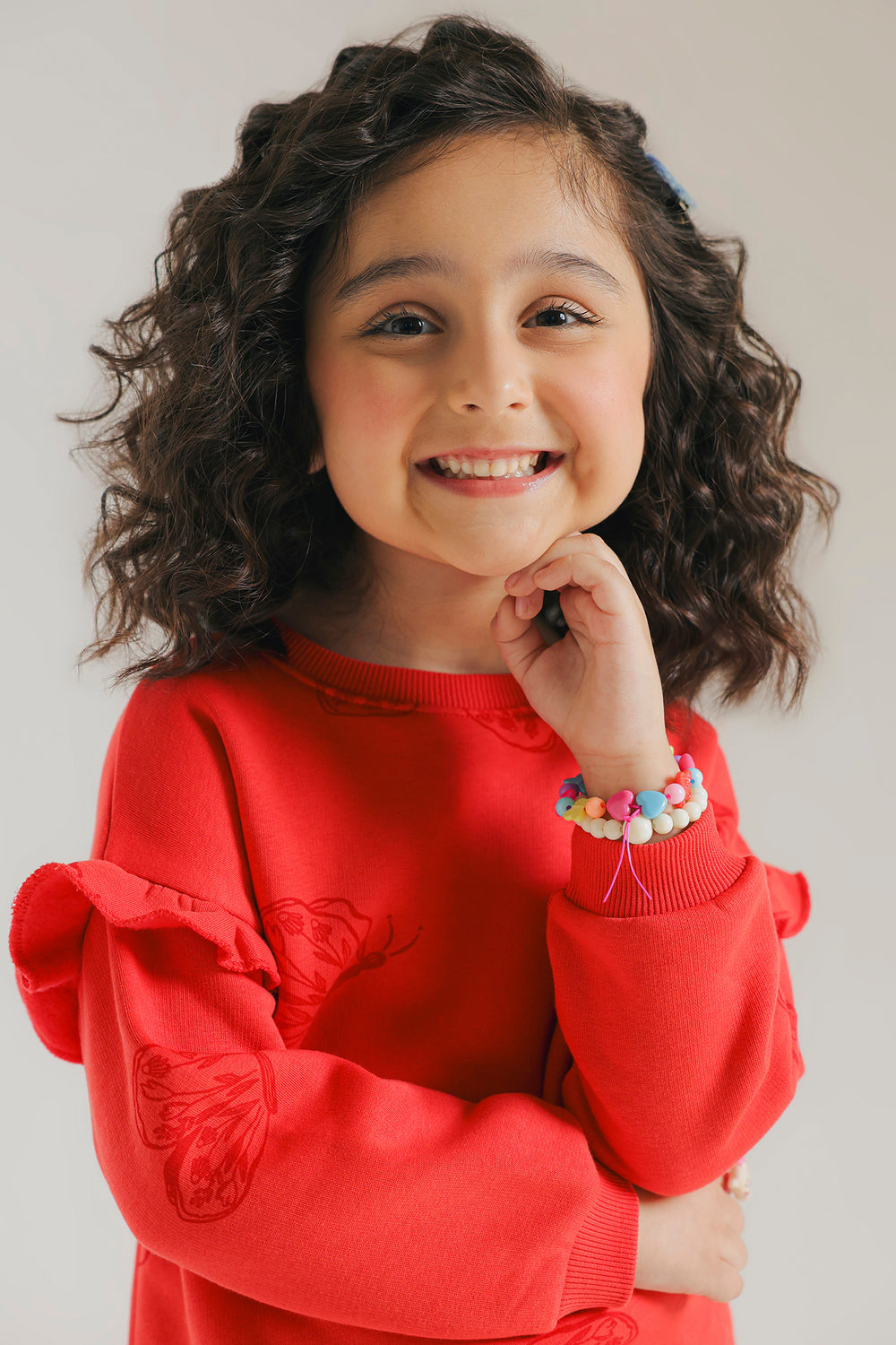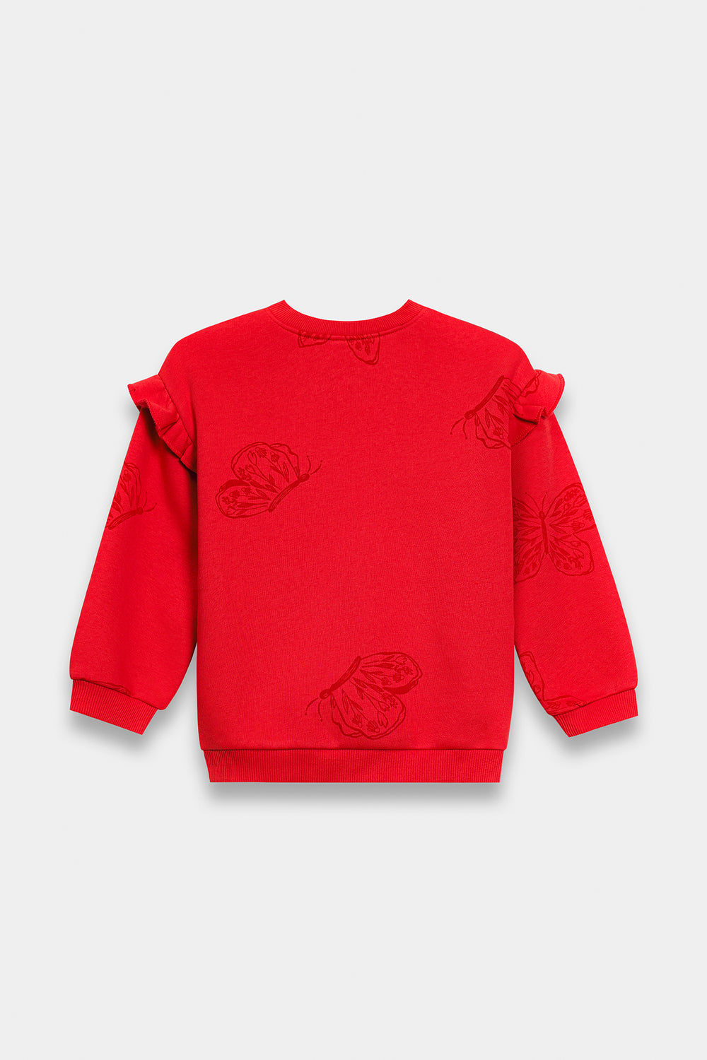 Brighten her casual wardrobe with this vibrant strawberry red ruffled sweatshirt. This playful piece is designed to combine cozy warmth with a touch of whimsical flair, making it an instant favorite for everyday adventures. The sweatshirt features a soft, textured knit in a bold red hue, elevated by unique ruffle detailing along the shoulders. Subtle, tonal butterfly-inspired print onto the fabric, add a delicate layer of visual interest. With its comfortable crew neckline and snug ribbed cuffs, it offers a perfect fit that stays in place during play. Style it with floral-embroidered denim and colorful sneakers for an effortlessly cheerful and coordinated look.