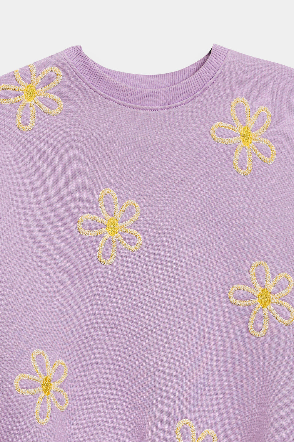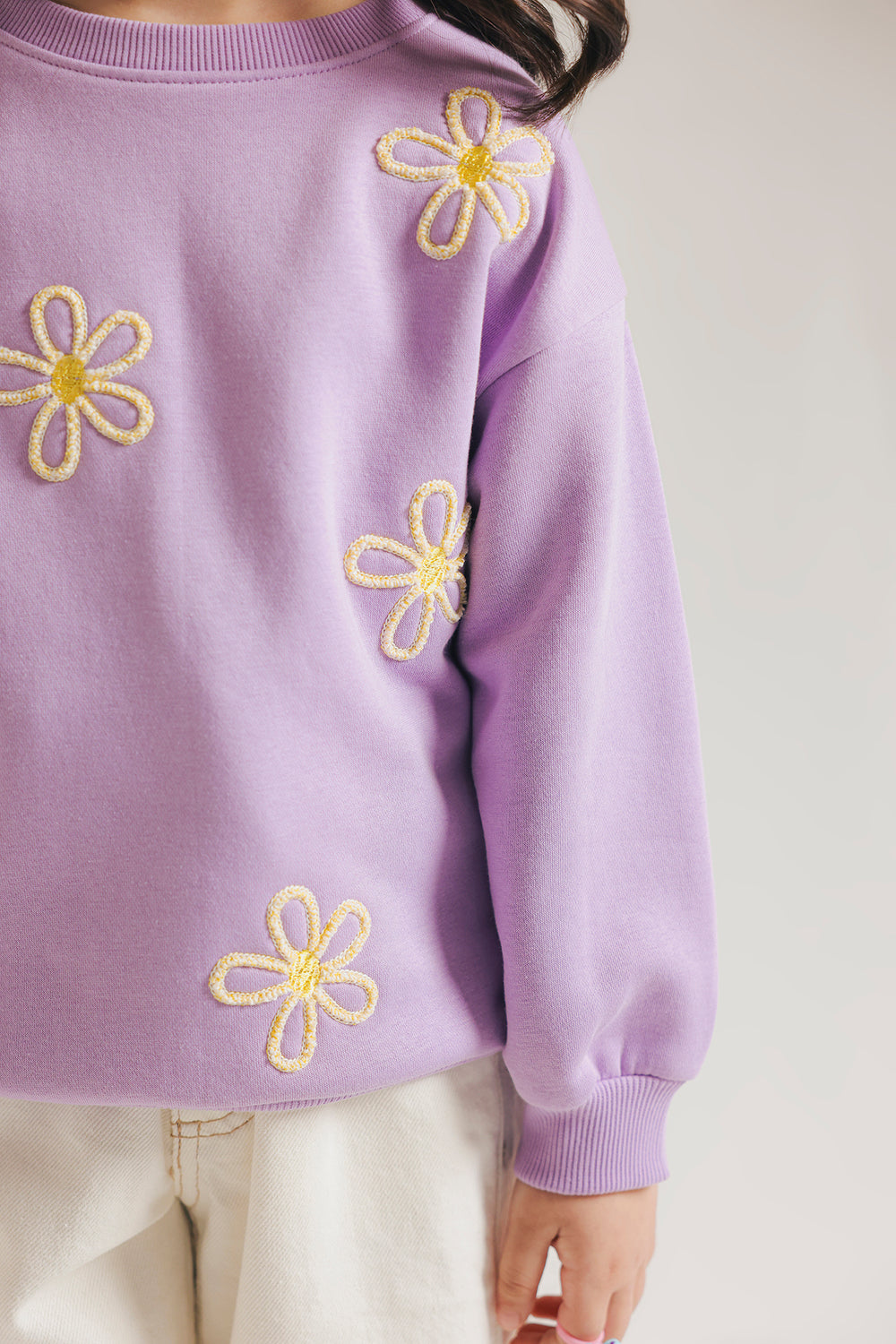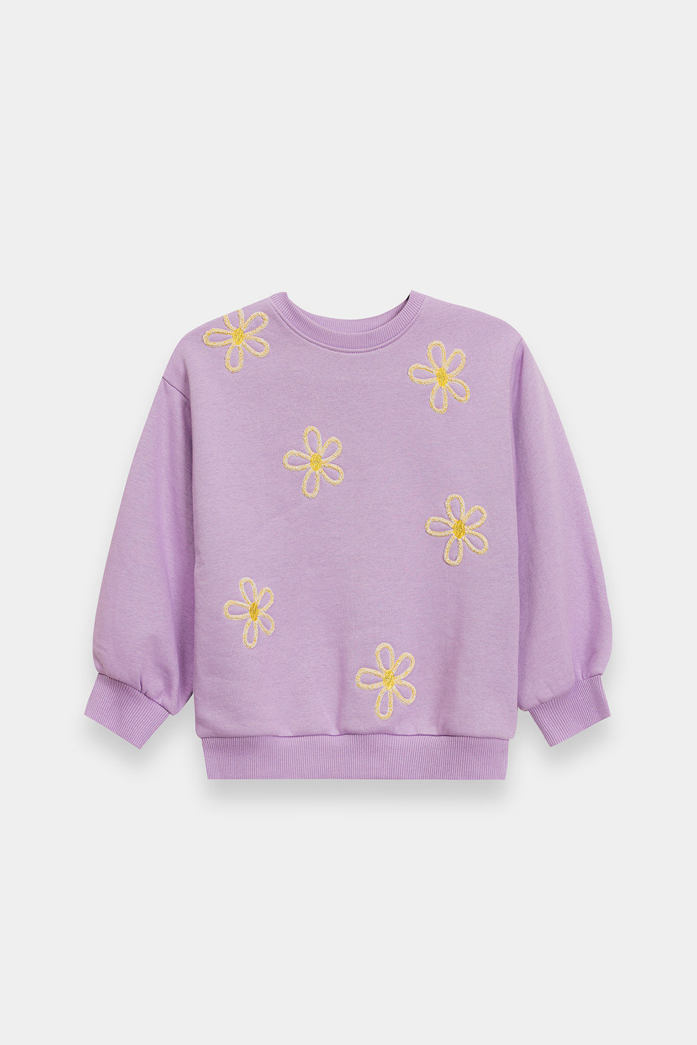 Add a soft pop of color to her everyday wardrobe with this kids cozy lavender sweatshirt. Crafted from a plush knit fabric, it features charming yellow floral embroidery scattered across the front for a playful, cheerful touch. Designed with a classic round neckline, ribbed cuffs, and hem, it ensures a snug yet comfortable fit—perfect for cooler days and casual outings.