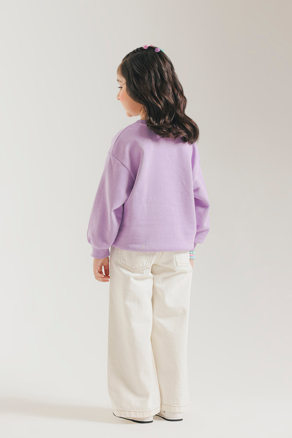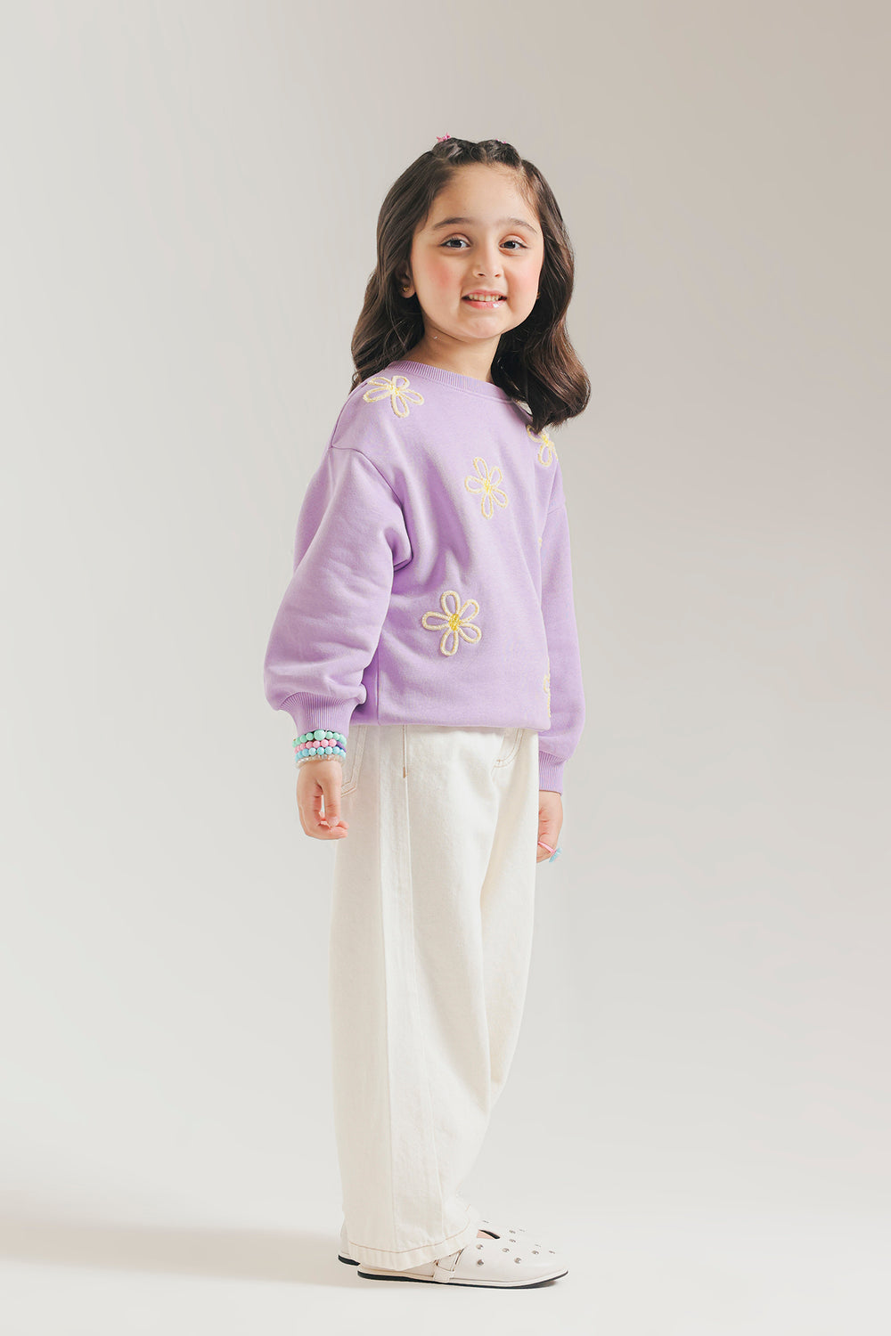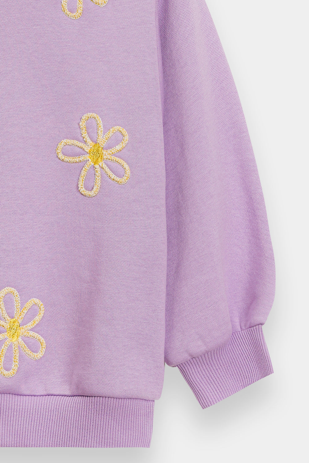Add a soft pop of color to her everyday wardrobe with this kids cozy lavender sweatshirt. Crafted from a plush knit fabric, it features charming yellow floral embroidery scattered across the front for a playful, cheerful touch. Designed with a classic round neckline, ribbed cuffs, and hem, it ensures a snug yet comfortable fit—perfect for cooler days and casual outings.
