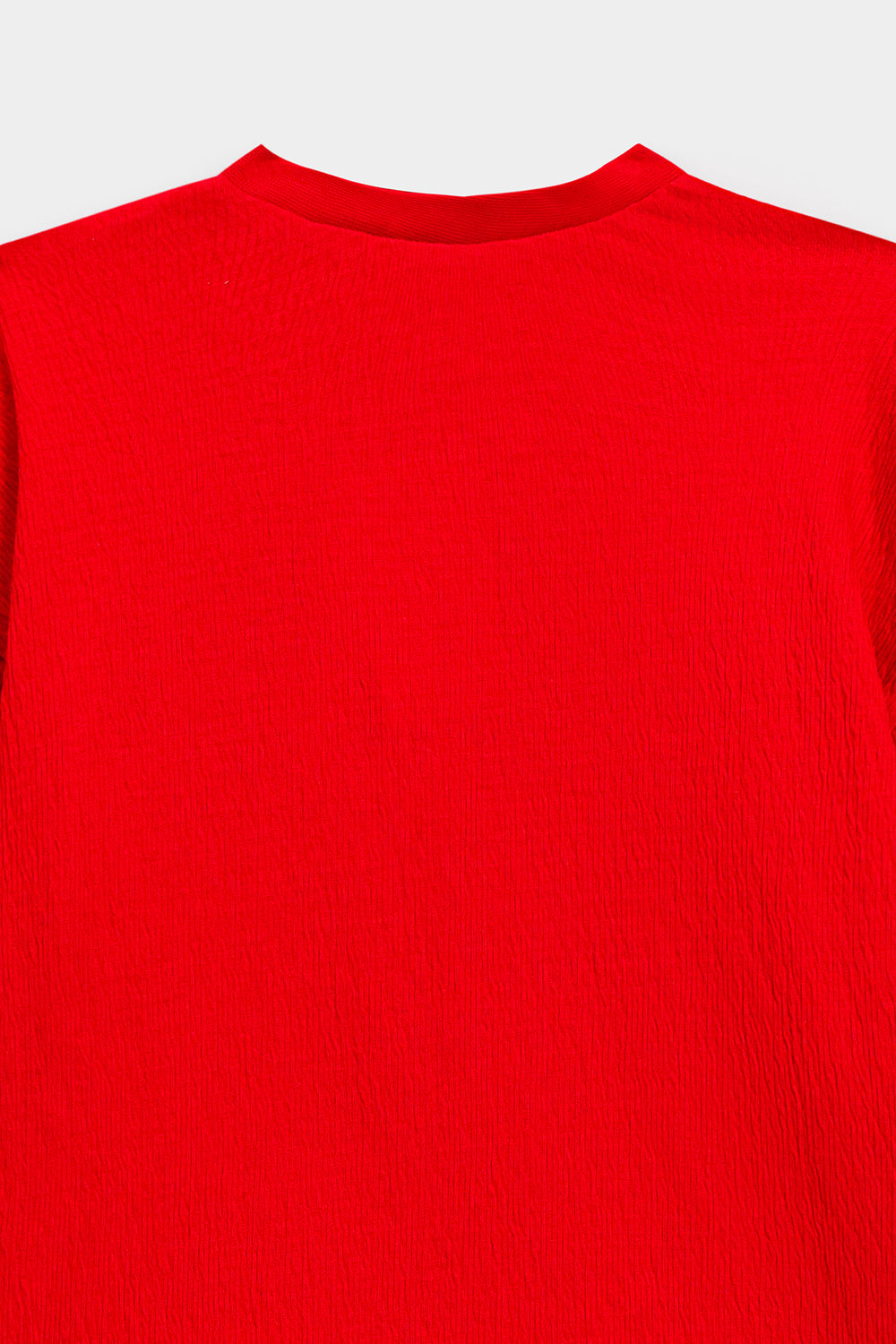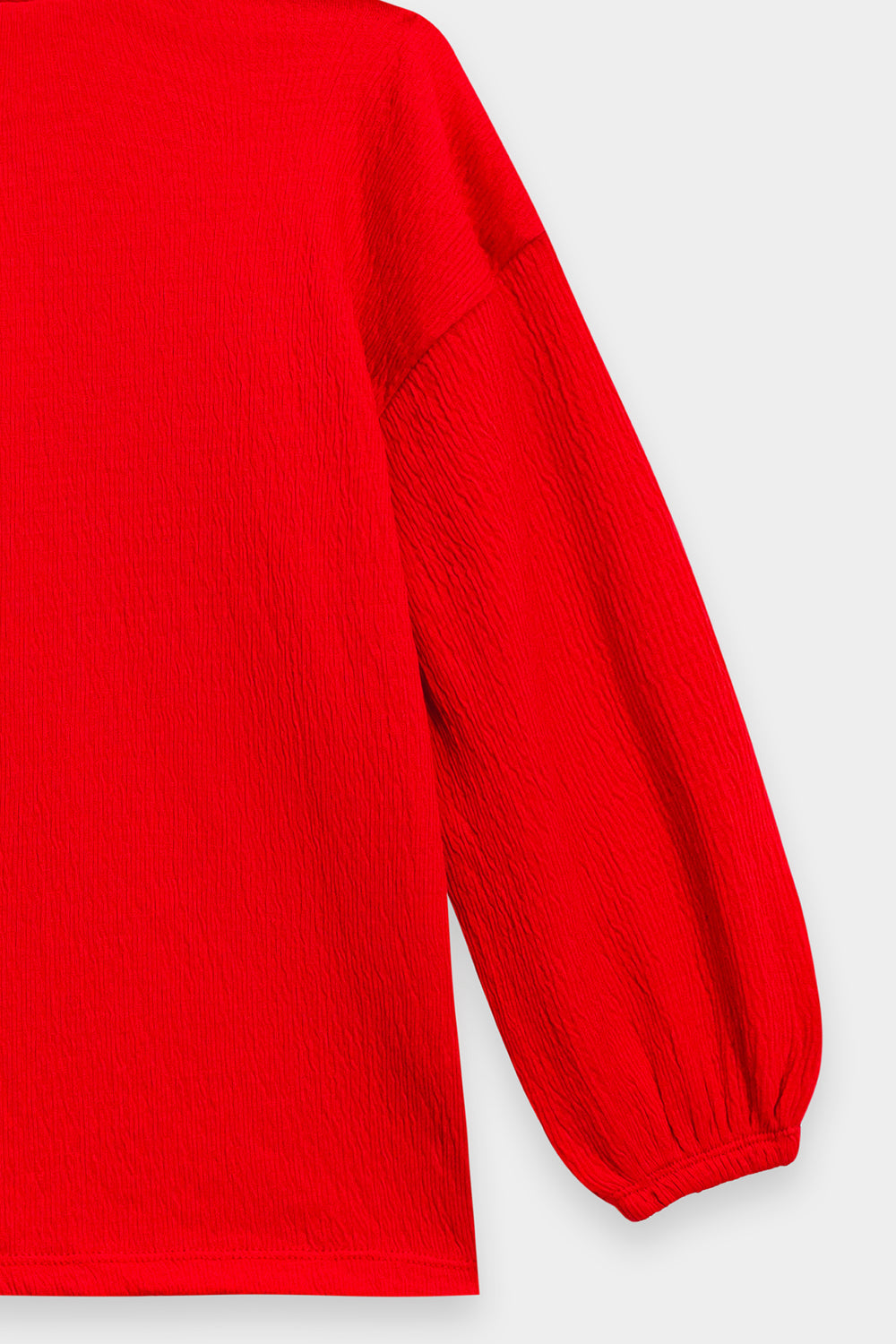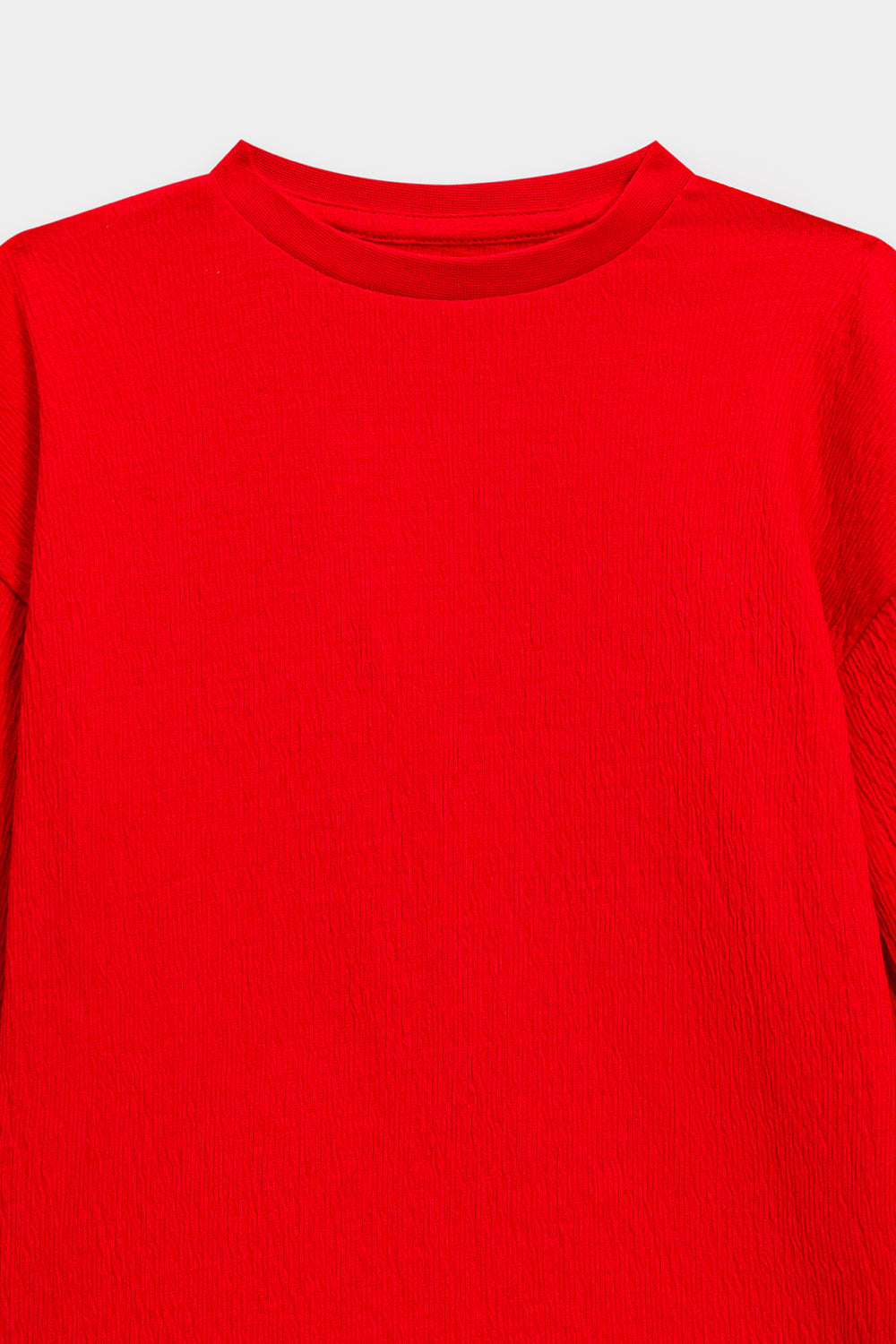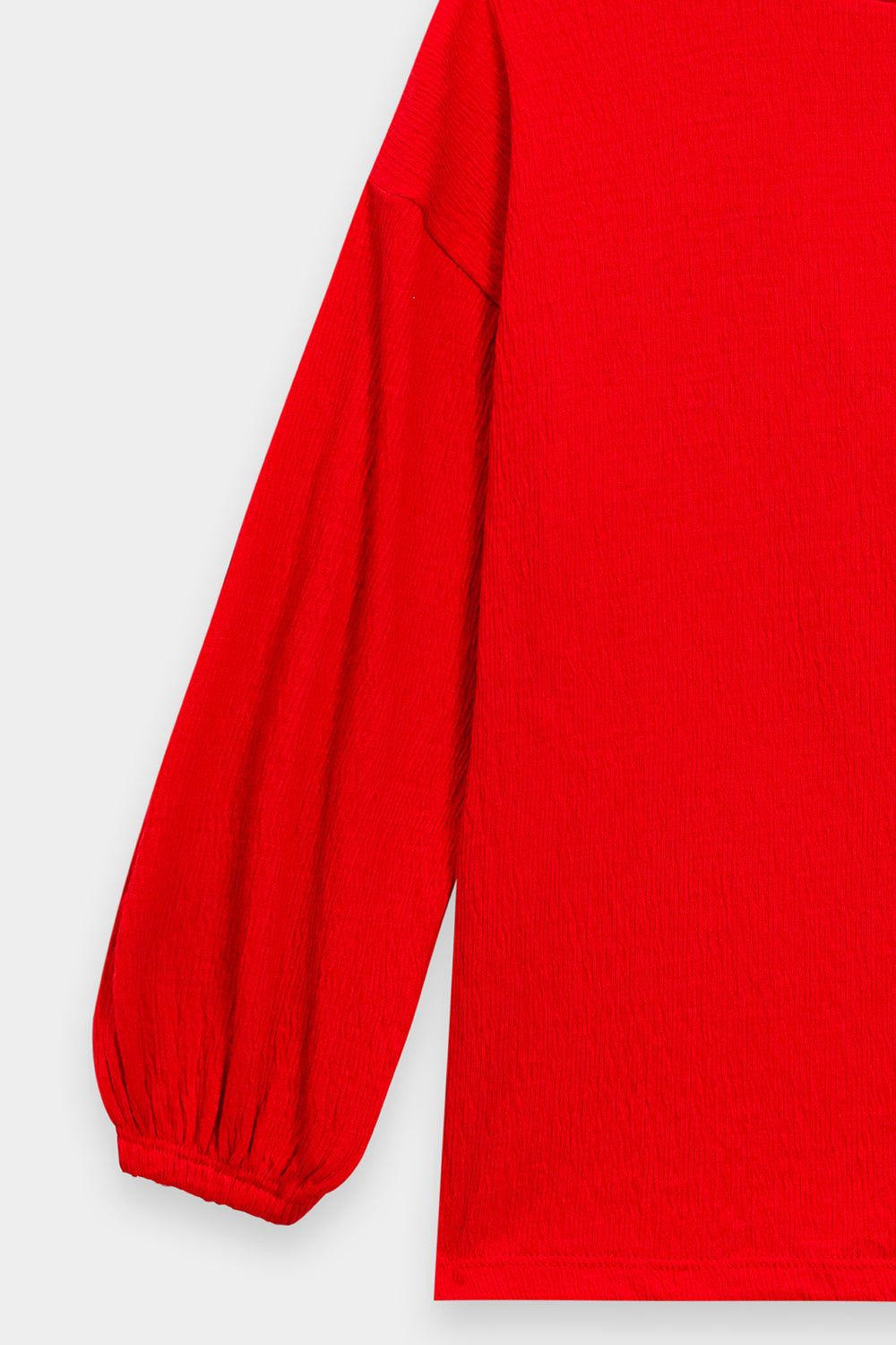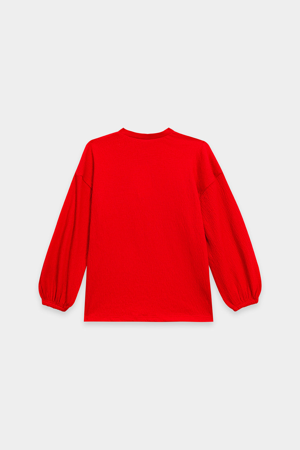 Brighten any day with the striking texture of this vibrant top. This comfortable, long-sleeved top is rendered in a powerful solid red hue. It features a unique, all-over textured fabric, giving the piece depth and tactile appeal. The design balances the classic crew neck and straight bodice with voluminous, puffed sleeves that gather elegantly at the cuff. This top is a perfect way to inject bold color and playful volume into your contemporary wardrobe.