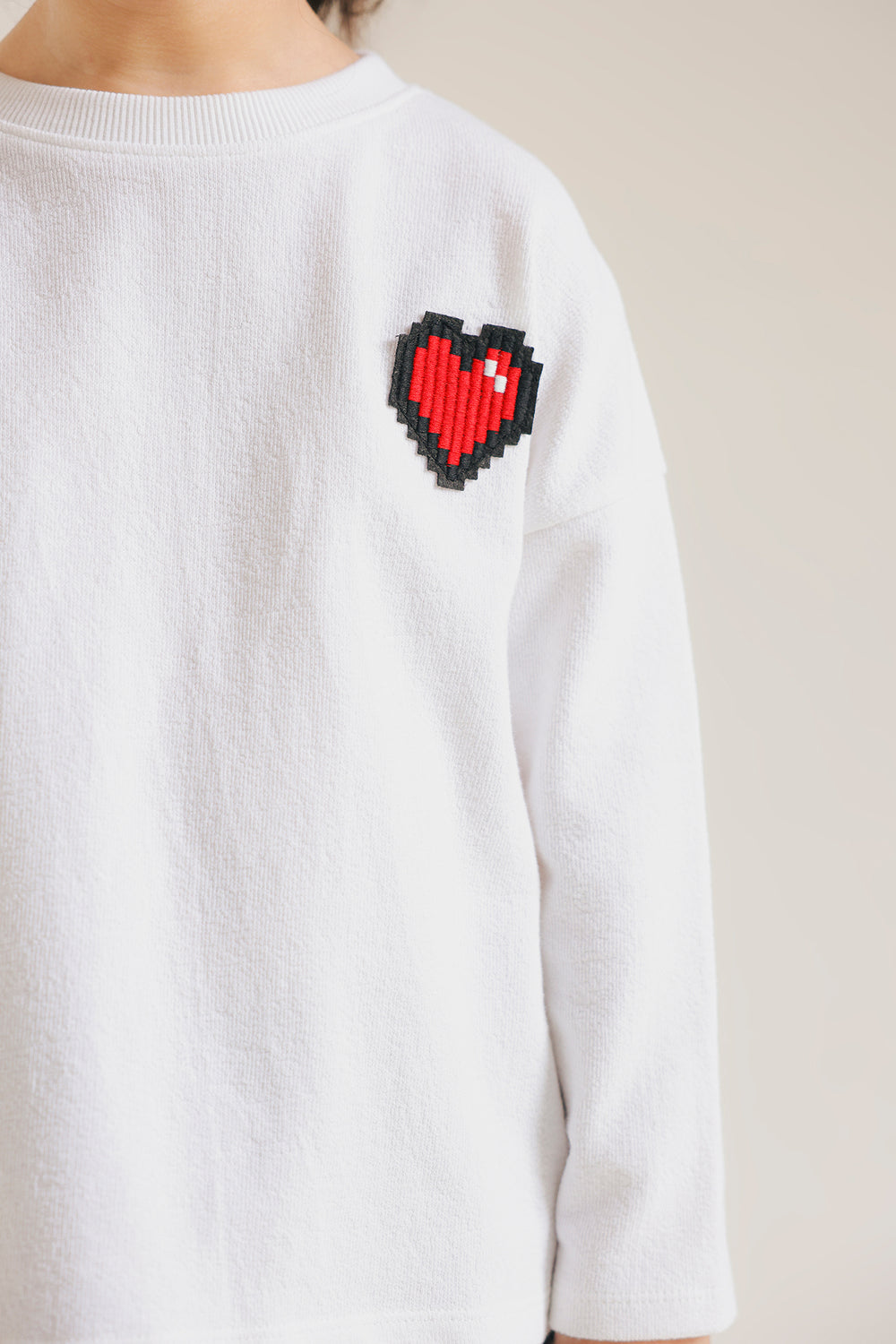 Soft and comfortable white kids' t-shirt featuring a charming heart print on the left side. Designed with full sleeves and a classic round neck for everyday wear. Perfect for layering or wearing on its own, this versatile piece is ideal for active children who love playful, timeless style.