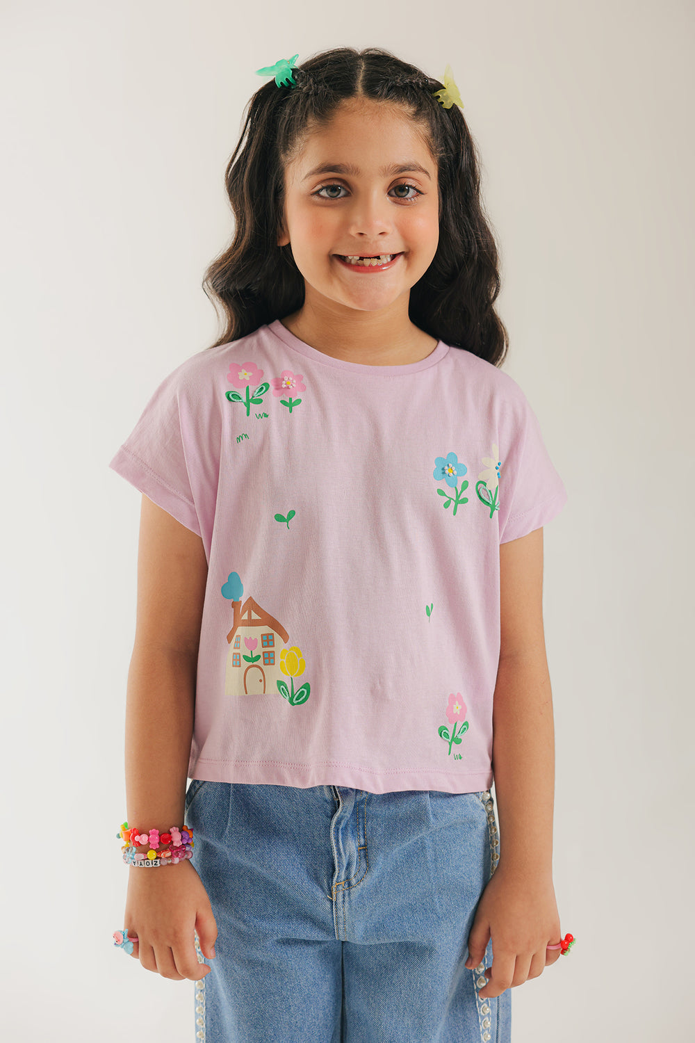 Ignite her imagination with this playful and charming T-shirt. Crafted from a soft, light pink fabric, this tee features adorable hand-painted style graphics that bring a whimsical scene to life. The design includes a cozy little house, colorful flowers in shades of yellow and blue, and various sweet accents. This short-sleeved top is perfect for everyday wear, blending comfort with a unique and artistic flair.