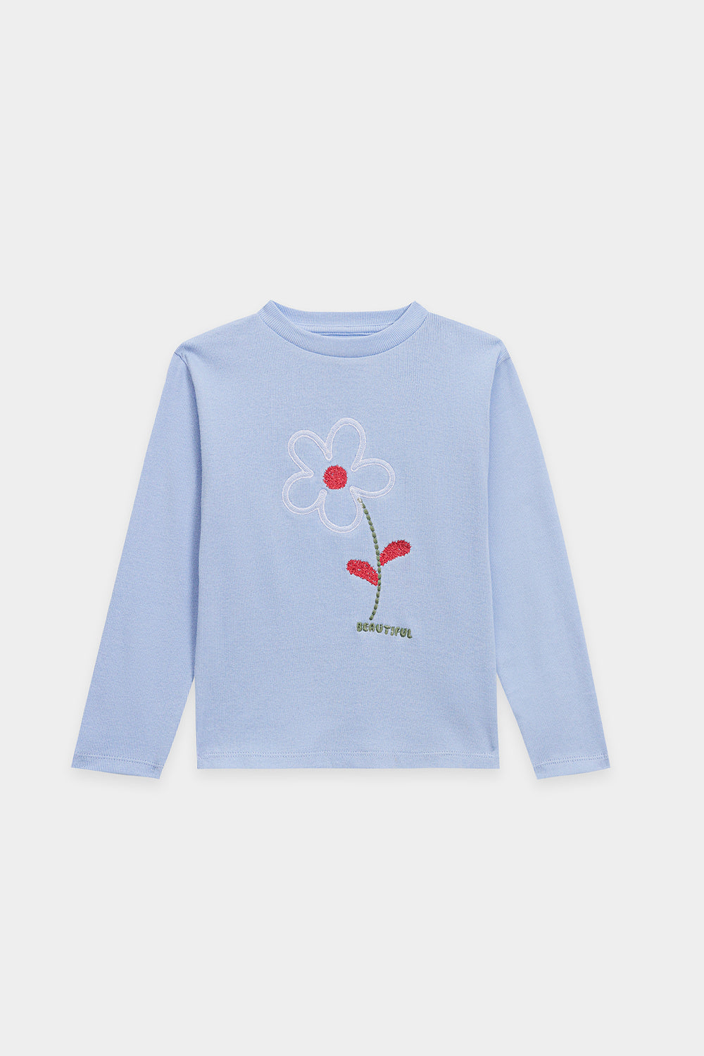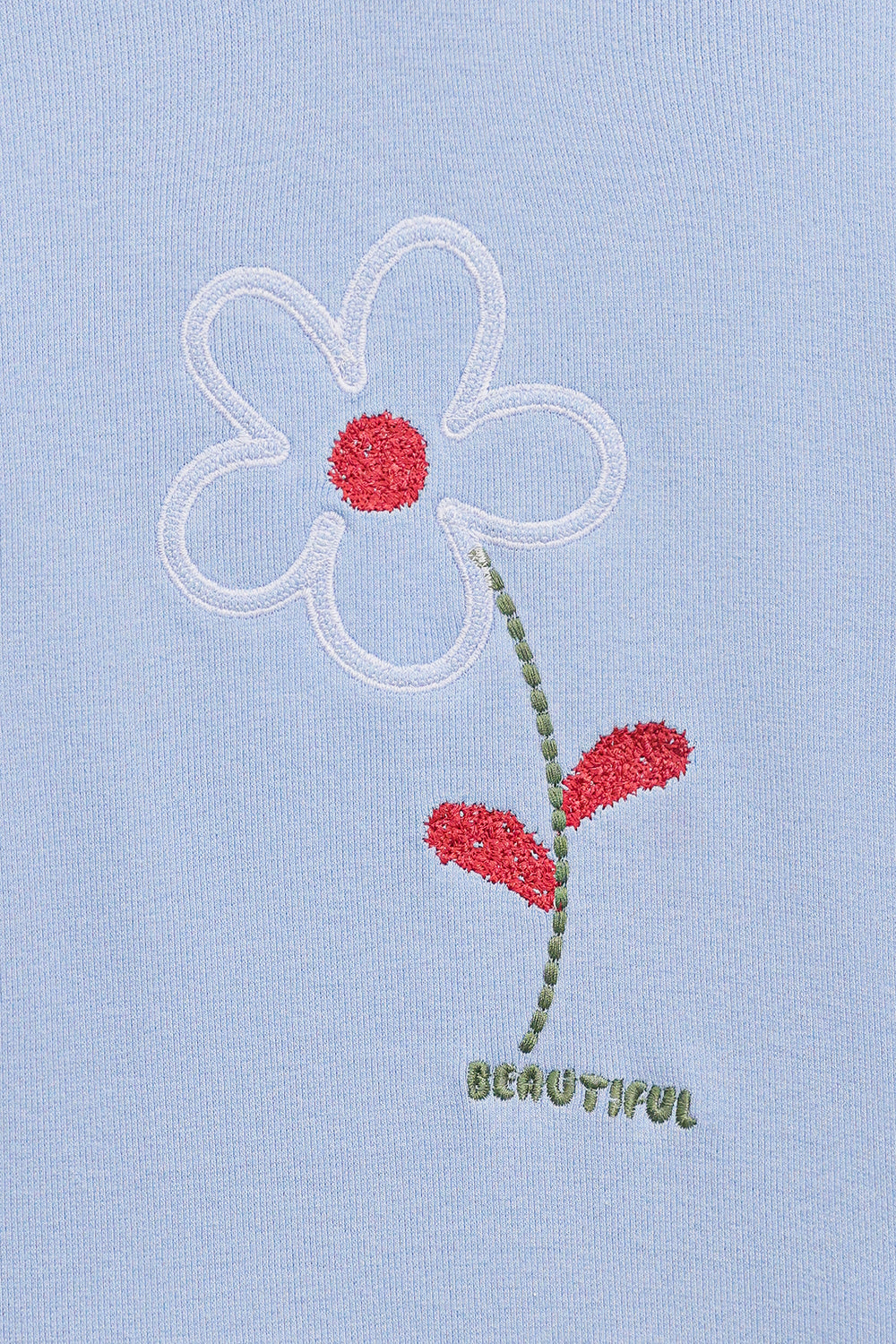 Add a sweet and vibrant touch to your everyday essentials with this lovely top. This comfortable, long-sleeved shirt is crafted in a soft light blue fabric that features a subtle textured finish. The front is adorned with a charming, central embroidered daisy motif. The flower is highlighted with red and pink details, and a subtle embroidered "beautiful" word adds a positive message below the stem. This cheerful top is an easy and stylish way to incorporate a soft pop of color and cute detailing into your casual look.