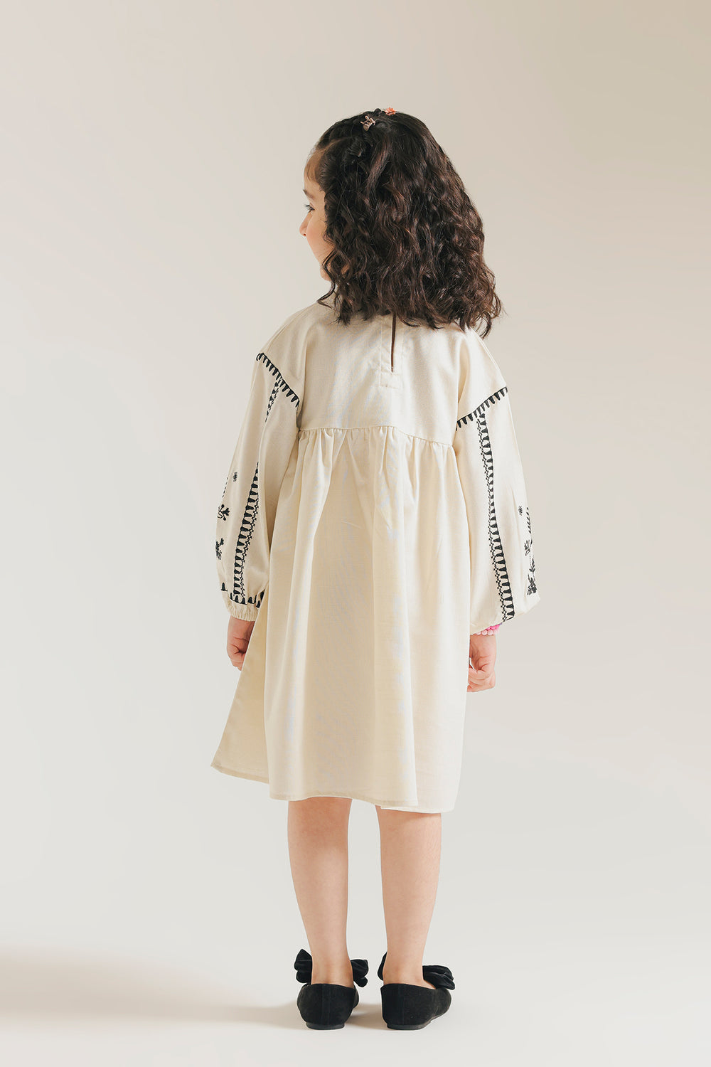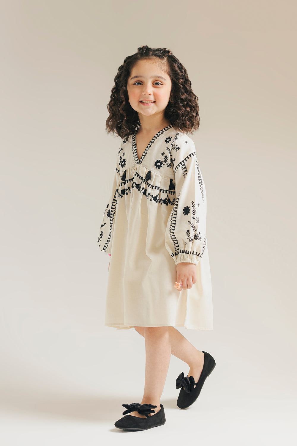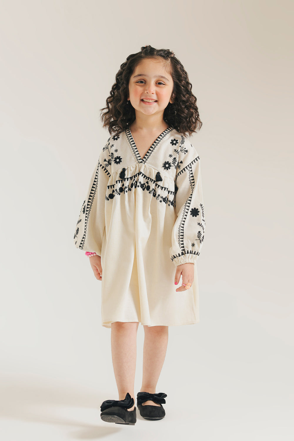 This charming kids' top features a classic V-neck design in soft off-white fabric, elevated by delicate black embroidery detailing. Perfect for everyday wear or special occasions, the embroidered accents add a touch of elegance while keeping the style timeless and versatile. Comfortable and easy to care for, it's an ideal addition to any child's wardrobe.