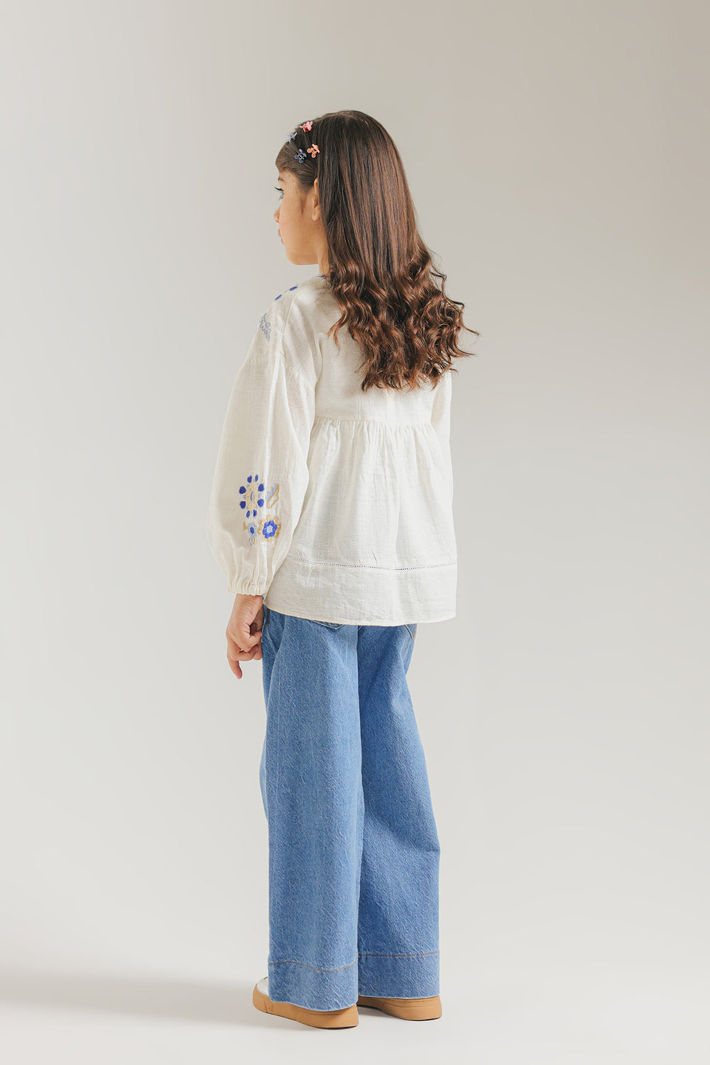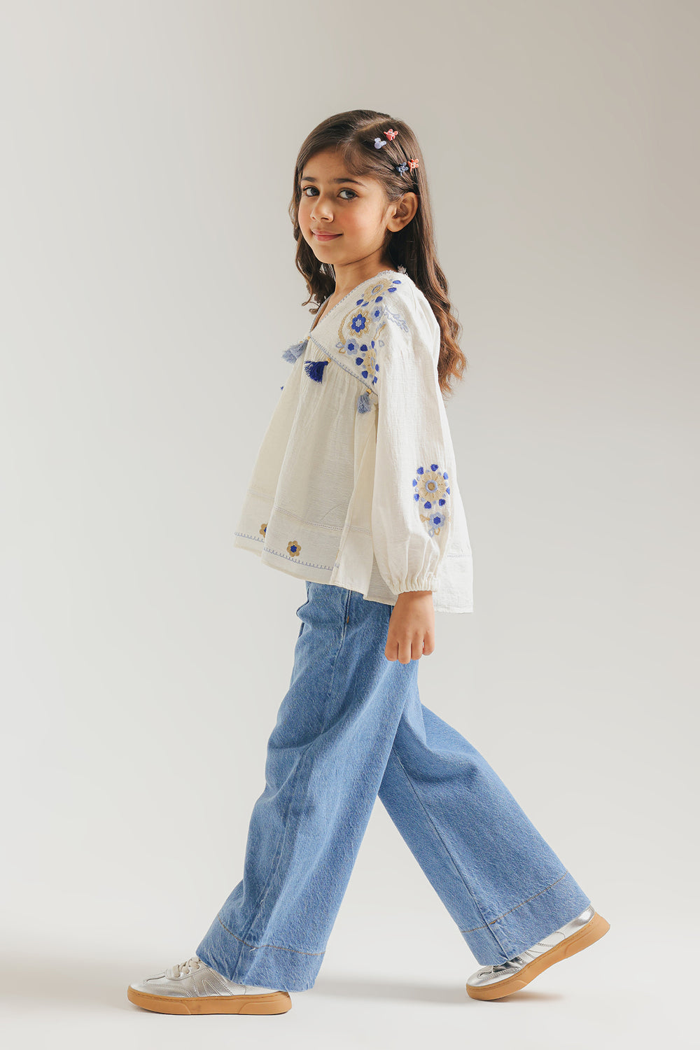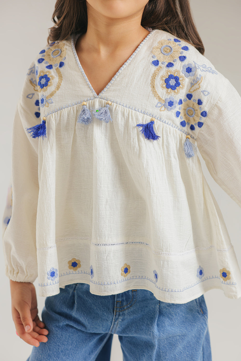 This ethereal white top blends bohemian charm with artisanal detail, featuring a breezy V-neckline accented by playful blue tassels. Intricate azure and gold floral embroidery sweeps across the shoulders and voluminous sleeves, while a flared hem adds whimsical movement. Perfect for sun-drenched days and festive celebrations.