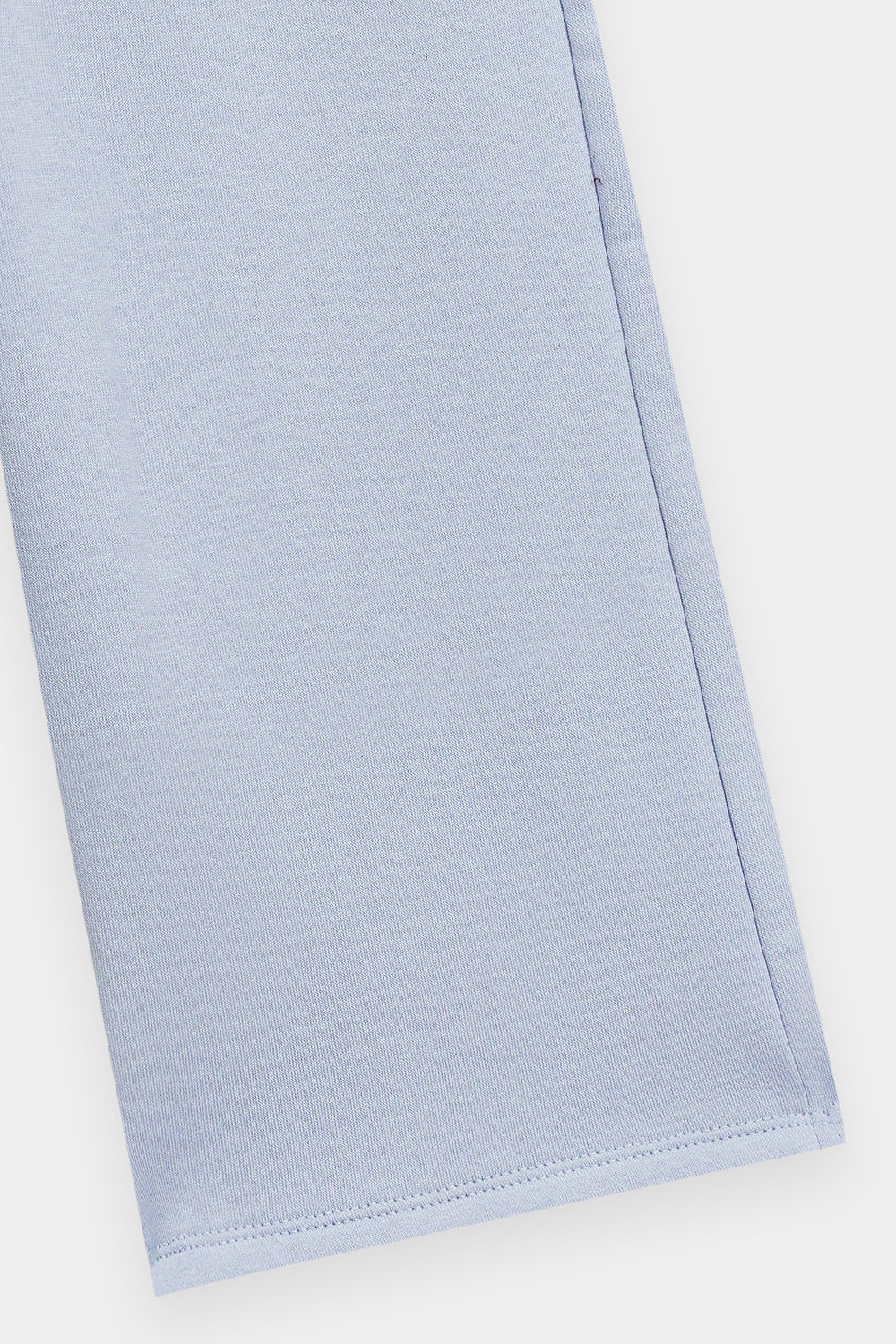 Combine cute styling with ultimate comfort in this playful light blue trouser. This casual, pull-on trouser is crafted from a soft fabric in a gentle periwinkle shade. The chic straight fit silhouette fall to an above-ankle length. A charming detail is the printed bright pink heart with white text, adding a fun, personalized touch.