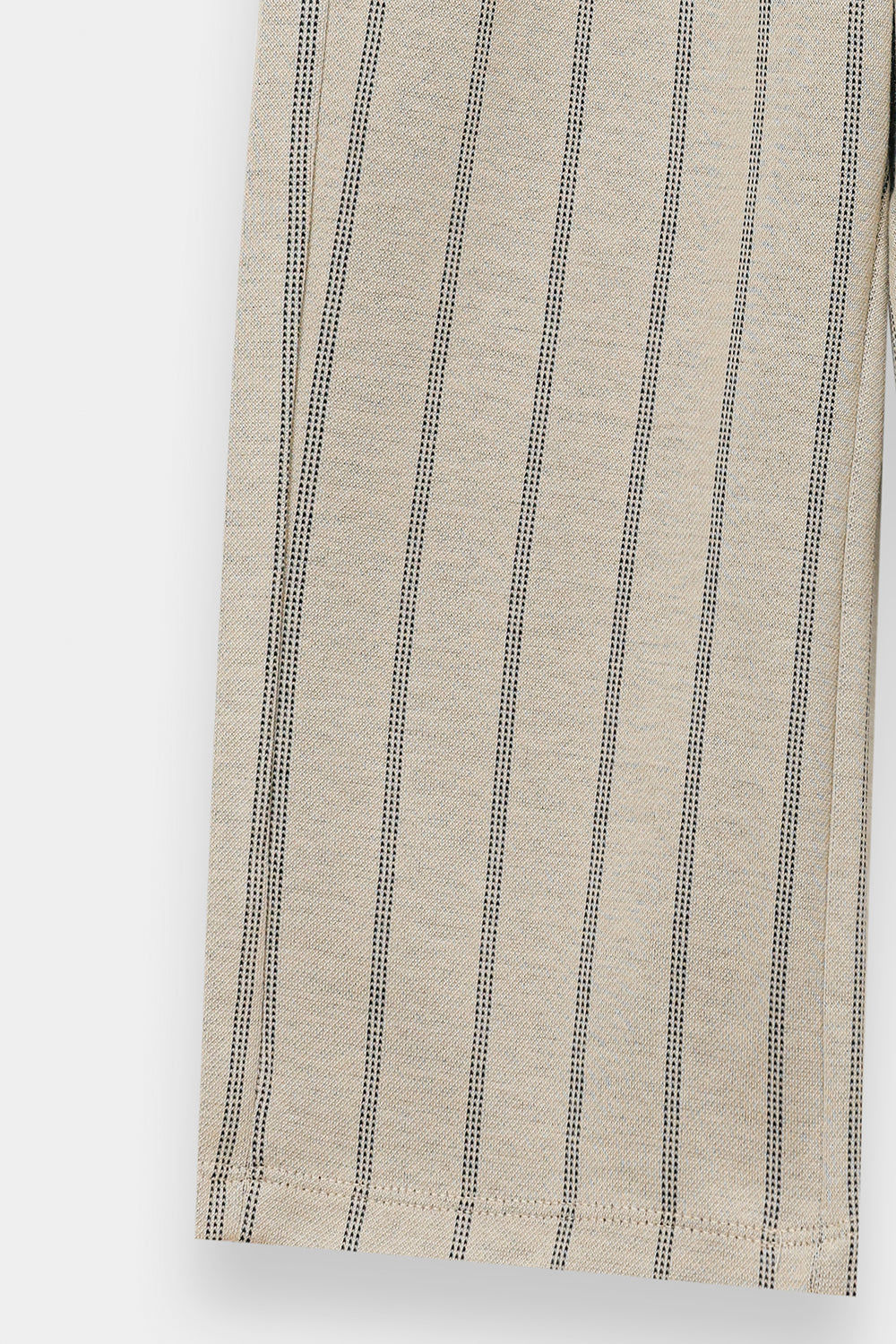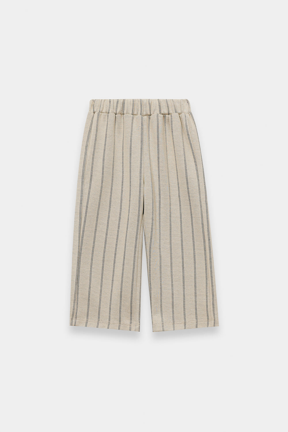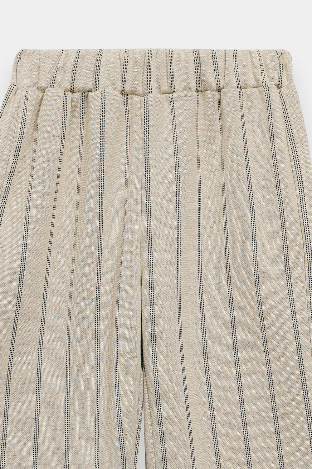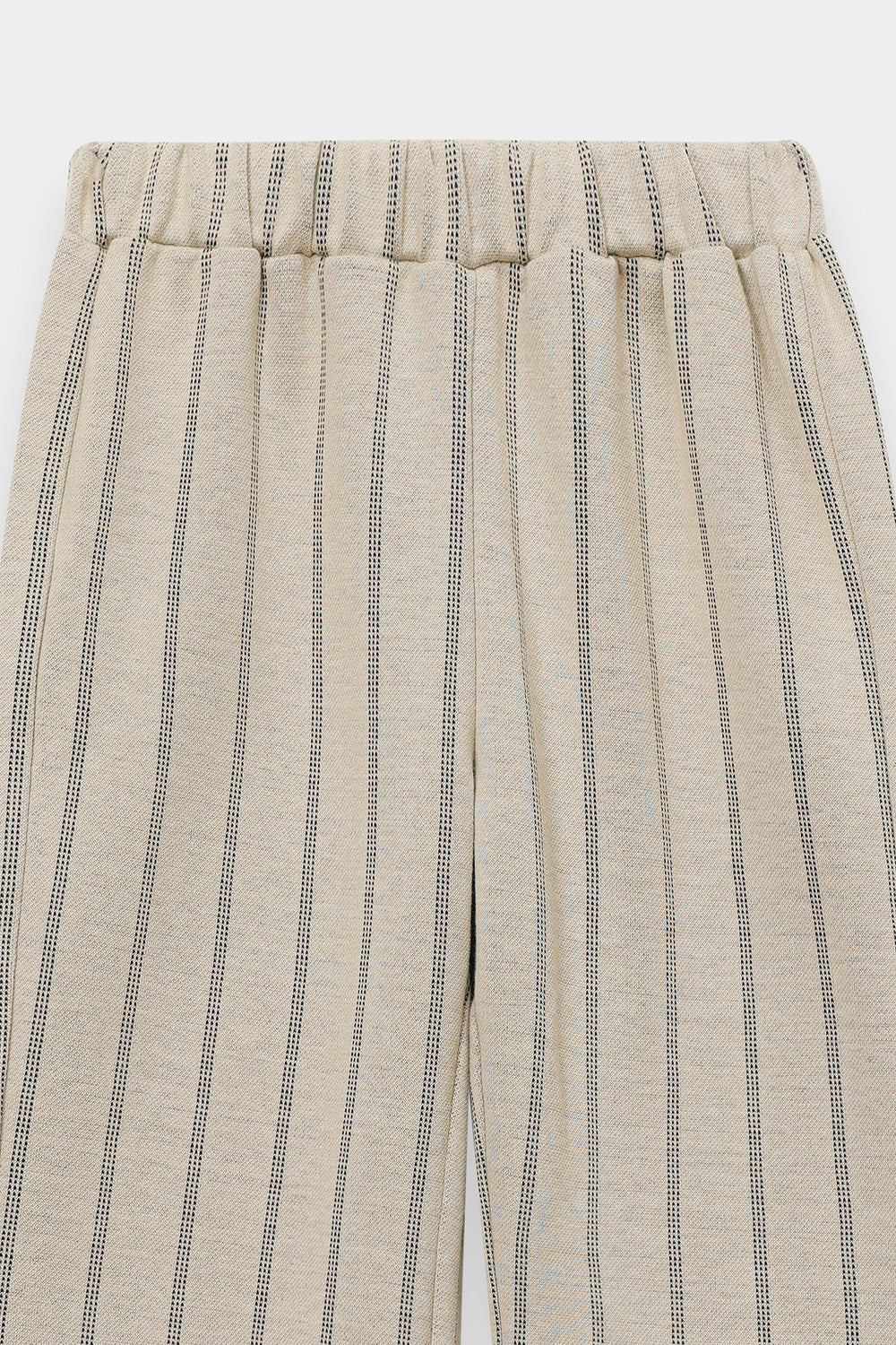 Add a touch of playful sophistication to her wardrobe with these striped relax fit trousers. These essential bottom-wear pieces are crafted from a soft, textured fabric in a versatile cream shade, featuring a vertical wavy-stripe pattern that adds a modern twist to a classic look. The trousers feature a comfortable elasticated waistband and a flattering wide-leg cut that offers exceptional drape and freedom of movement. The clean, flowing lines of this piece make it the perfect versatile base for pairing with vibrant sweatshirts or crisp white tops.