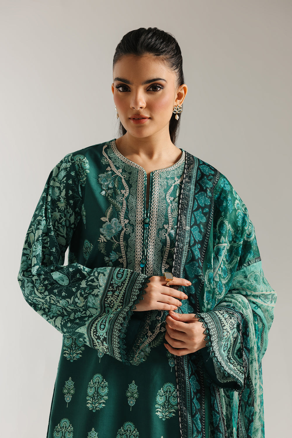 -Embroidered Printed Cotton Slb Shirt 3 Mtr