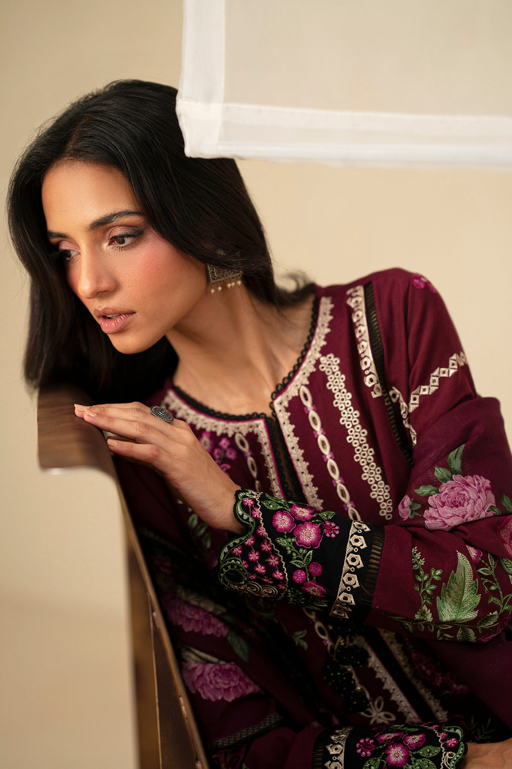 -Embroidered Contrast cambric Sleeve + Hem Border 1 Pc